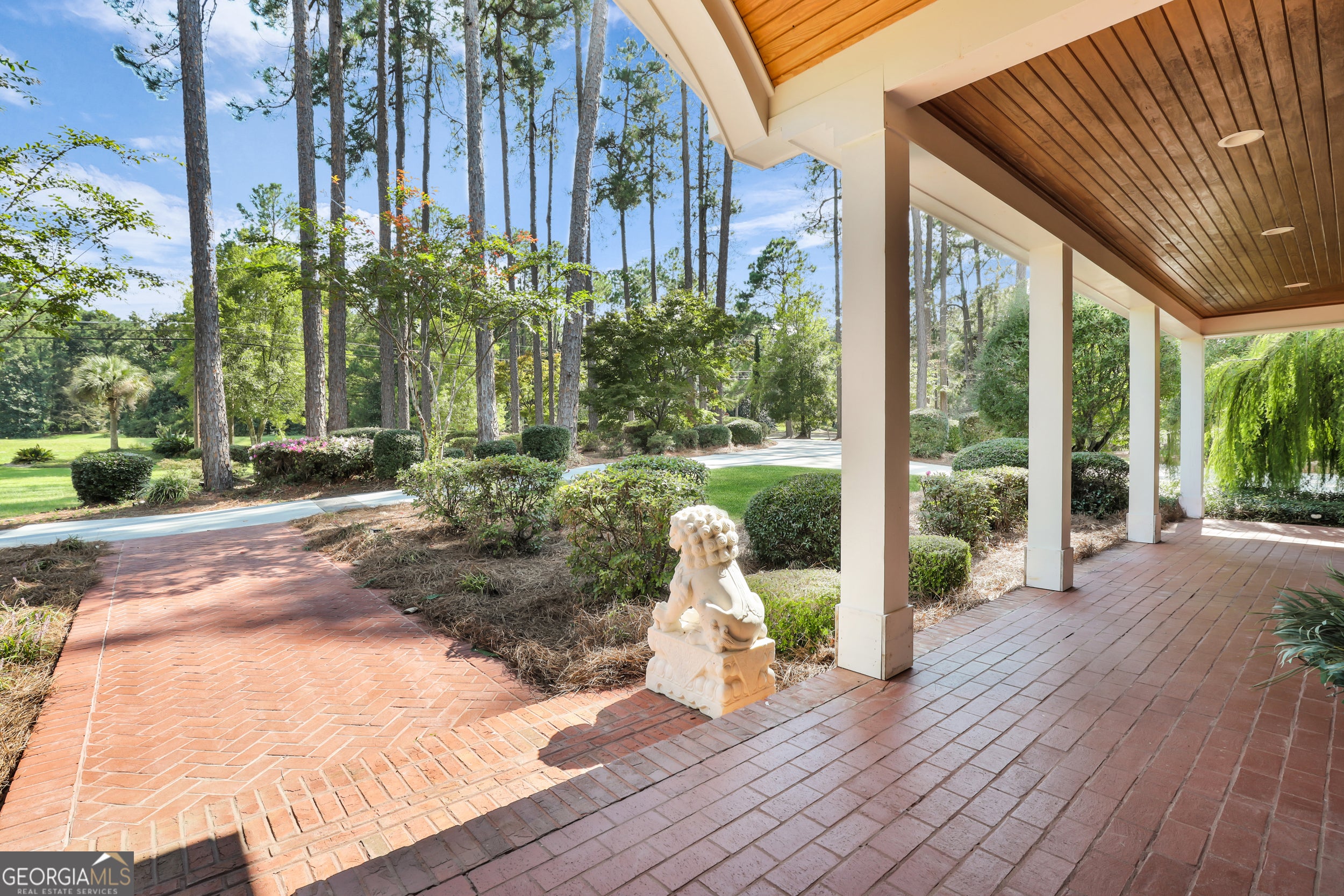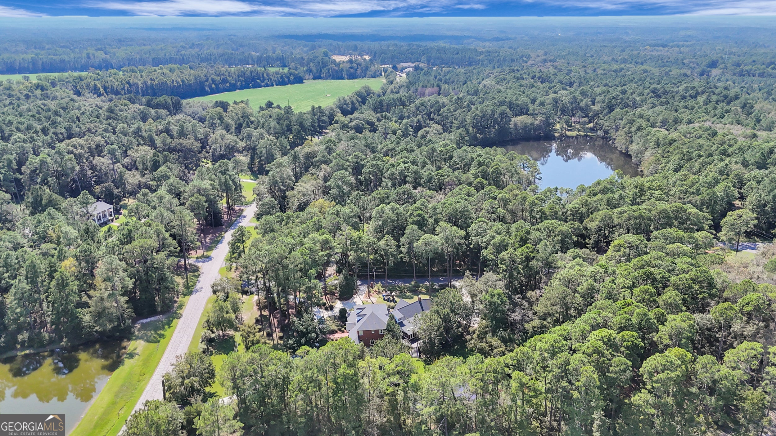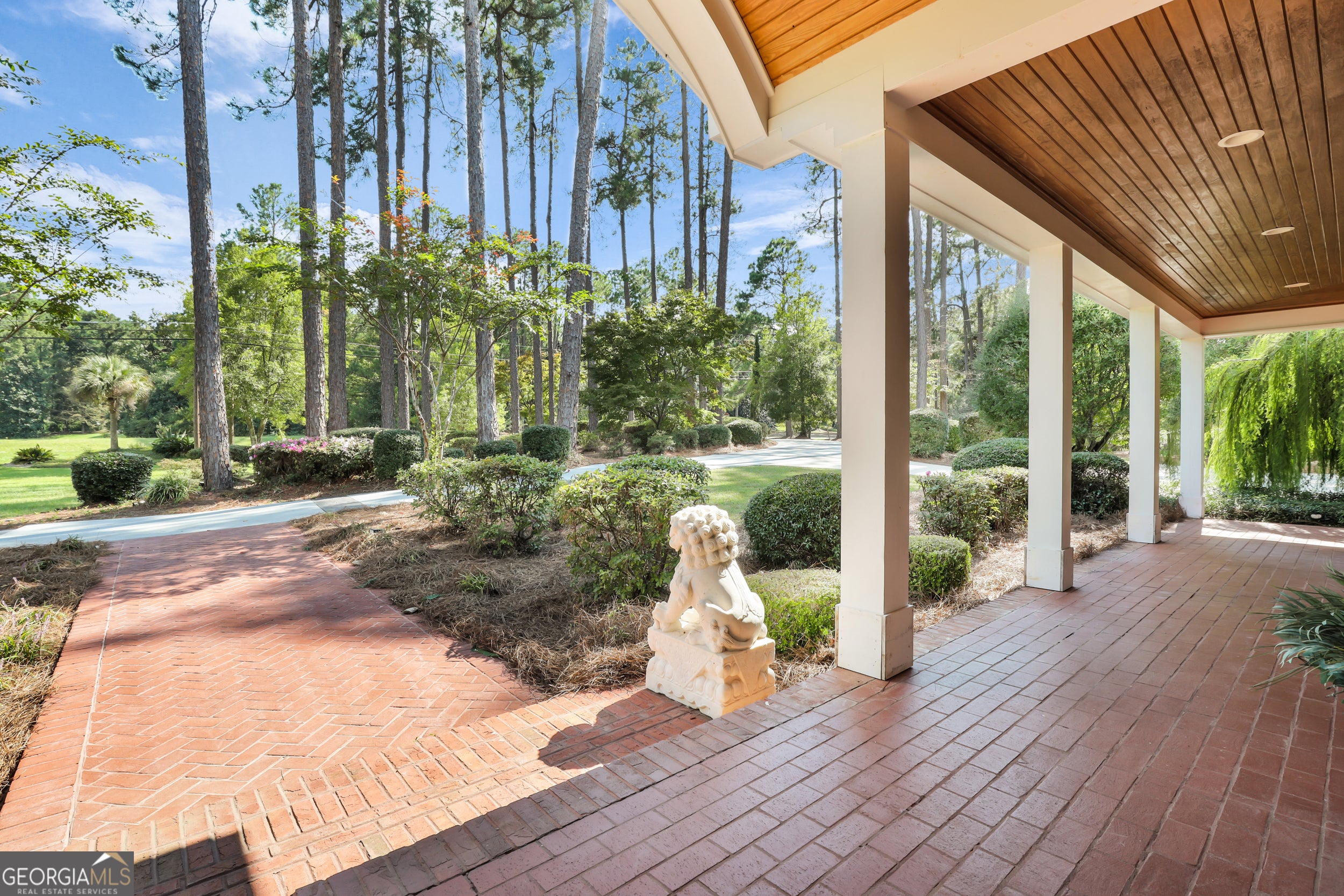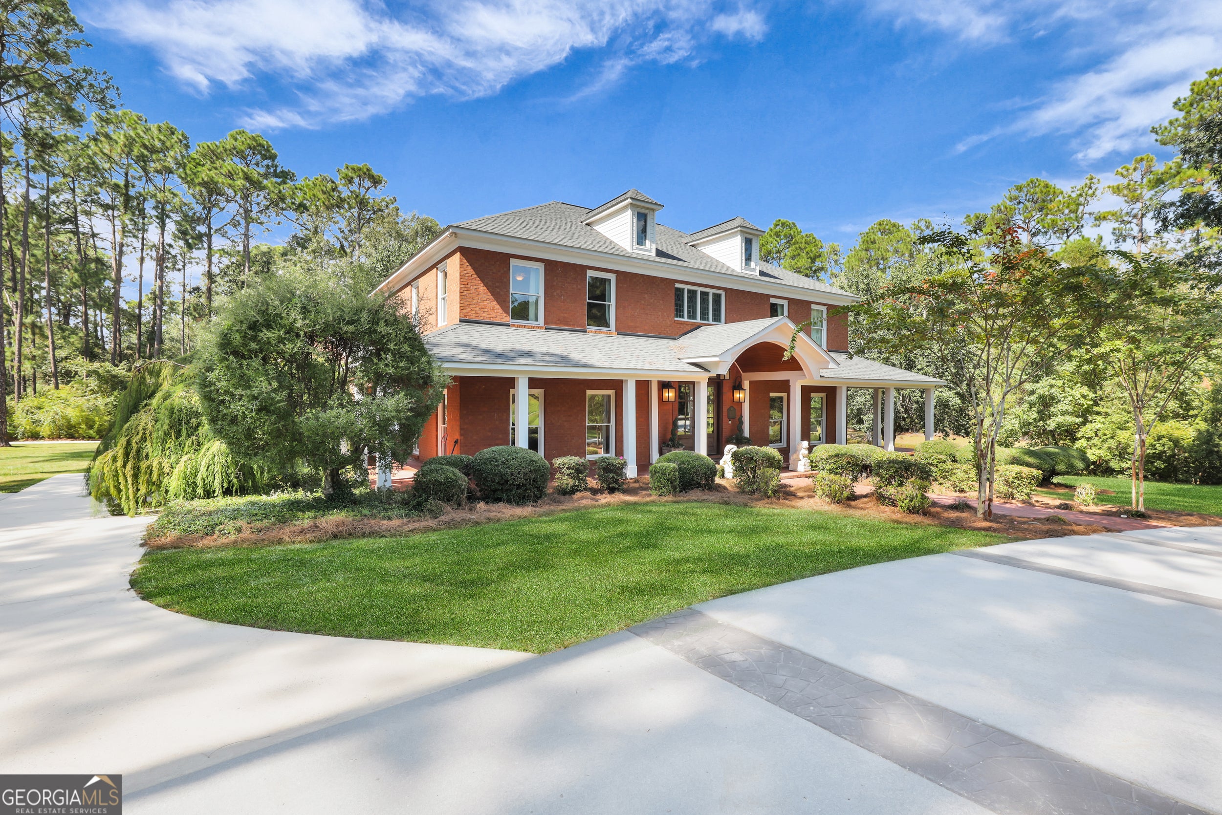 This beautifully crafted all-brick estate located near the Country Club offers luxury living on 2.61 acres with a private pond, creating a peaceful and picturesque setting. A grand two-story foyer welcomes you into the home and opens to elegant living spaces including a formal living room and a spacious dining room that comfortably accommodates 12+ guests, perfect for hosting gatherings. The gourmet kitchen features custom cabinetry, solid surface countertops, stainless steel appliances, and two oversized pantries, eat in kitchen offering both style and exceptional storage. The inviting family room showcases wood ceilings, shiplap walls, and a beautiful masonry fireplace, creating a warm and welcoming space. Just beyond, the large sunroom provides breathtaking views of the private backyard and pond. Outdoor living space is unmatched with approximately 1,500 square feet of porch space, partially covered and complete with a gas fireplace, making it the perfect setting for relaxing evenings or entertaining guests. The primary suite is filled with natural light and offers a spa-inspired bathroom featuring a soaking tub, zero-entry tiled shower, double vanities with marble countertops, and a spacious custom vanity. The well-appointed laundry room includes built-ins, a sink, and a convenient laundry chute from the upstairs bedrooms. Upstairs you'll find four spacious bedrooms, each with its own tiled ensuite bathroom, along with an office overlooking the living room. A bonus room with its own private staircase provides additional flexible living space perfect for a media room, playroom, or guest suite. Thoughtfully designed throughout, this home offers abundant storage and beautifully crafted closets, combining elegance, comfort, and functionality in a truly exceptional property. Call to schedule your private showing.