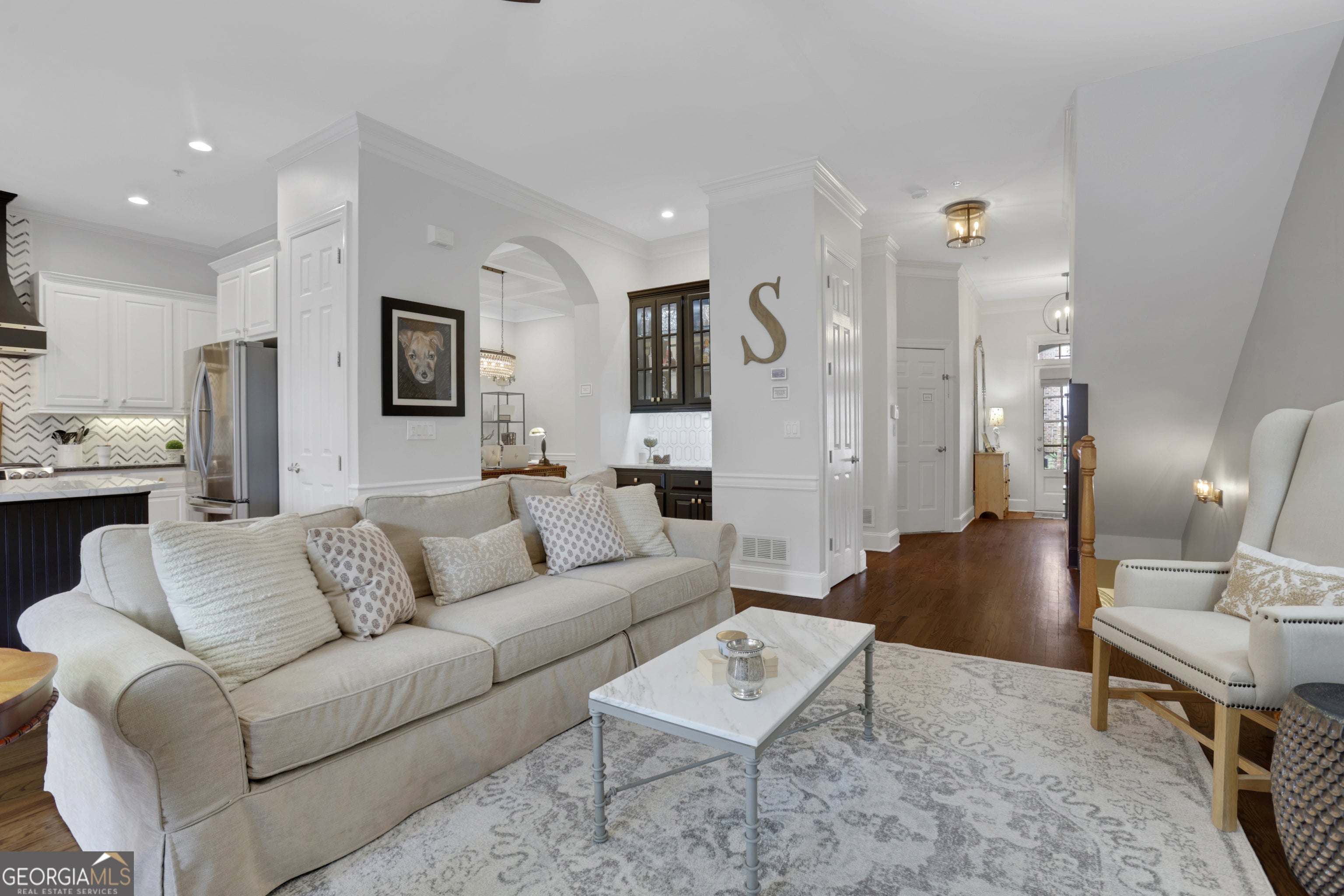 Renovated and thoughtfully designed, this Academy Park townhome offers the perfect blend of luxury, function, and a coveted lifestyle just minutes from Avalon and Downtown Alpharetta. Set on one of the community's best lots, the home boasts serene creek views from not one but two private outdoor living areas. The main level features a bright family room with a fireplace that flows seamlessly to a new deck with Trex decking, a gas line for grilling or a firepit, and a stunning wooded view. The renovated kitchen is a true centerpiece of the home with a quartzite island with a farm sink and a breakfast bar. The white cabinets are complimented by the stunning vent hood over the gas range, the leathered granite countertops and new backsplash. A dining room (currently used as an office), updated half bath, and a garage with added storage complete the main level. Upstairs, the spacious primary suite includes a cozy sitting area, a walk-in closet, and a luxurious bath with a jetted tub, walk-in shower, and white cabinetry. A second bedroom has an ensuite bath and a walk-in closet. The alcove at the end of the hall, ideal for a home office or guest nook, provides excellent versatility. The terrace level suite is a showstopper, featuring a wide-open living space with a second fireplace, a third full bath, a walk-in closet, and an entertainment bar complete with a beverage refrigerator, a sink, an ice maker, and a marble countertop. Thoughtful additions like dual trash pull-outs and in-cabinet corner storage make it as functional for entertaining as it is beautiful. This space was designed to be used as a guest suite, but if more privacy is desired, add a wall or pocket doors to create a separate bedroom. A covered porch with a waterproof under decking system and teak flooring offers a second outdoor living area overlooking the creek. Additional highlights include new lighting and updates throughout this stunning home, hardwood flooring added upstairs, and abundant storage. Academy Park is a gated community offering resort-style amenities - a clubhouse, an updated fitness center, a pool, tennis and pickleball courts, an onsite property manager, private trails with creek bridges and a direct exit to the Alpha Loop, Avalon and downtown Alpharetta. This home combines comfort, luxury, and location in one remarkable package.