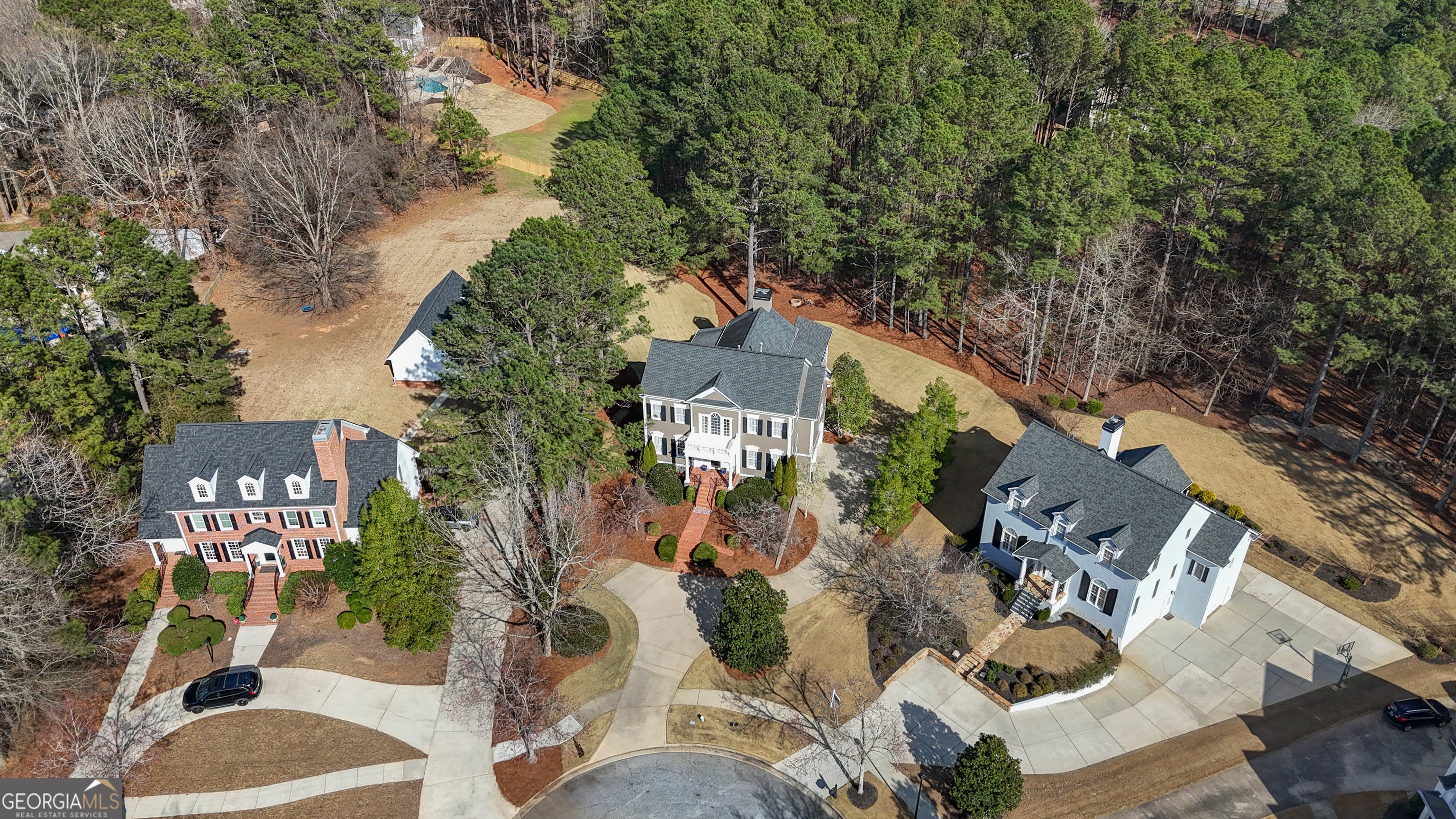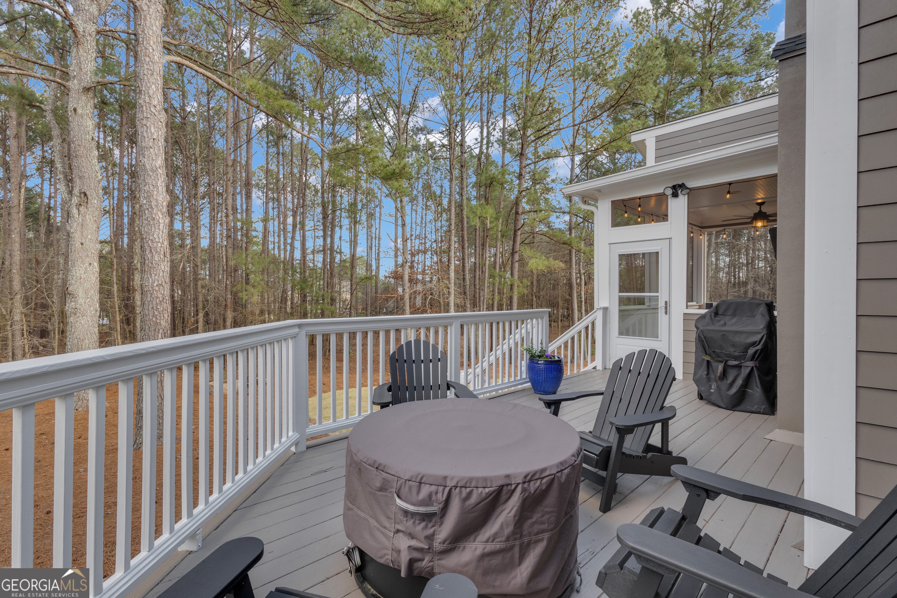 Perched at the end of a quiet cul-de-sac in sought-after Highgrove, this Stately Southern traditional rises with grace and presence. Set beautifully on 1.2 private acres that extends past the tree line. The timeless architecture creates an unforgettable first impression, the kind that feels both welcoming and refined. Step through the front door and into a soaring two story foyer where hardwood floors gleam beneath natural light streaming through transom windows. The formal dining room stands ready for candlelit dinners and holiday gatherings, offering an elegant prelude to the heart of the home. The kitchen unfolds as a warm and inviting centerpiece. A striking contrasting island anchors the space, complete with gas cooktop, rich wood cabinetry, and stainless-steel appliances. Just beyond, a cozy fireside keeping area with its own gas fireplace invites slow Saturday mornings, homework sessions, and late-night conversations. Designed for effortless entertaining, this space flows seamlessly into the vaulted family room where a second gas fireplace is framed by custom built ins and crowned with arched windows that bathe the room in natural light. A sunroom just off the family room offers peaceful views year-round and leads gracefully to a screened porch and grilling deck, extending your living space outdoors. Here, evenings settle gently over the trees, and weekends revolve around relaxed gatherings under the Georgia sky. The primary suite on the main level is a true retreat, offering privacy and comfort with an en suite bath featuring double vanities, a soaking tub, and separate shower. The oversized custom closet connects directly to the spacious laundry room, a thoughtful detail that simplifies daily living. A dedicated home office on the main level provides flexibility for work, study, or creative pursuits. Upstairs, three generously sized bedrooms each enjoy direct access to a full bath, ensuring comfort and privacy for family and guests. A versatile loft area offers additional living space ideal for a reading nook, media lounge, or playroom. Did I mention a 2nd office space? The terrace level expands the lifestyle even further with abundant entertainment space, a full bath, and an impressive home gym. Storage is plentiful, keeping seasonal decor and recreational gear neatly tucked away. Car enthusiasts and hobbyists will appreciate the oversized 3 car garage measuring over 1,000 square feet, complete with a 240v 40 amp EV charger that conveys. The home offers 5,713 total square feet per tax record. The septic field was fully replaced and doubled in size in 2023, upstairs furnace 2024, new exterior paint 2024, and the roof is approximately 9 years old, offering peace of mind for years to come. Wifi Controlled landscape lighting and sprinklers to show off the beautiful Zoysia lawn. Life in Highgrove is as exceptional as the home itself. Residents enjoy a clubhouse, swimming pool with swim team, tennis and pickleball courts, basketball, playgrounds, and scenic walking trails. Located in the highly acclaimed Starr's Mill school district and connected to over 100 miles of Peachtree City golf cart paths, the community offers a lifestyle unlike any other. Just minutes from The Avenue's boutiques and dining, Trilith Studios, Lake Peachtree, and premier golf courses, with convenient access to Piedmont Hospital and Hartsfield Jackson Airport. With the future U.S. Soccer Federation Headquarters nearby, this location is truly unmatched. This is more than a home. It is a setting for memories, milestones, and a beautifully lived life.