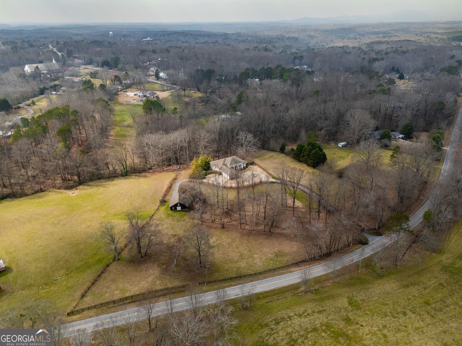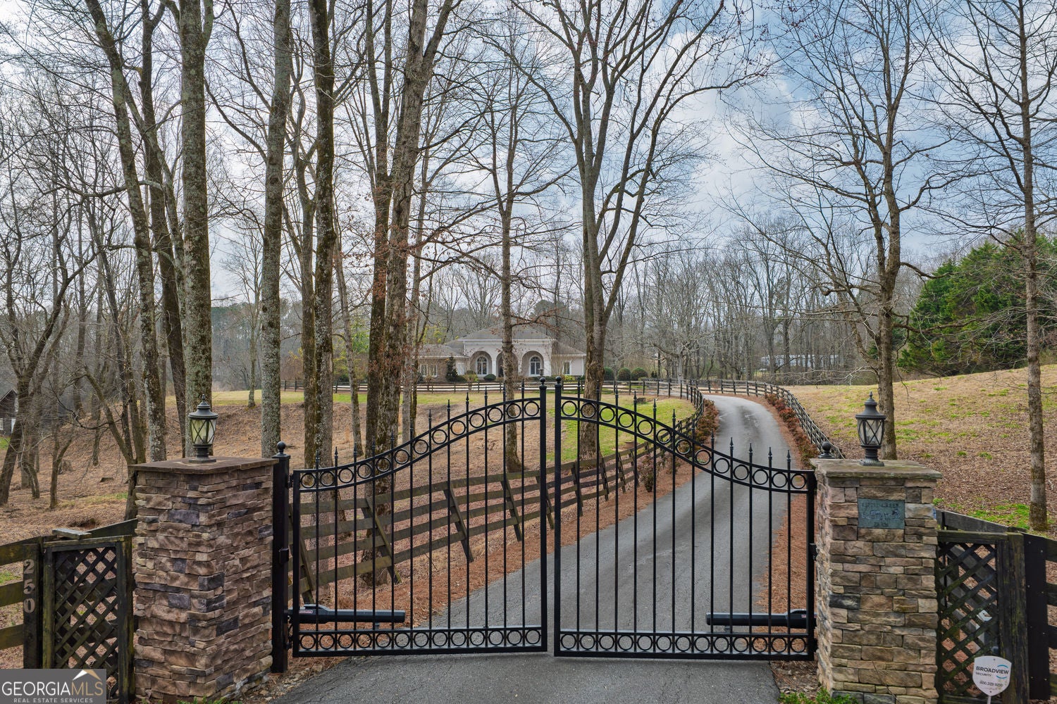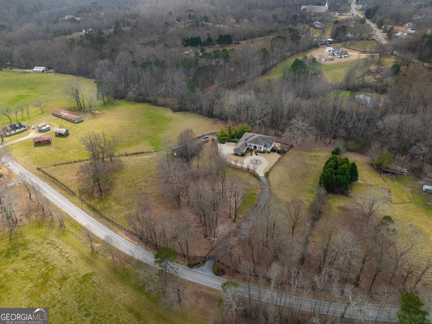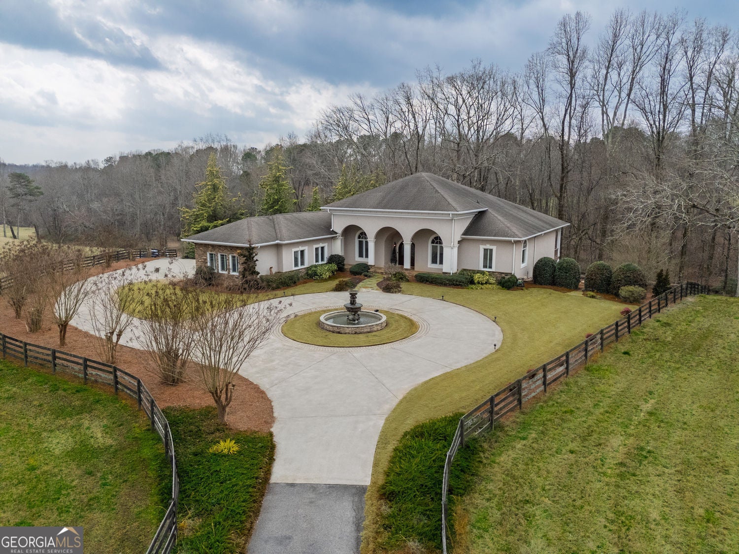 Welcome to your dream home! Nestled behind private gates on 5 serene acres with classic corral-style fencing, this stunning Mediterranean-style estate offers luxury, privacy, and exceptional functionality just minutes from Downtown Dawsonville and GA 400. A wraparound driveway creates a grand approach, highlighted by an elegant stacked-stone tiered fountain centerpiece. Step inside to a grand foyer that sets the tone for the home, leading to a private office with glass French doors and an elegant formal dining room with a coffered ceiling that comfortably accommodates seating for twelve. The main living areas feature soaring 15-foot ceilings and rich Brazilian hardwood floors throughout. The gourmet kitchen, complete with a Sub-Zero-style refrigerator, overlooks the expansive great room-creating an ideal space for both everyday living and entertaining. A separate sitting room with a fireplace offers a warm and inviting place to relax. The main-level primary suite serves as a private retreat, featuring direct access to the rear deck, a spa-inspired bathroom, and two oversized California-style walk-in closets. Two additional ensuite bedrooms are also located on the main level, providing comfort and privacy for family or guests. A Generac whole-house generator provides added peace of mind. The oversized three-car attached garage connects seamlessly to a fully functional mudroom and laundry room for everyday convenience. A large rear deck spans the length of the home and includes dedicated grilling and sitting areas for effortless outdoor living. Designed for entertaining, the walk-out terrace level features high ceilings, a full bar/kitchen, pool room, massive recreation and great room areas, and a spacious ensuite bedroom. Additional spaces include an exercise room, large office (or potential additional bedroom), utility room, second laundry room, low-voltage media center, and an expansive workshop. Step outside to enjoy the flagstone sitting area and fire pit-perfect for evenings under the stars. Equestrian enthusiasts will appreciate the separate, fully functioning three-stall horse barn complete with tack room and corral area. The property's corral-style fencing and open layout create an ideal setting for horses while maintaining the beauty and privacy of the estate. A rare opportunity to own a private estate that blends refined living, equestrian amenities, and everyday convenience in one exceptional property.