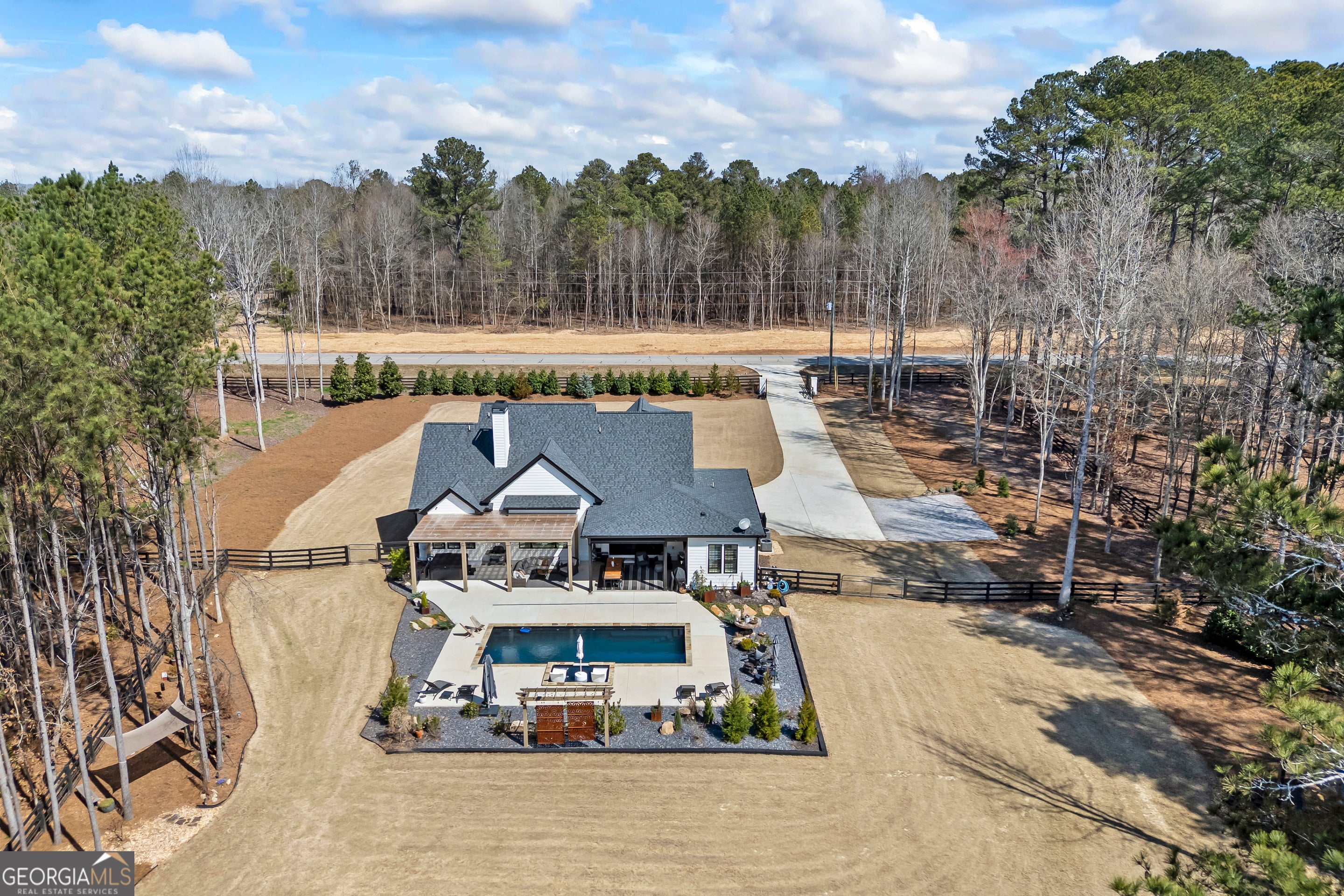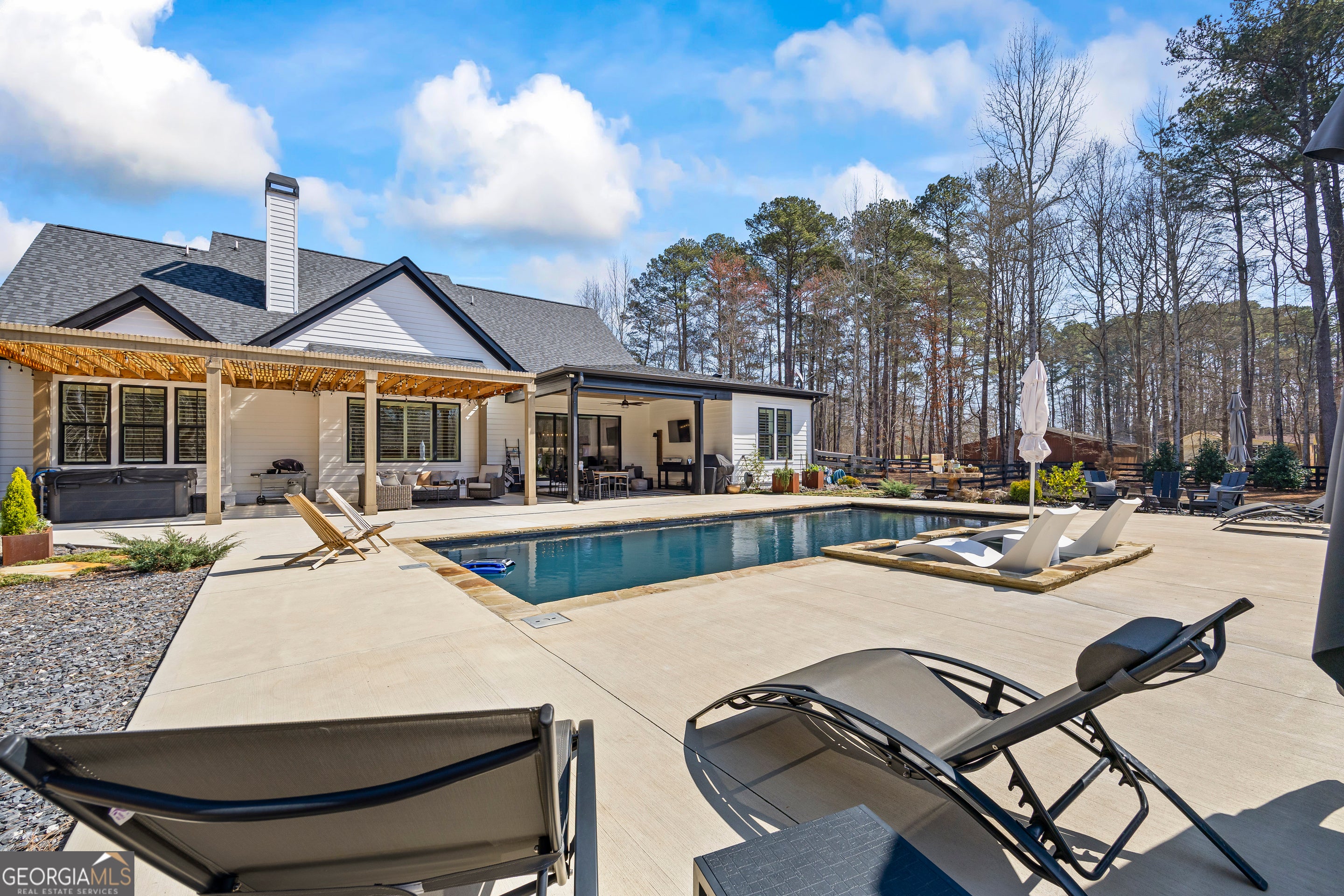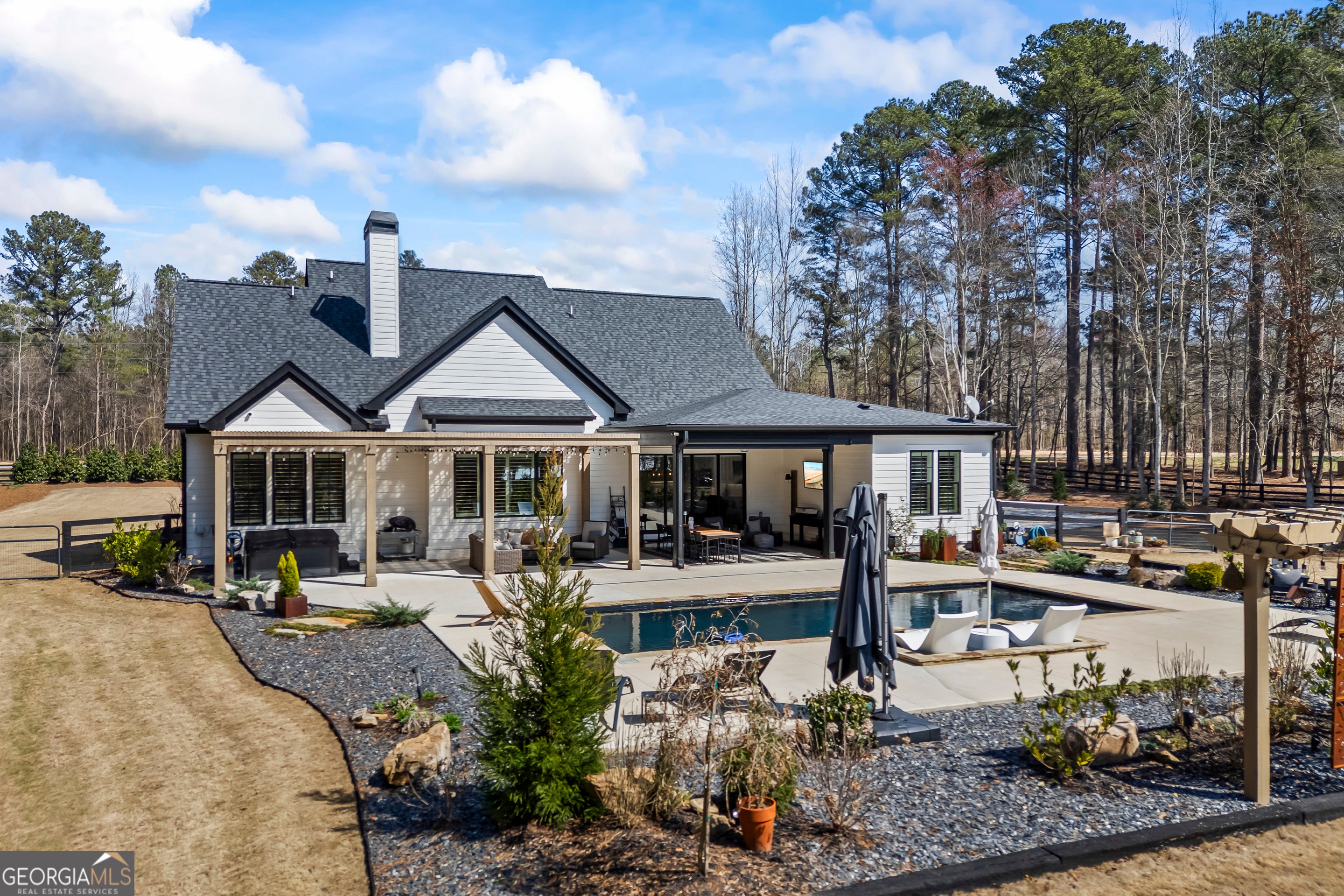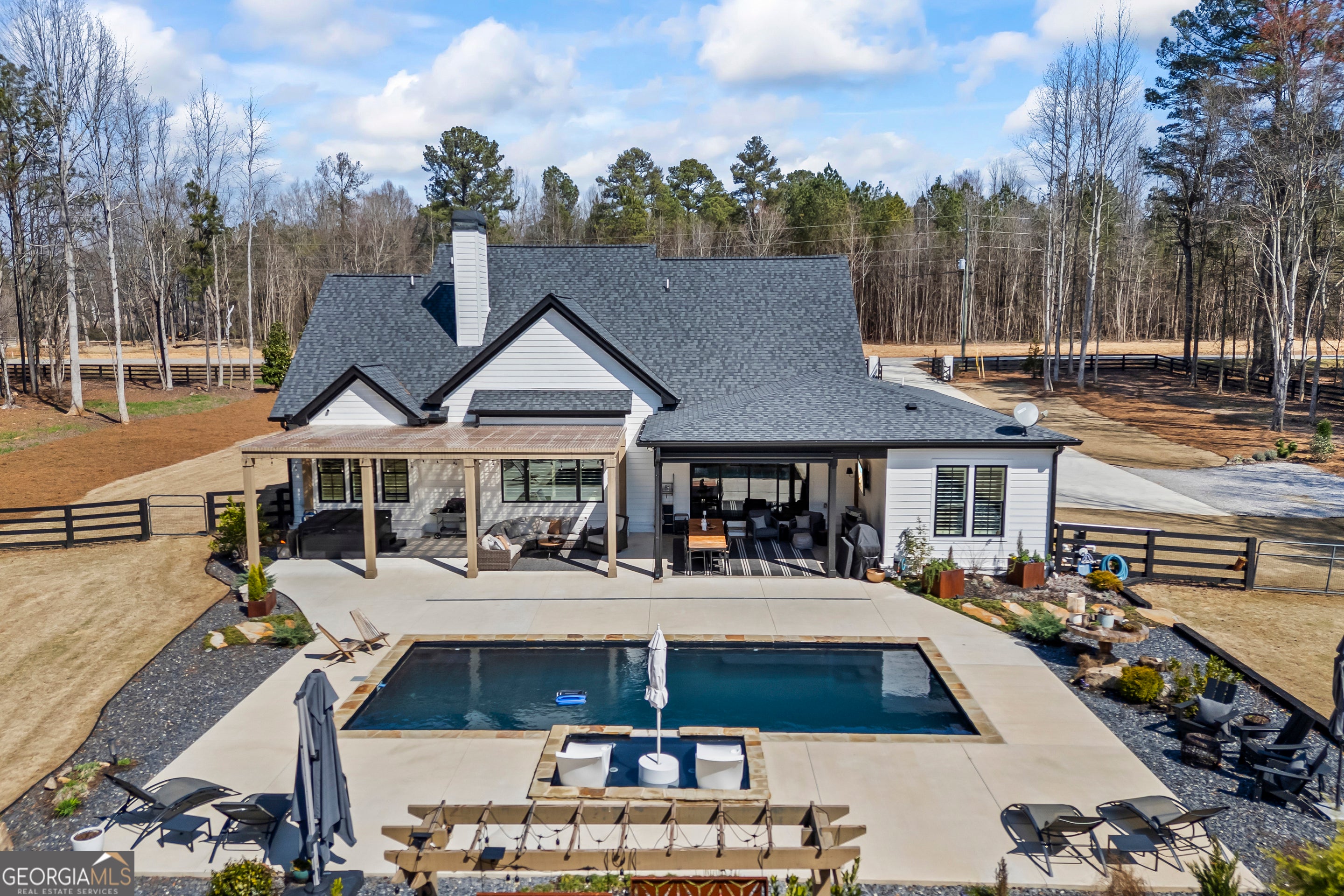 Situated on 2 acres, this better-than-new modern farmhouse with a saltwater pool is a rare opportunity in the North Oconee School District. From the gated entry, the white brick facade with striking black accents welcomes you to a charming front porch featuring a tongue-and-groove ceiling, stone flooring, and custom wood headers and columns. A showstopping full-glass 5' pivot front door sets the tone as you step into the foyer. Luxury plank flooring and plantation shutters extend throughout the entire home. Designed with entertaining and comfort in mind, the open-concept living room features coffered ceilings with tongue-and-groove detailing and a dramatic floor-to-ceiling brick fireplace flanked by built-in bookcases. Adjacent to the living room, the gourmet kitchen is a true showpiece, boasting a large island with waterfall quartz countertops, ZLINE stainless steel appliances, tile backsplash, large basin sink, and a spacious walk-in pantry. The dining area offers ample space for gatherings and features a multi-slide patio door leading to the covered outdoor living area. The owner's suite is a luxurious main-level retreat featuring a tray ceiling, stylish accent wall, expansive custom walk-in closet, and a spa-like en-suite bath with dual vanities, a tiled shower, and a freestanding soaking tub. The laundry room, complete with built-in cabinetry and a utility sink, is conveniently accessible from both the owner's suite and the hallway. A secondary bedroom and full bathroom are also located on the main floor. Upstairs you'll find a bedroom with its own en-suite bathroom, another secondary bedroom, a bonus room or fifth bedroom, and an additional full bathroom. Outdoor living is just as impressive, with an extended covered patio overlooking the stunning in-ground saltwater pool with sundeck and powered shades. A covered pergola fire pit area sits beside the pool house, which is fully finished with power, a mini-split system, and a custom full-glass garage door, perfect for enjoying football nights by the fire. The pool house also includes a convenient storage room. Additional features include a three-car garage, an extended parking pad, a fully fenced property with the front yard partitioned from the backyard, and a sprinkler system that covers the entire yard. The upgraded landscaping and outdoor lighting create a breathtaking setting, especially at night. This one-of-a-kind property combines private, upscale living while remaining within easy reach of Monroe, Athens, and Watkinsville for shopping, dining, and entertainment.