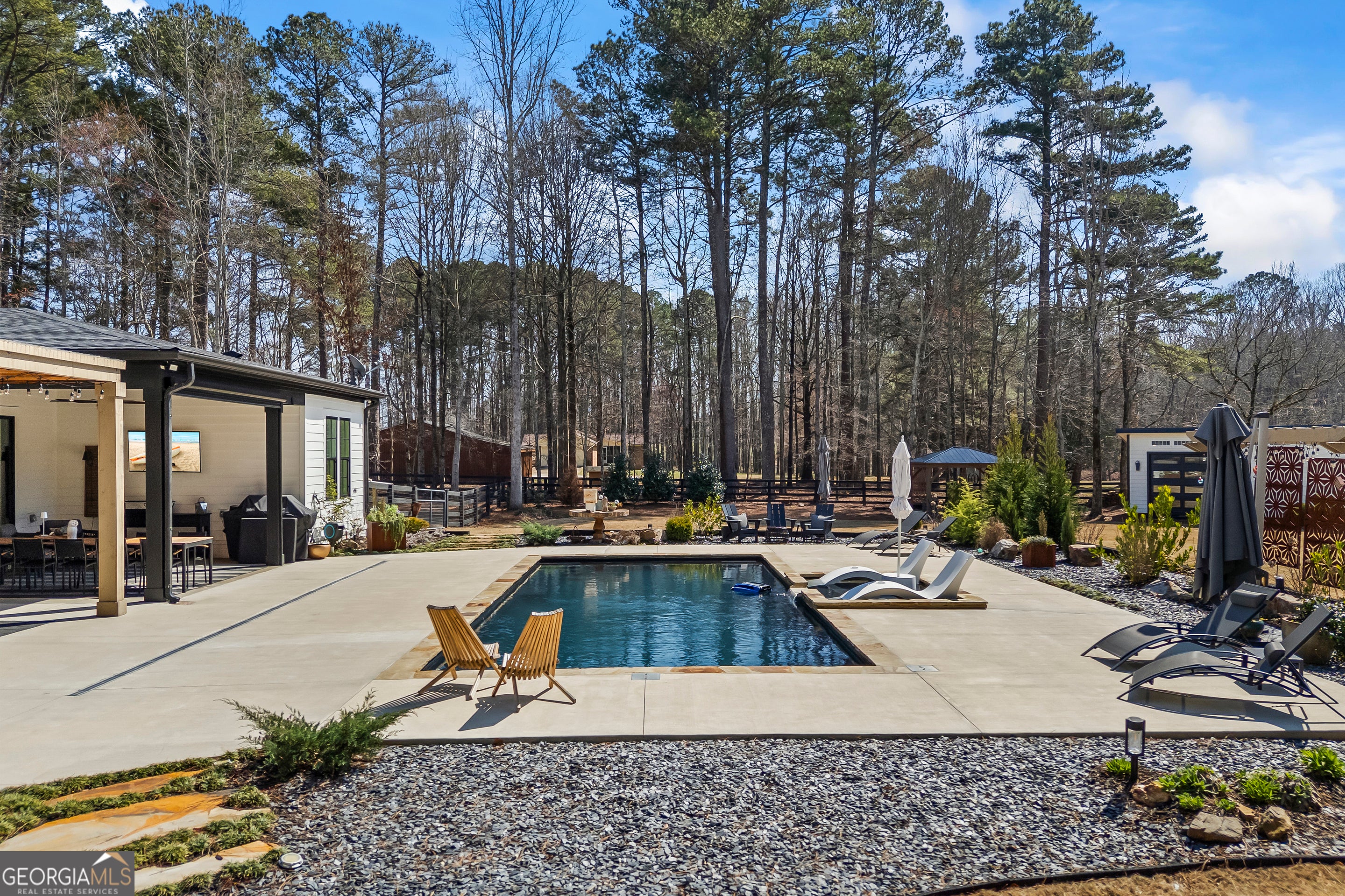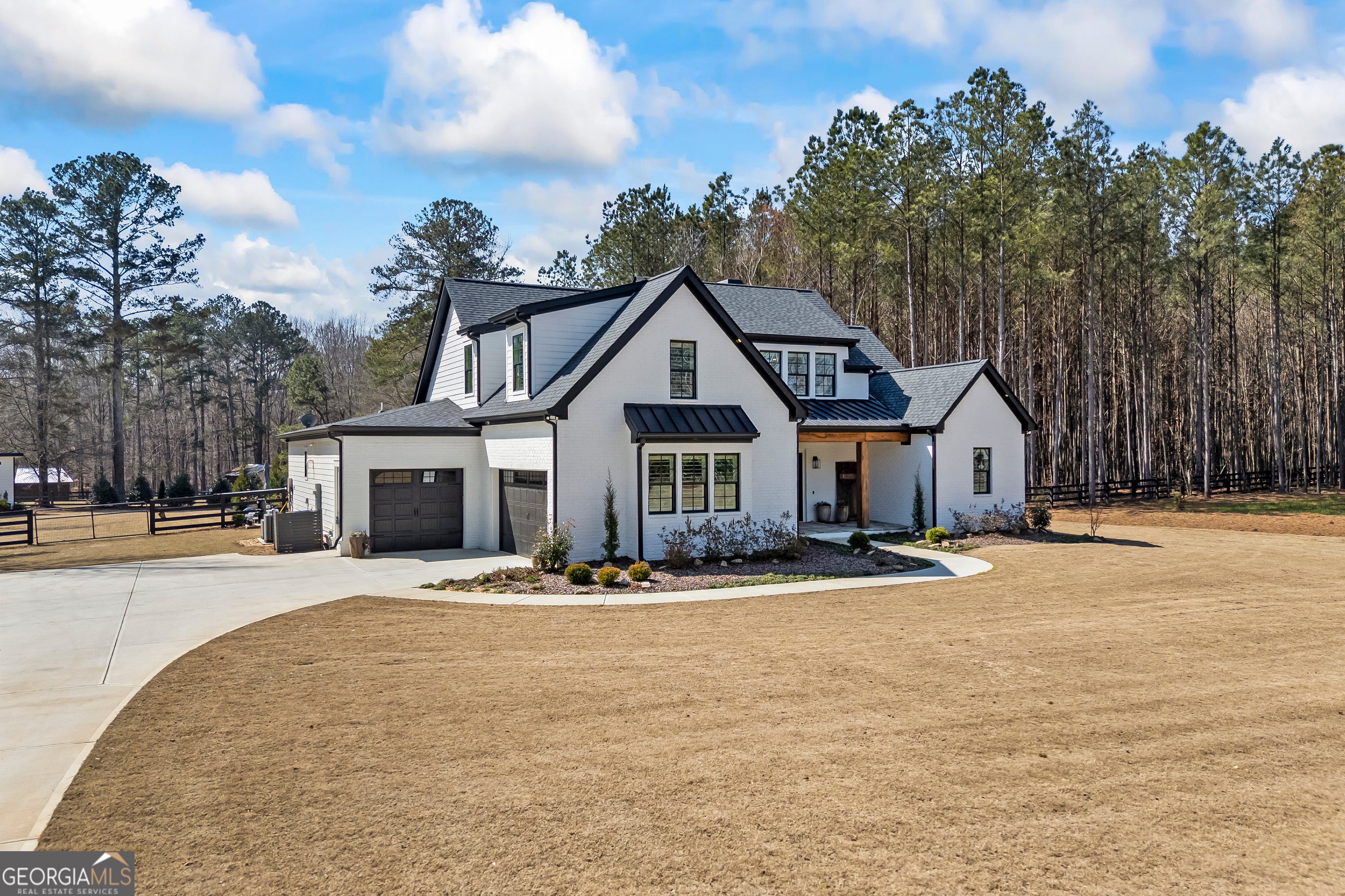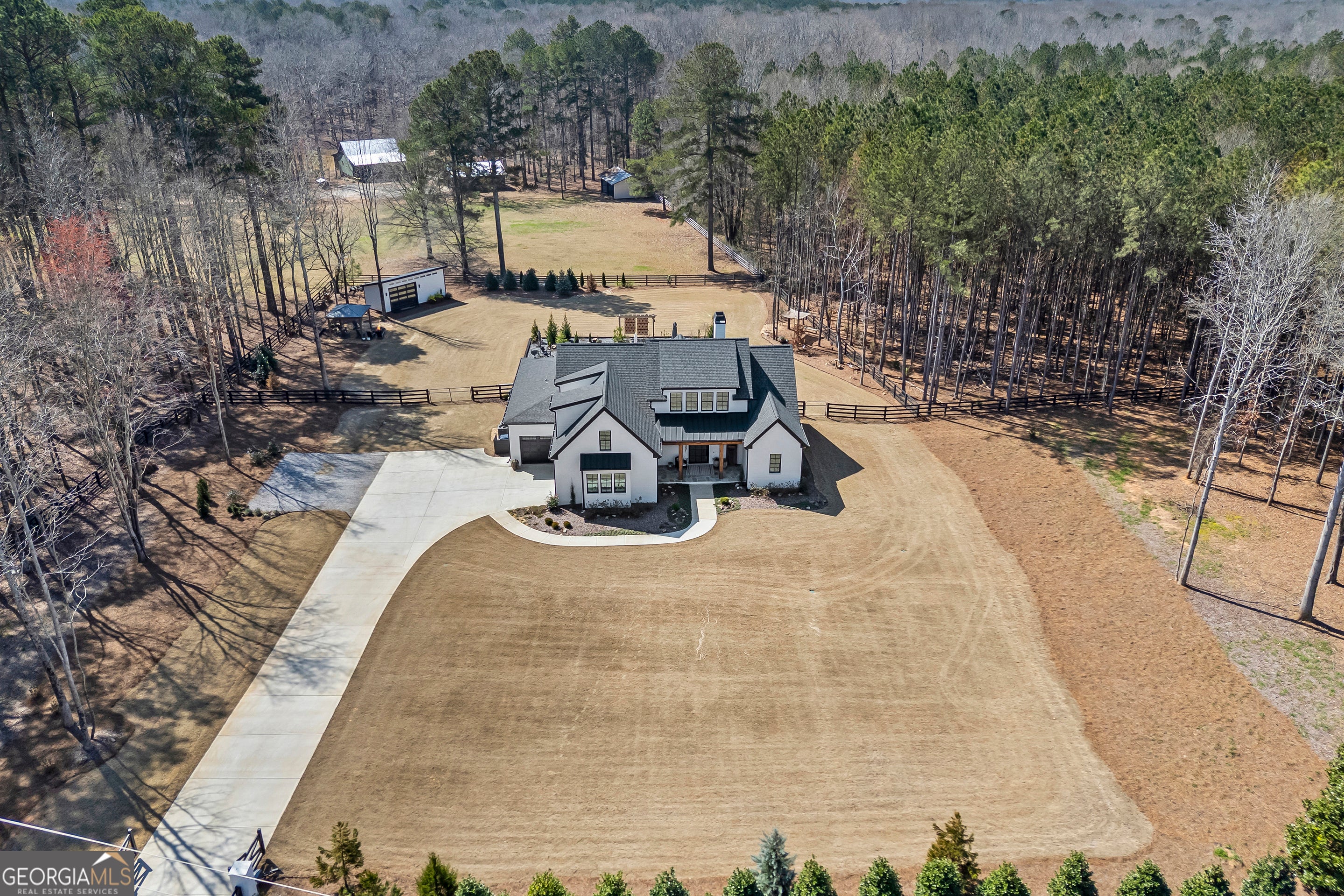Situated on 2 acres, this better-than-new modern farmhouse with a saltwater pool is a rare opportunity in the North Oconee School District. From the gated entry, the white brick facade with striking black accents welcomes you to a charming front porch featuring a tongue-and-groove ceiling, stone flooring, and custom wood headers and columns. A showstopping full-glass 5' pivot front door sets the tone as you step into the foyer. Luxury plank flooring and plantation shutters extend throughout the entire home. Designed with entertaining and comfort in mind, the open-concept living room features coffered ceilings with tongue-and-groove detailing and a dramatic floor-to-ceiling brick fireplace flanked by built-in bookcases. Adjacent to the living room, the gourmet kitchen is a true showpiece, boasting a large island with waterfall quartz countertops, ZLINE stainless steel appliances, tile backsplash, large basin sink, and a spacious walk-in pantry. The dining area offers ample space for gatherings and features a multi-slide patio door leading to the covered outdoor living area. The owner's suite is a luxurious main-level retreat featuring a tray ceiling, stylish accent wall, expansive custom walk-in closet, and a spa-like en-suite bath with dual vanities, a tiled shower, and a freestanding soaking tub. The laundry room, complete with built-in cabinetry and a utility sink, is conveniently accessible from both the owner's suite and the hallway. A secondary bedroom and full bathroom are also located on the main floor. Upstairs you'll find a bedroom with its own en-suite bathroom, another secondary bedroom, a bonus room or fifth bedroom, and an additional full bathroom. Outdoor living is just as impressive, with an extended covered patio overlooking the stunning in-ground saltwater pool with sundeck and powered shades. A covered pergola fire pit area sits beside the pool house, which is fully finished with power, a mini-split system, and a custom full-glass garage door, perfect for enjoying football nights by the fire. The pool house also includes a convenient storage room. Additional features include a three-car garage, an extended parking pad, a fully fenced property with the front yard partitioned from the backyard, and a sprinkler system that covers the entire yard. The upgraded landscaping and outdoor lighting create a breathtaking setting, especially at night. This one-of-a-kind property combines private, upscale living while remaining within easy reach of Monroe, Athens, and Watkinsville for shopping, dining, and entertainment.