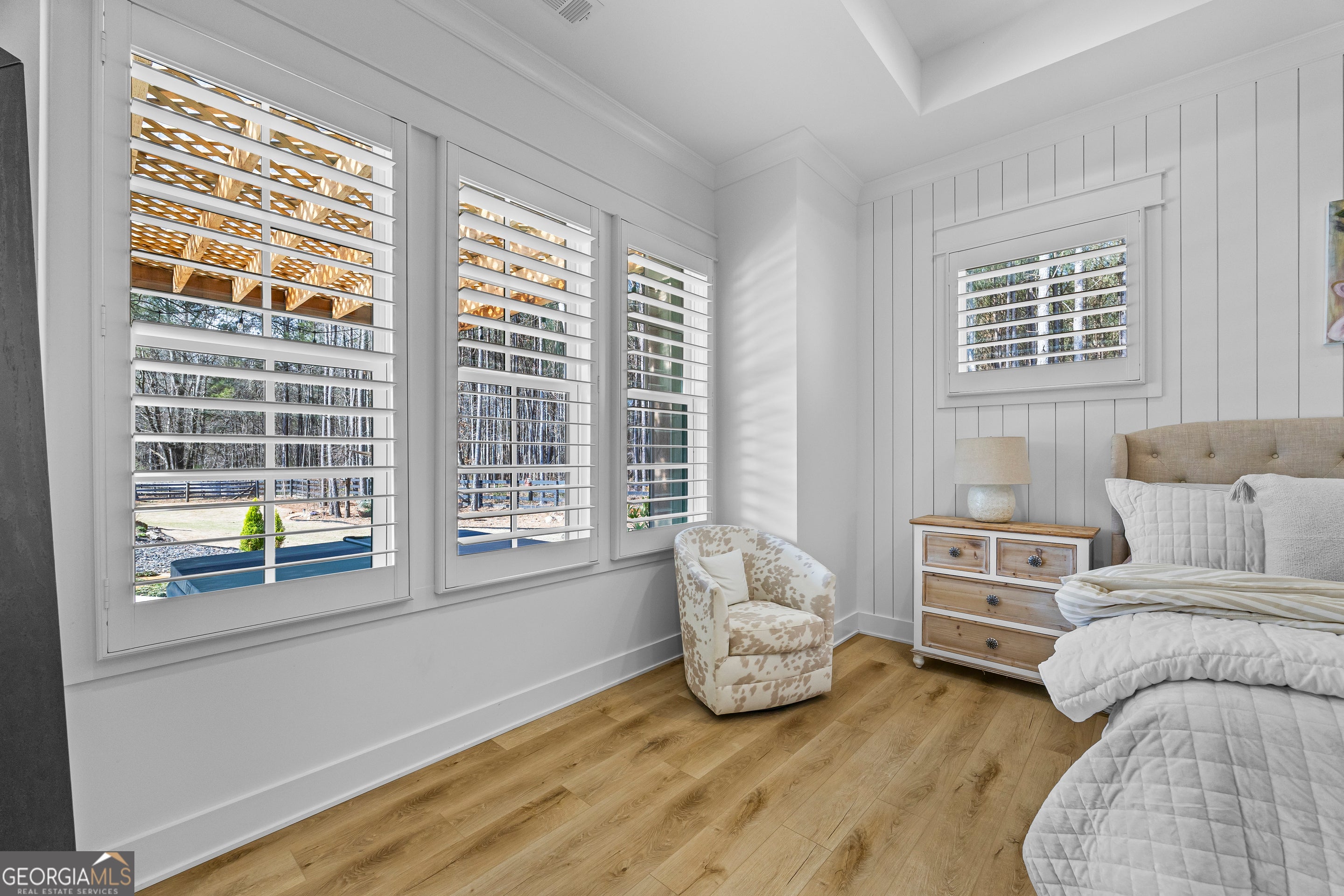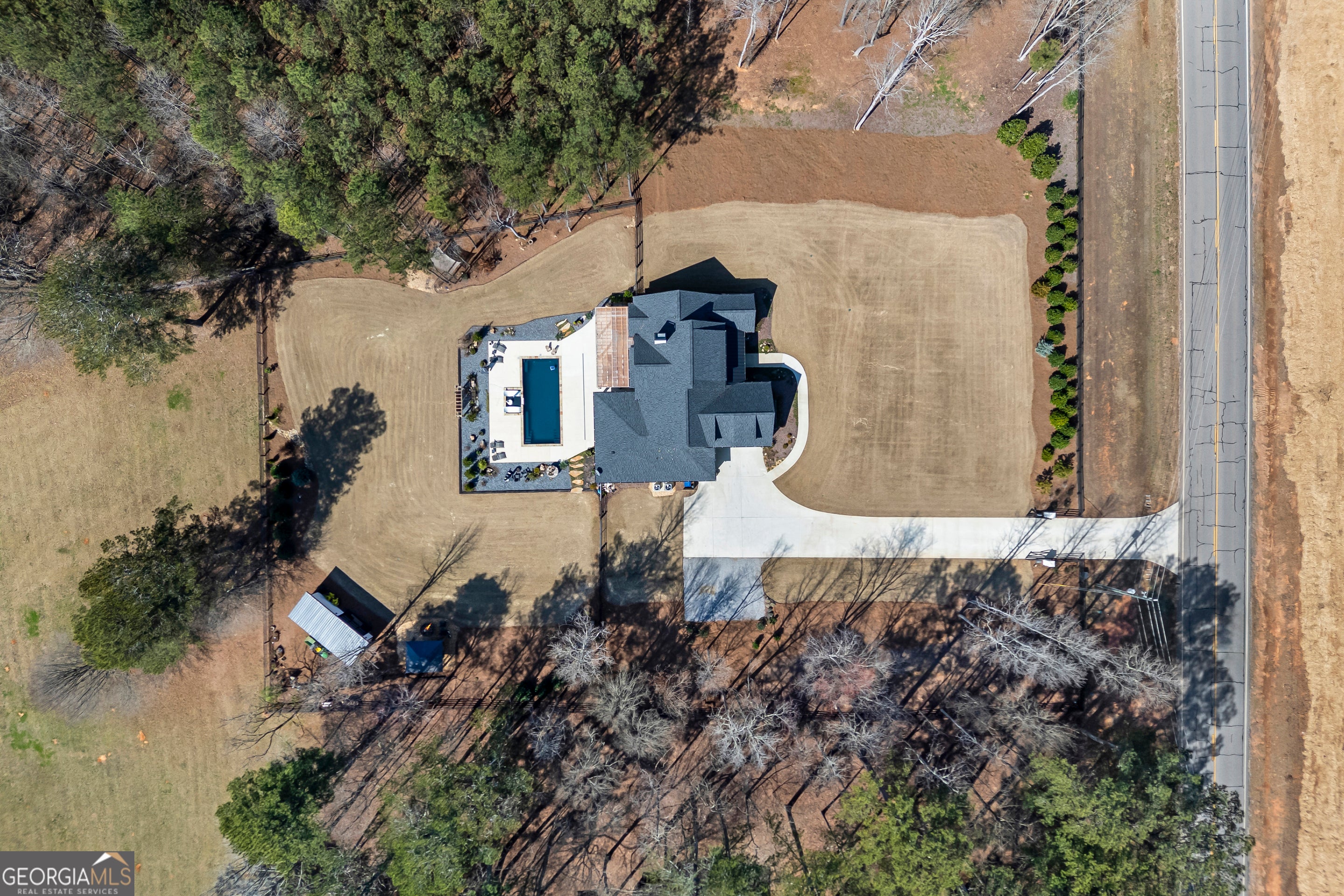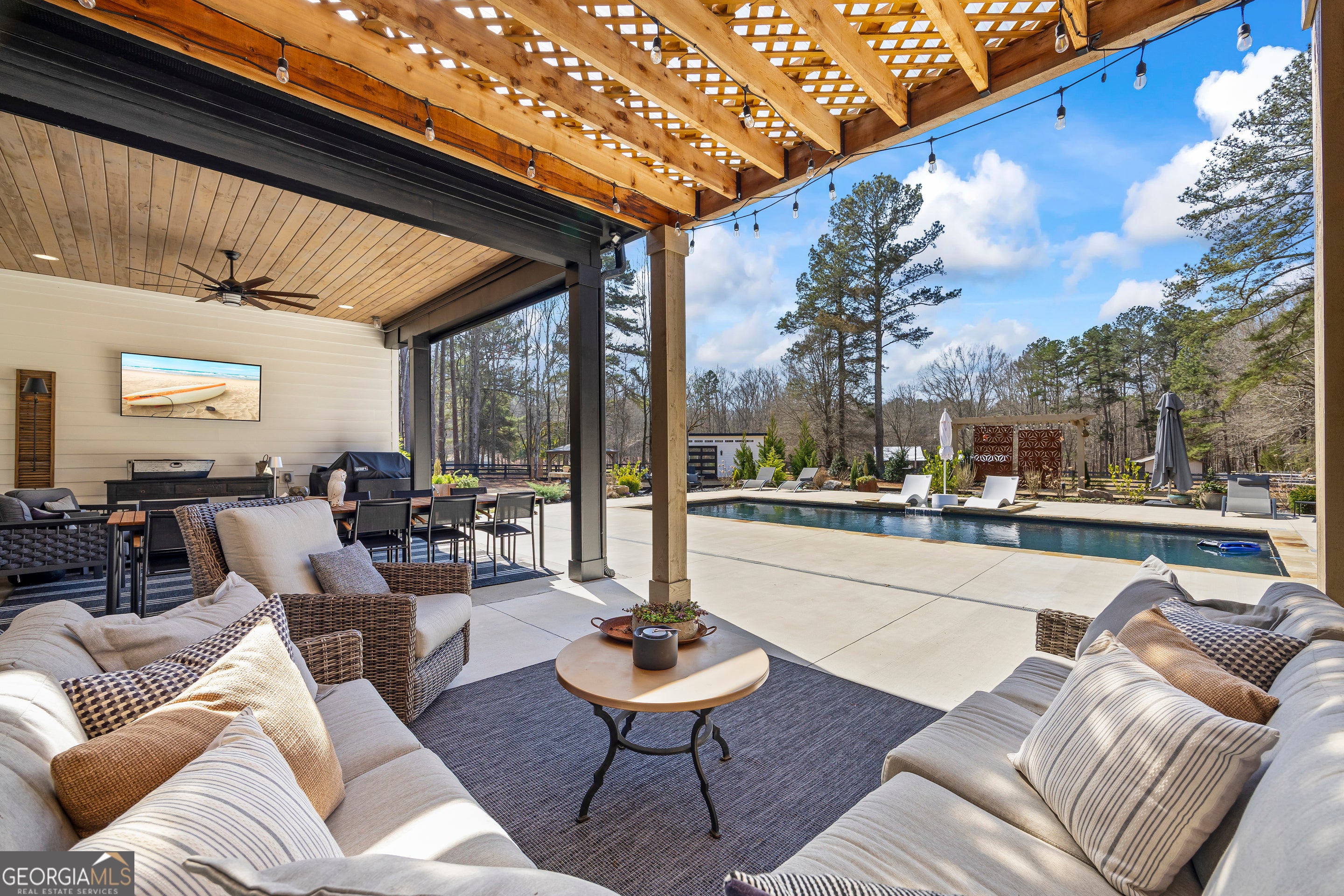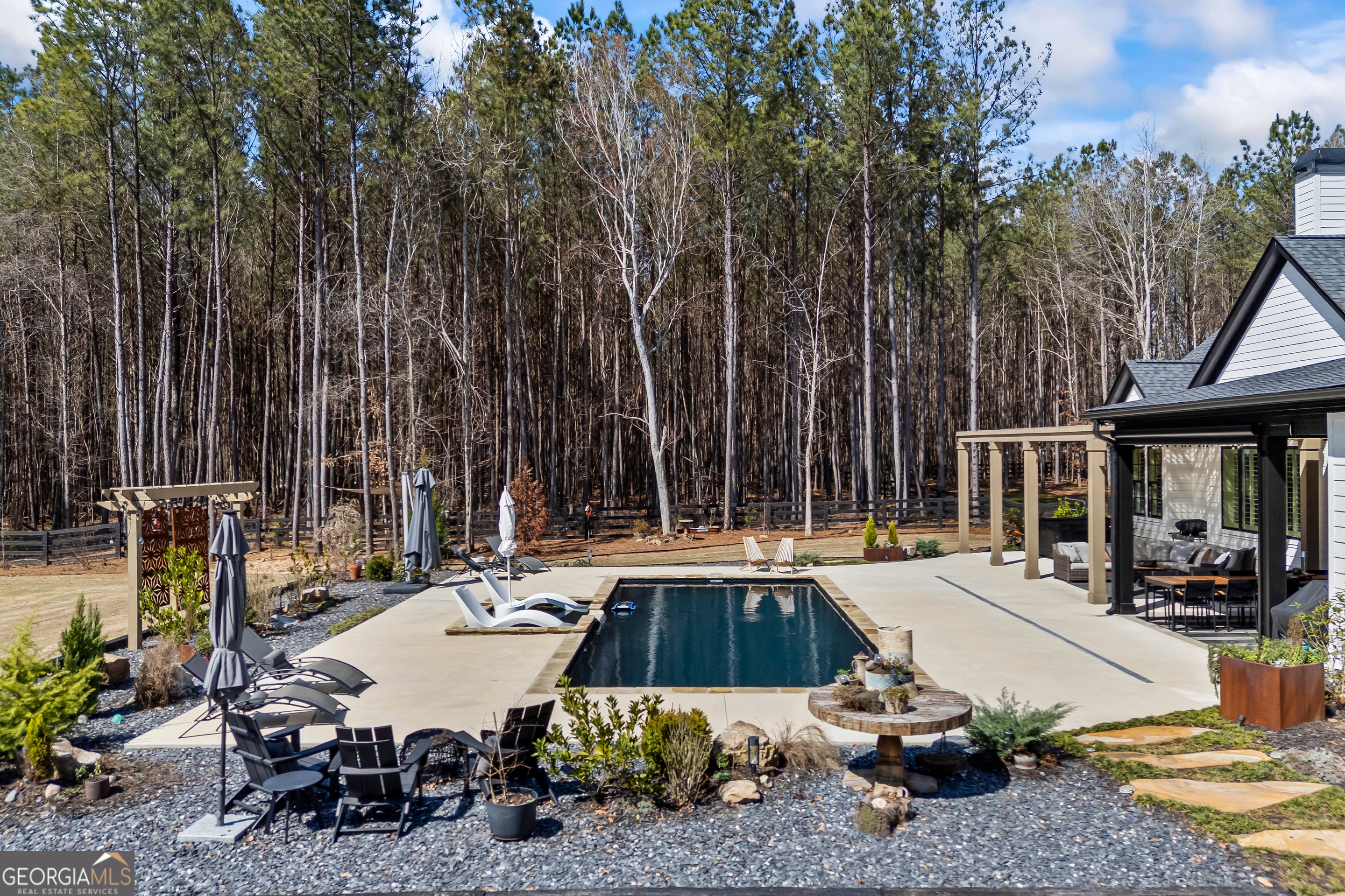 Situated on 2 acres, this better-than-new modern farmhouse with a saltwater pool is a rare opportunity in the North Oconee School District. From the gated entry, the white brick facade with striking black accents welcomes you to a charming front porch featuring a tongue-and-groove ceiling, stone flooring, and custom wood headers and columns. A showstopping full-glass 5' pivot front door sets the tone as you step into the foyer. Luxury plank flooring and plantation shutters extend throughout the entire home. Designed with entertaining and comfort in mind, the open-concept living room features coffered ceilings with tongue-and-groove detailing and a dramatic floor-to-ceiling brick fireplace flanked by built-in bookcases. Adjacent to the living room, the gourmet kitchen is a true showpiece, boasting a large island with waterfall quartz countertops, ZLINE stainless steel appliances, tile backsplash, large basin sink, and a spacious walk-in pantry. The dining area offers ample space for gatherings and features a multi-slide patio door leading to the covered outdoor living area. The owner's suite is a luxurious main-level retreat featuring a tray ceiling, stylish accent wall, expansive custom walk-in closet, and a spa-like en-suite bath with dual vanities, a tiled shower, and a freestanding soaking tub. The laundry room, complete with built-in cabinetry and a utility sink, is conveniently accessible from both the owner's suite and the hallway. A secondary bedroom and full bathroom are also located on the main floor. Upstairs you'll find a bedroom with its own en-suite bathroom, another secondary bedroom, a bonus room or fifth bedroom, and an additional full bathroom. Outdoor living is just as impressive, with an extended covered patio overlooking the stunning in-ground saltwater pool with sundeck and powered shades. A covered pergola fire pit area sits beside the pool house, which is fully finished with power, a mini-split system, and a custom full-glass garage door, perfect for enjoying football nights by the fire. The pool house also includes a convenient storage room. Additional features include a three-car garage, an extended parking pad, a fully fenced property with the front yard partitioned from the backyard, and a sprinkler system that covers the entire yard. The upgraded landscaping and outdoor lighting create a breathtaking setting, especially at night. This one-of-a-kind property combines private, upscale living while remaining within easy reach of Monroe, Athens, and Watkinsville for shopping, dining, and entertainment.