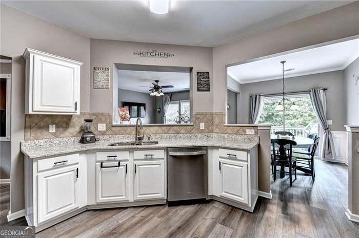 Upgraded and move-in ready! Rare cul-de-sac lot in desirable Stonehaven Pointe with a finished basement featuring a media room, bedroom, full bath and game room that opens to a large patio and fenced yard overlooking woods. Renovated primary bath with tiled shower and spacious walk-in closet. updated appliances, granite countertops, laminate flooring on the main level, few years old roof and exterior paint, updated water heater and basement HVAC. Expansive patio and professionally landscaped backyard ideal for entertaining. Community amenities include a large pool with slide, tennis courts, playground and a clubhouse with fitness center. Located in top-ranked Forsyth County schools. No rental restrictions - won't last long.