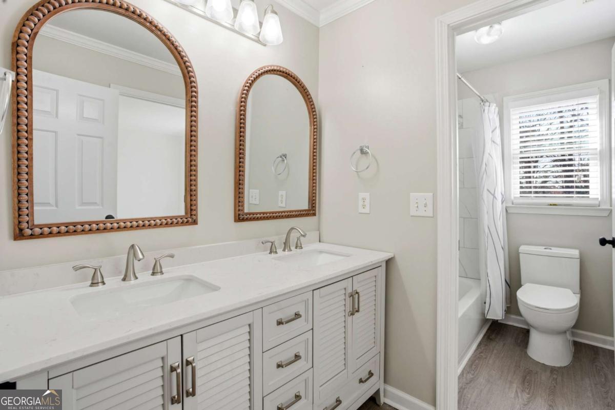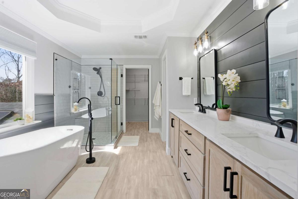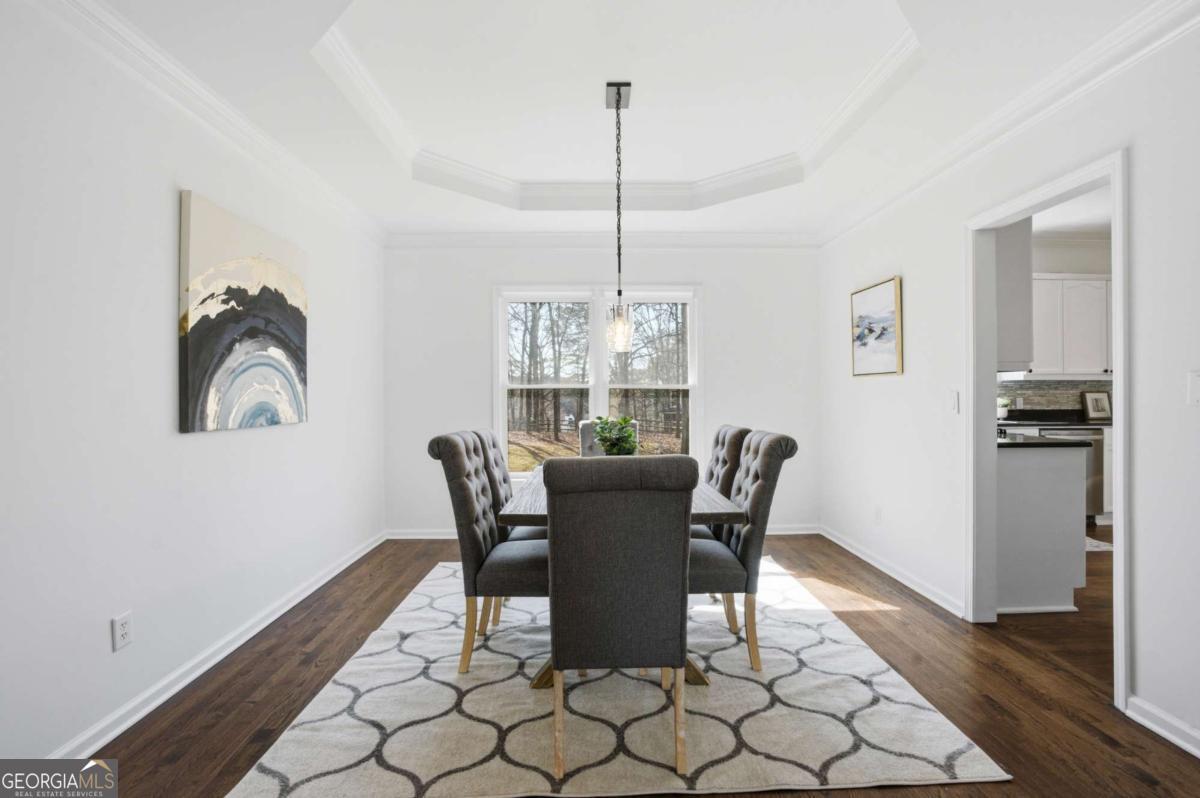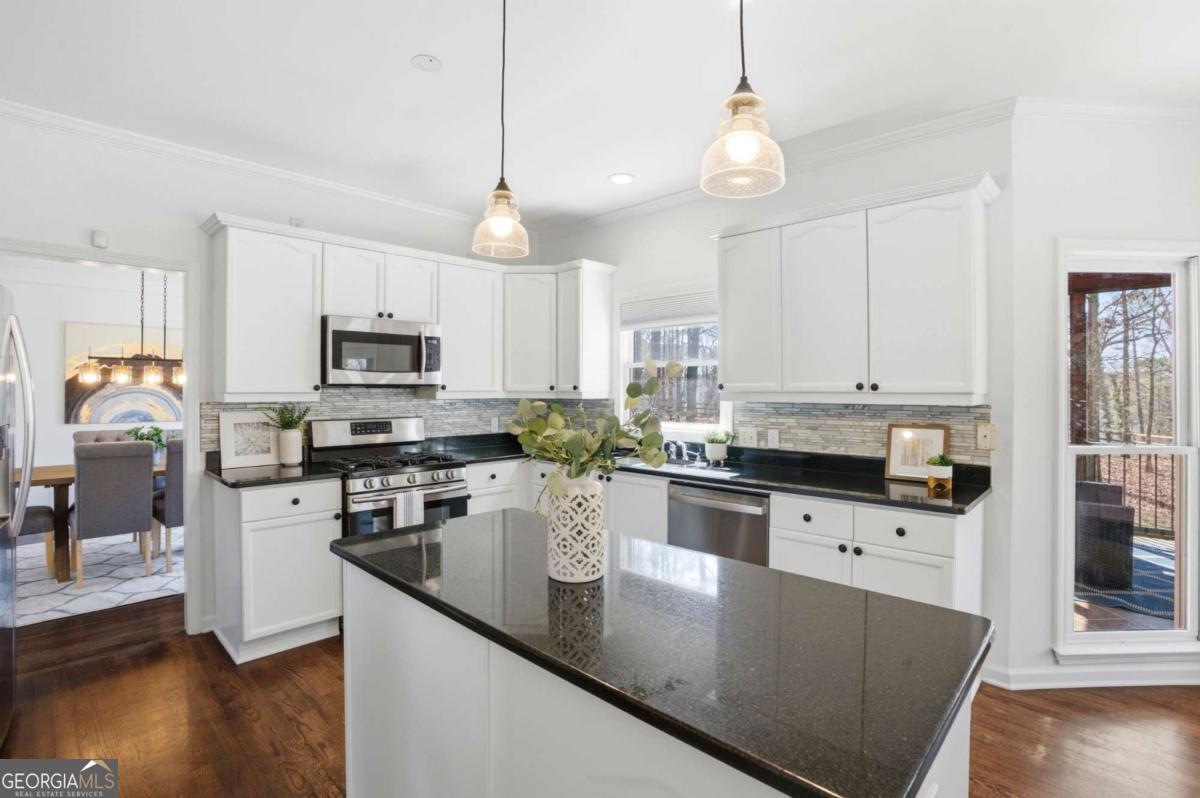 Welcome to this exceptional brick estate in the highly desirable Towne Lake Hills Golf Community, perfectly positioned on a private cul-de-sac lot with approximately one acre and a massive fenced backyard overlooking the golf course. With three full levels of finished living space and incredible indoor-outdoor entertaining areas, this home offers the lifestyle buyers are searching for. From the moment you step inside, rich hardwood floors, extensive crown molding, and fresh neutral paint create a bright and inviting atmosphere. The formal dining room features a trey ceiling and elegant lighting, while the private main-level office is filled with natural light from oversized windows. The updated kitchen is both timeless and functional, showcasing white cabinetry with updated hardware, sleek black countertops, stainless steel appliances including a gas range, a modern tile backsplash, and a generous center island perfect for gathering. Pendant lighting and an open layout flow seamlessly into the breakfast area and spacious family room. The family room is anchored by a classic white fireplace and surrounded by a wall of windows that overlook the wooded backyard and deck. Upstairs, the oversized primary suite is a true retreat featuring vaulted ceilings, hardwood floors, and a large sitting room centered around a beautiful brick fireplace. A modern sliding barn door adds architectural interest and leads into the completely renovated spa-inspired primary bathroom. This stunning space includes a freestanding soaking tub, frameless glass shower with designer tile, matte black fixtures, dual vanities with quartz countertops, statement mirrors, custom lighting, and a spacious walk-in closet. Every detail was thoughtfully designed for both style and comfort. Secondary bathrooms are beautifully updated with quartz countertops and designer finishes. Spacious secondary bedrooms offer ample natural light and room to grow. The terrace level provides expansive finished space ideal for a media room, game room, fitness area, or multi-generational living. Built-in shelving adds functionality and character, while recessed lighting keeps the space bright and inviting. Outdoor living is truly exceptional. The screened-in porch features a stunning vaulted wood ceiling with skylights, exposed beams, and ceiling fan - creating the perfect year-round retreat overlooking the lush backyard. The upper grilling deck offers open-air entertaining space with pergola accents and decorative privacy lattice. Below, a large covered lower entertainment deck provides even more space for hosting. The expansive fenced backyard is beautifully maintained with level green lawn, stone accents, and wooded privacy - a rare find in Towne Lake Hills. Major updates include a new HVAC system, newer roof, all new carpet, and fresh paint throughout. Located in the top-rated Cherokee County school district and within one of Woodstock's most sought-after golf communities, this home combines luxury, space, and lifestyle in one extraordinary package. Golf course living, privacy, modern updates, and three levels of finished space - this one truly has it all. Towne lake Hills subdivision has top-of-the-line amenities for all ages, including a restaurant, golf shop, golf, pro prestigious, golf course, huge playground, Olympic size, pool, pickle ball, lighted tennis courts, Alta tennis Teams and lessons, swim team, clubhouse, and fitness center.