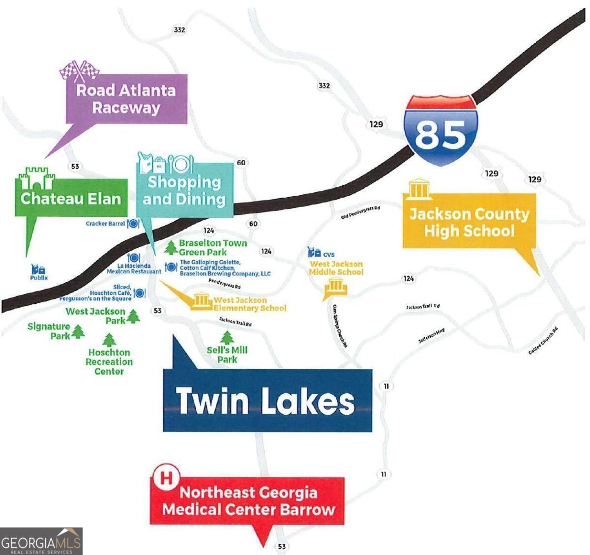 Twin Lakes is only 2 miles from I-85, 5 minutes to Downtown Hoschton/Braselton with their quaint shops, restaurants and local brewery. Newer sought after Jackson County Schools! SPECIAL FINANCING! The CALI floor plan is an affordable 4 bedroom, 2 bath One-Level home with an rear COVERED patio in a master planned community of TWIN LAKES with AMAZING AMENITIES: POOL - CLUBHOUSE - FITNESS CENTER - PLAYGROUND - DOG PARK, LAKESIDE PAVILION and WALKING TRAILS to bike or stroll around the serene onsite LAKES. Home seekers will love this brand new home in a premier master planned resort community with gorgeous tree lined and cart pathways. Kitchen features gray cabinets with Quartz countertops and stainless steel appliances. LVP Floors through out home except in the bedrooms. Relax and enjoy your coffee in the morning, or a glass of wine with friends in the evening while grilling on your private patio. Total Price 2 ceiling fans,, architectural shingles, 4 sides brick water tables, etc. Smart Home connected. Jackson County's newest Premier Master Planned Community. Ask about the FREE 10 year warranty through RWC with this home! Twin Lakes is only 2 miles from I-85, 5 minutes to Downtown Hoschton/Braselton with their quaint shops, restaurants and local brewery. Northeast Georgia Medical Center is only 15 minutes away and Chateau Elan Winery and Golf Club is just 10 minutes away! NEW PUBLIX Supermarket is at the front entrance to Twin Lakes off Highway 53. Stock Photos used.