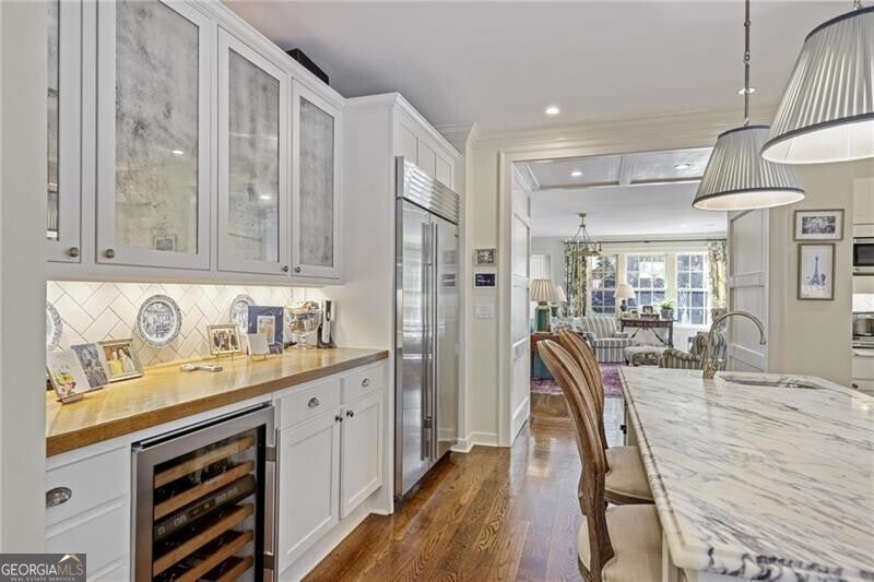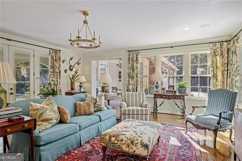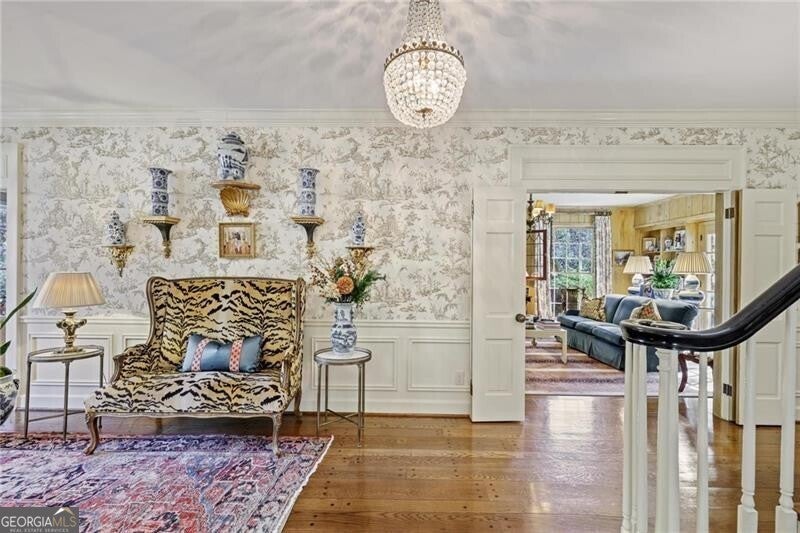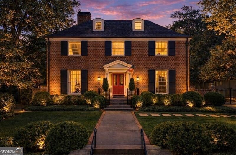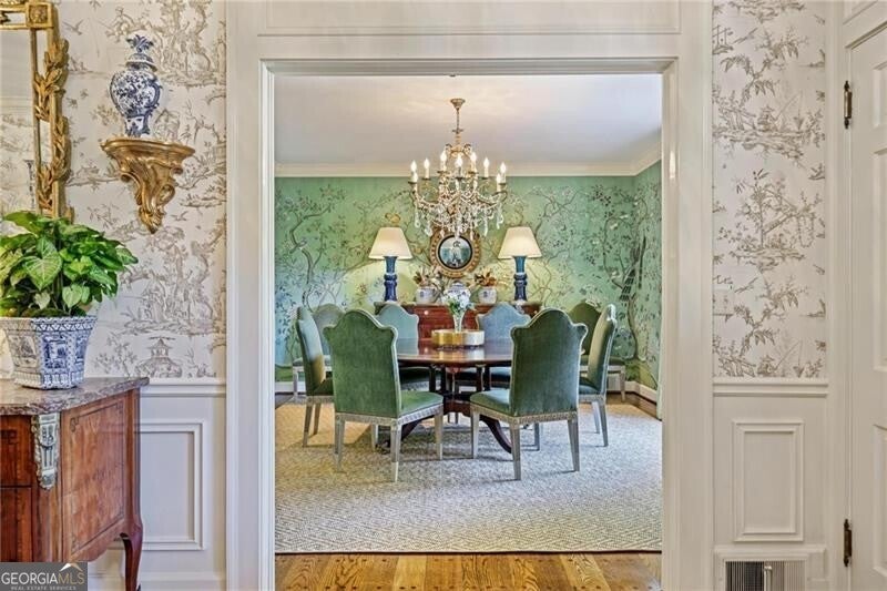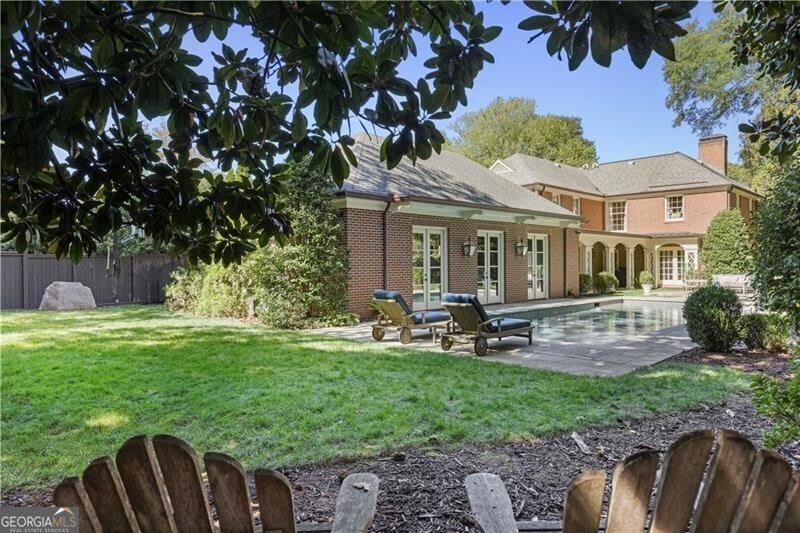 Welcome to this enchanting, historically significant Atlanta residence on prestigious Peachtree Battle Avenue. A gracious entrance foyer-with a conveniently located powder room-opens to an array of beautifully scaled living spaces ideal for both entertaining and everyday living. Enjoy a fireside formal living room, an elegant dining room adorned with hand-painted de Gournay wallpaper, and a handsome wood-paneled den complete with its own fireplace and bar. The light-filled, renovated kitchen is a chef's delight, featuring stainless steel appliances, marble countertops, an oversized island with seating, and a cheerful breakfast area. It flows seamlessly into the bright, sun-drenched family room overlooking the pool. A well-designed mudroom with bluestone flooring provides a convenient side entry and leads to the attached three-car garage, which also doubles as a superb outdoor entertaining area with direct access to the pool. Upstairs, five bedrooms and four full baths offer comfort and privacy for family and guests. The serene primary suite features its own charming fireplace, while the renovated primary bath includes a double vanity, soaking tub, separate shower, and a custom walk-in closet. An upstairs laundry room enhances the home's everyday convenience. Outside, the meticulously landscaped, level backyard is an entertainer's dream. A sparkling pool, outdoor powder bath, and covered patio create a resort-like oasis perfect for relaxing, gathering, and hosting unforgettable events.