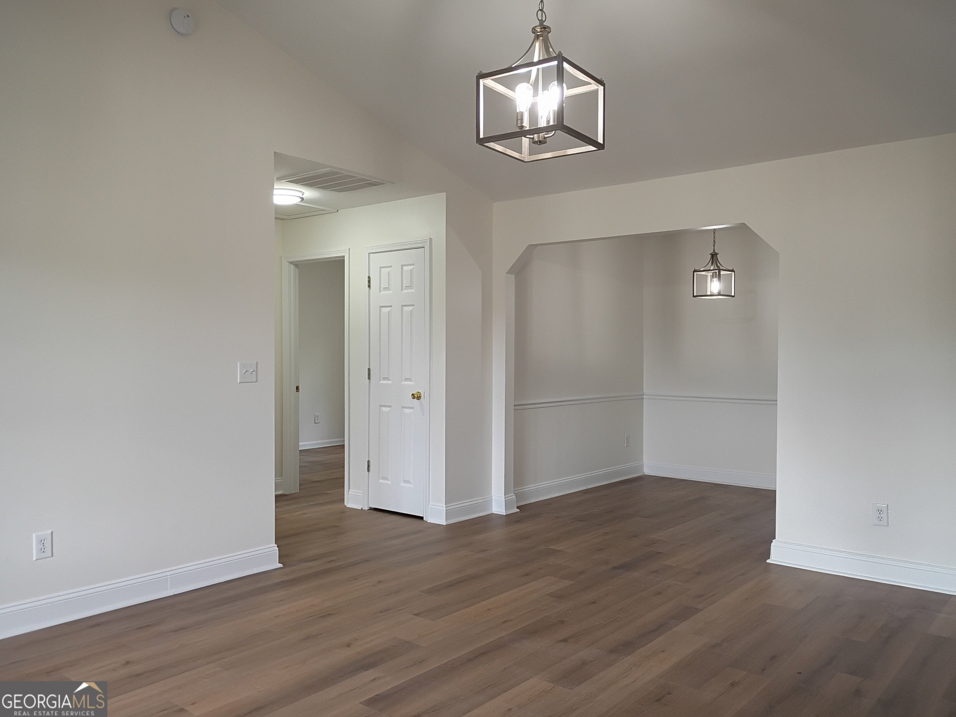 Be the first to enjoy this renovated ranch in Senoia! All walls and ceilings have fresh paint, and nearly all the flooring is new. Lots of natural light in every room. The living room has a vaulted ceiling, and leads to a dining space, which has a door to the huge wood-lined back yard. The kitchen has brand new appliances, and new quartz countertops, with a window at the sink overlooking the serene back yard. The kitchen connects to the laundry space, which has a door to the driveway. One side of the living room leads to the master suite with a large walk-in shower. The other side of the living room has a short hallway with two big closets, and leads to a full bathroom and two bedrooms. Both bedrooms have large closets.