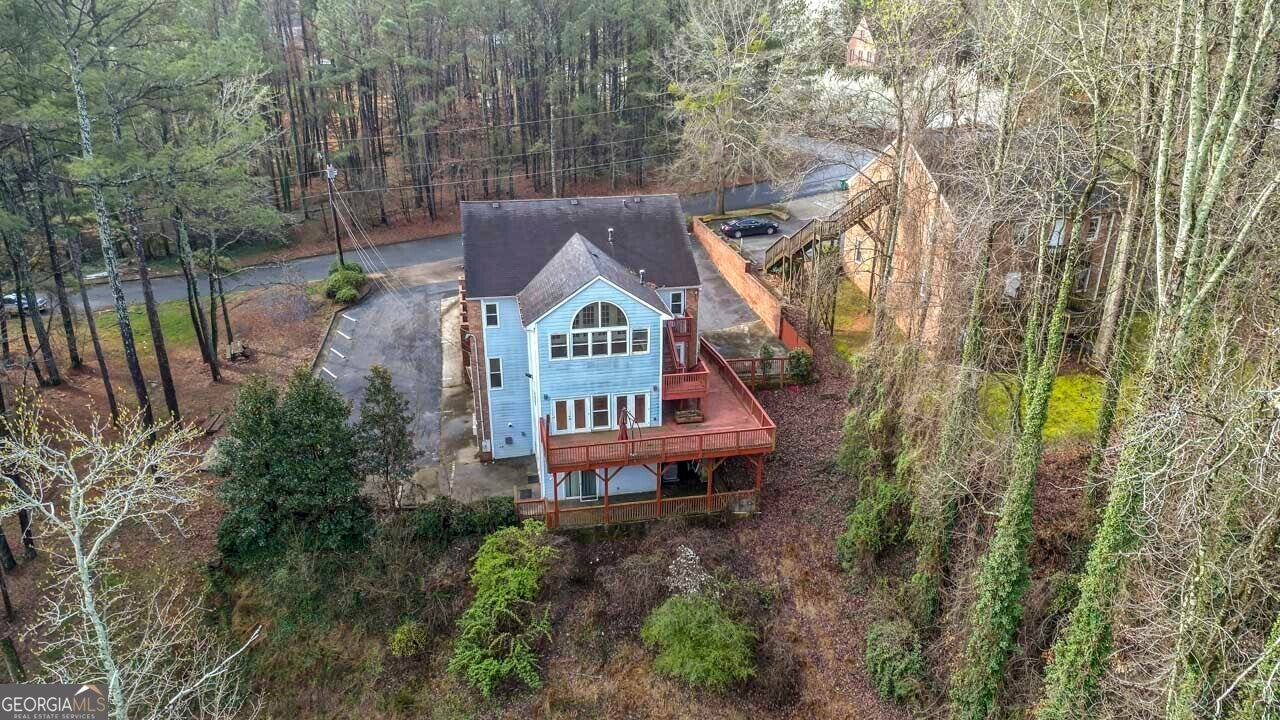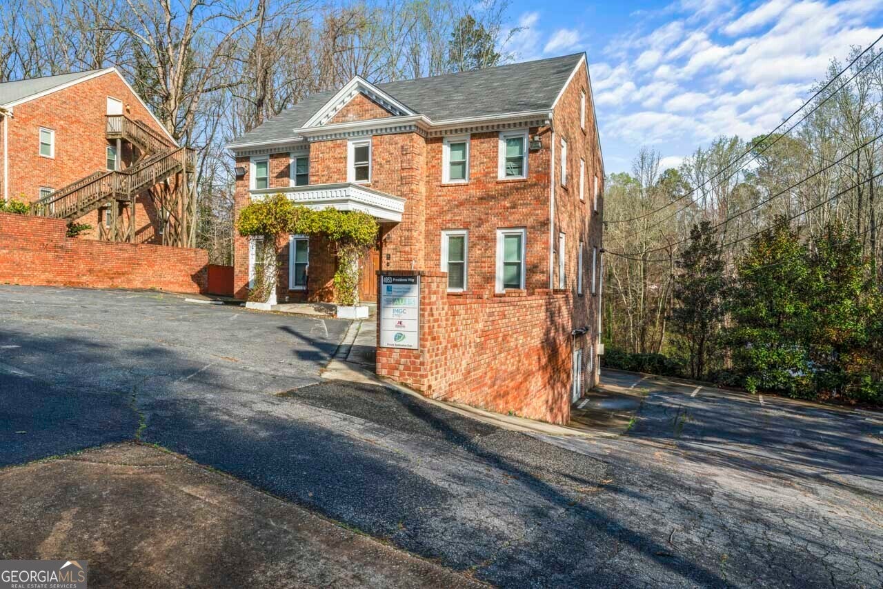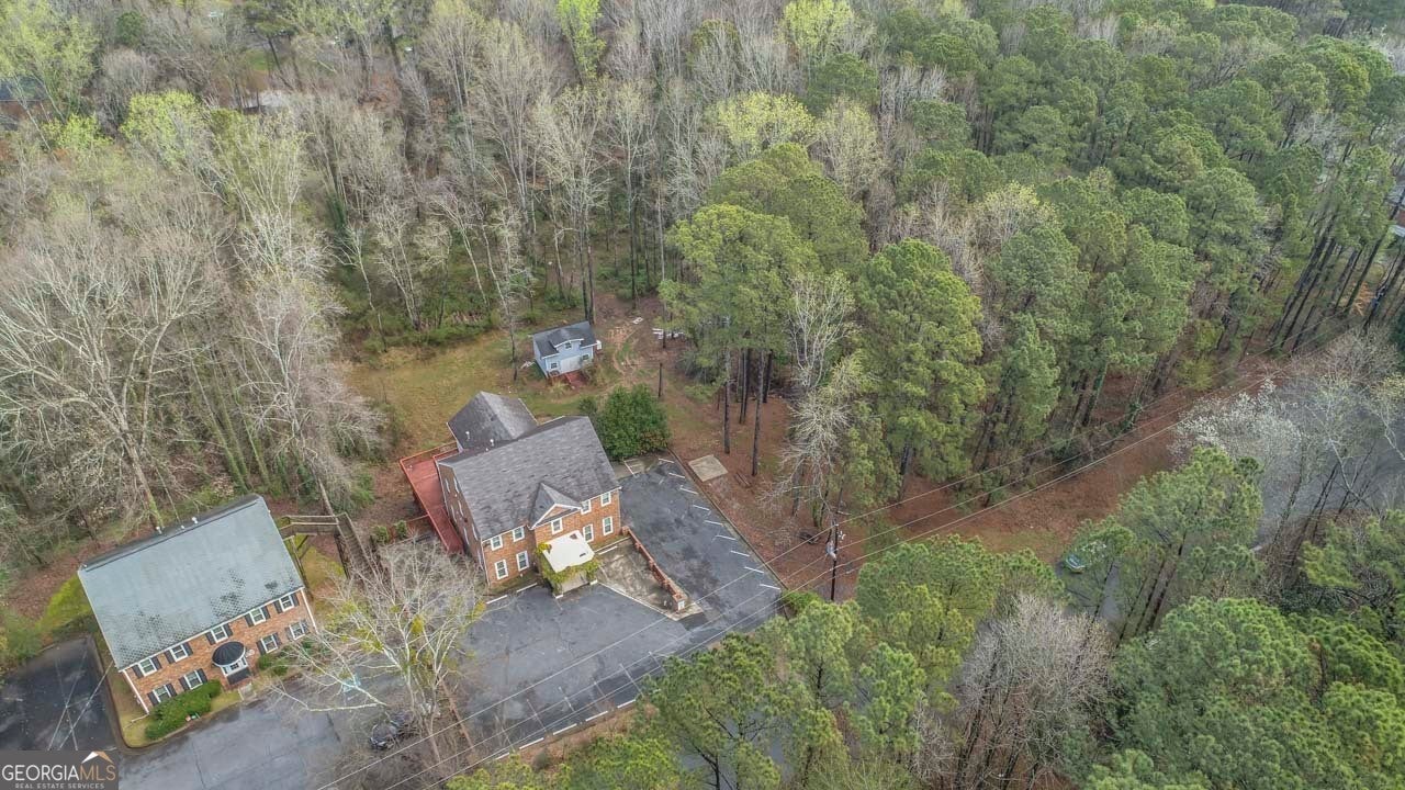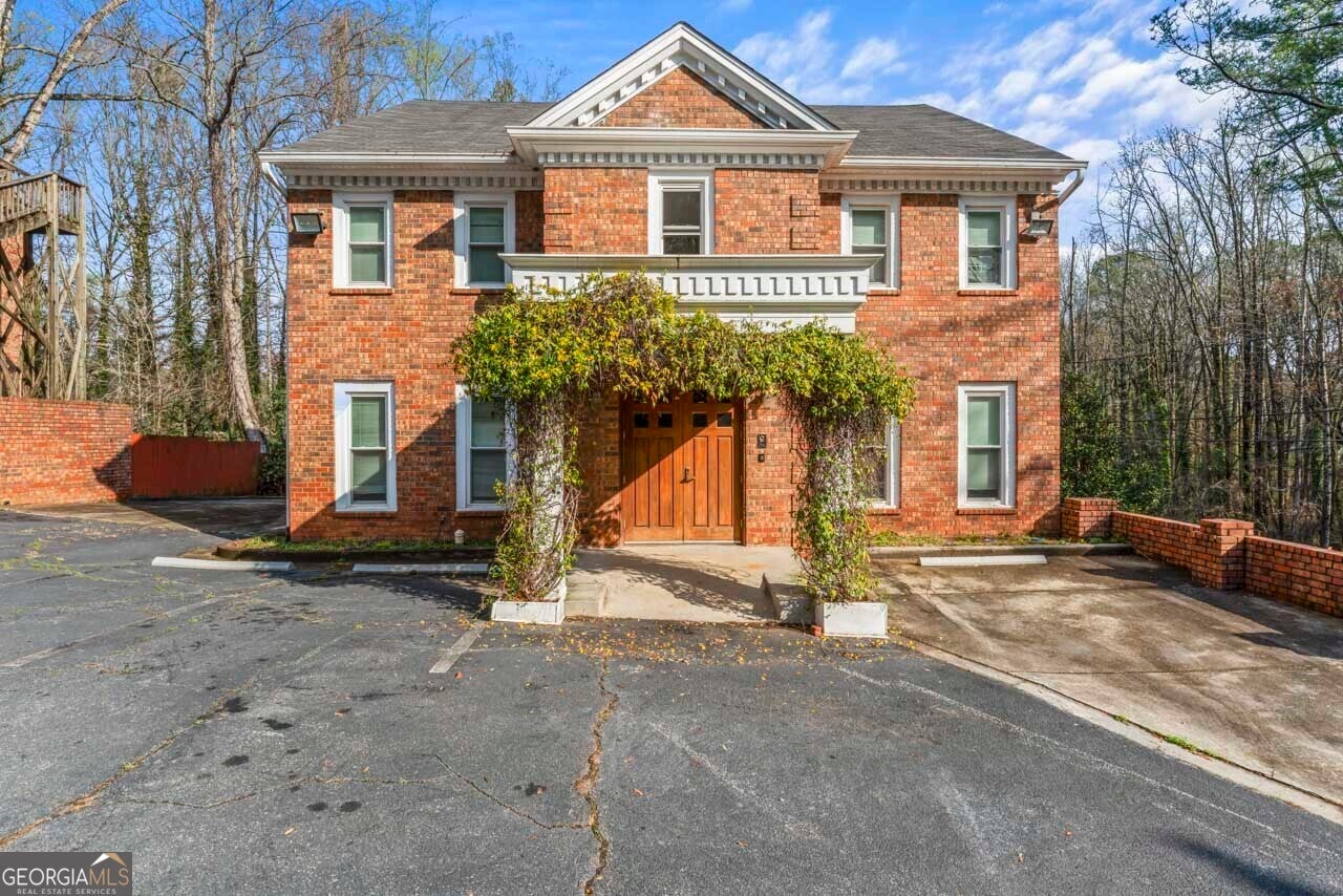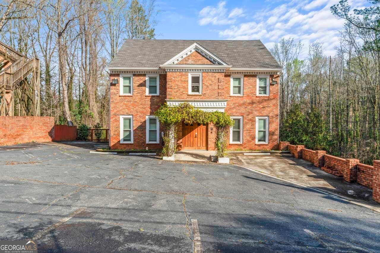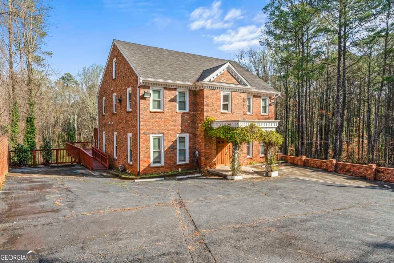 This building is a wonderful opportunity for any professional or investor to be in the heart of it all! Perfect for any large professional office that needs space to work and connection to the outdoors, especially with spring on the way! This four-story Brick/Frame building has approximately 7,700 total square feet spread across 3 stories and a full finished lower level w private entrance and a full usable attic. The main level features four large private offices, two ADA bathrooms, staircase leading upstairs and a kitchen. To the rear, a 16x20 conference room with glass walls on two sides allows plenty of natural light and doors opening up to the large walkout deck. The second floor offers a primary executive office (or secondary conference room) highlighted by an arched ceiling crafted from red cedar tongue-and-groove planks. This level also includes four additional private offices, a private bathroom. Elegant Built-in cabinetry and shelving in the secondary executive office. The top floor provides a versatile, open-concept space configured as a bullpen or as a large meeting area. The ground floor is equally impressive, featuring a 25x45 open classroom or collaborative office space with a separate, private entry, two ADA bathrooms, as well as an adjacent private office with a patio and direct access to the parking lot. Positioned near I-85, Highway 78, and I-285, the property offers privacy while maintaining convenient access to major transit. Don't miss your opportunity to be in the middle of it all, while being away from the noise of traffic.