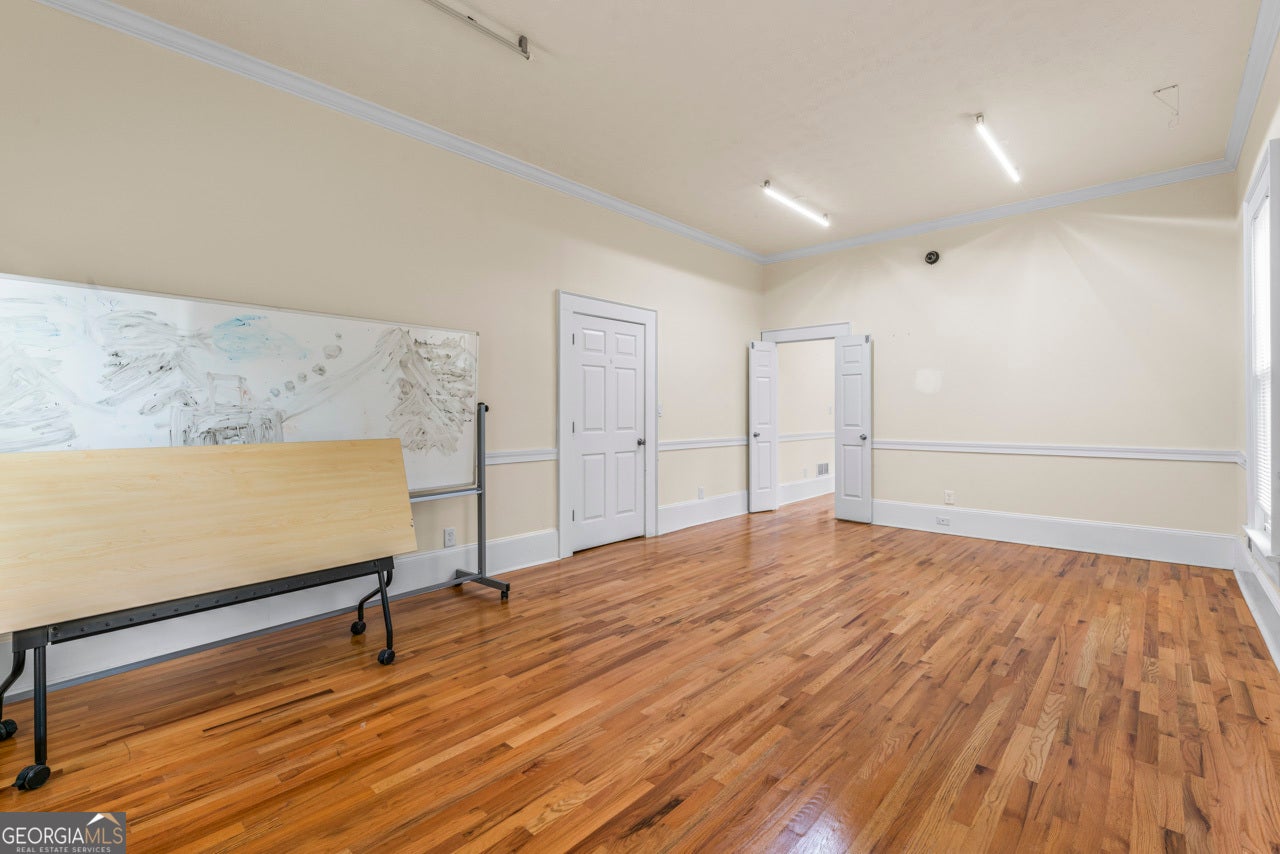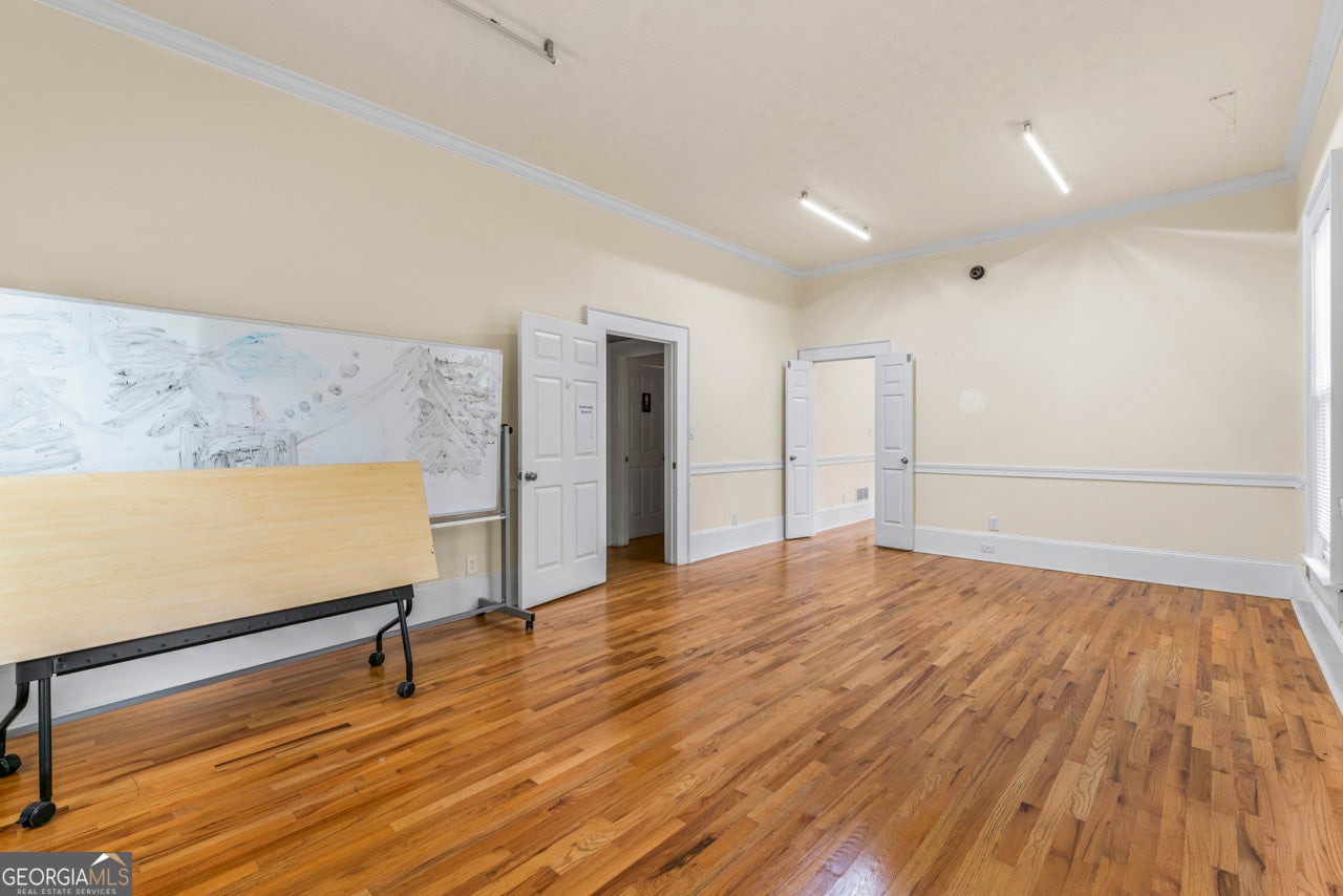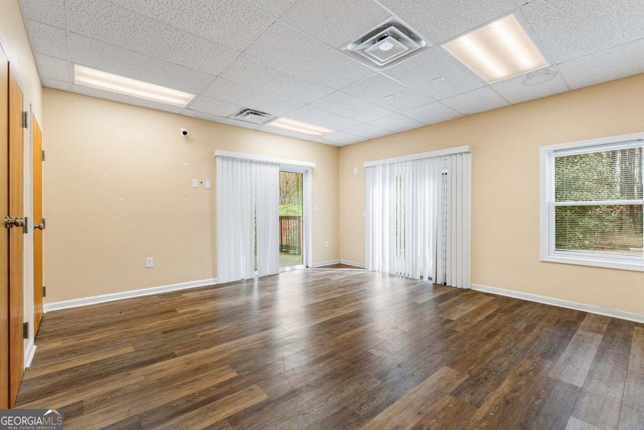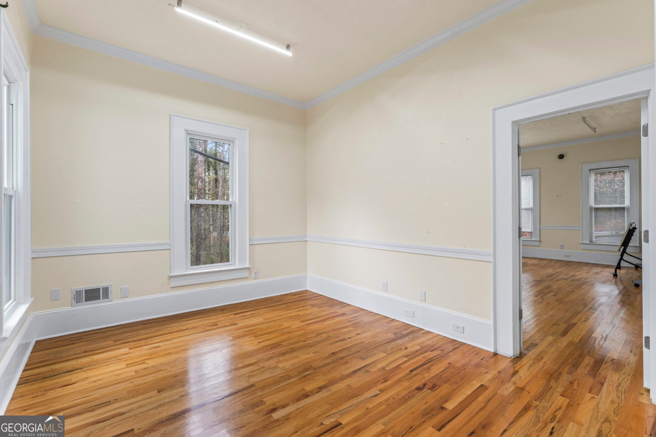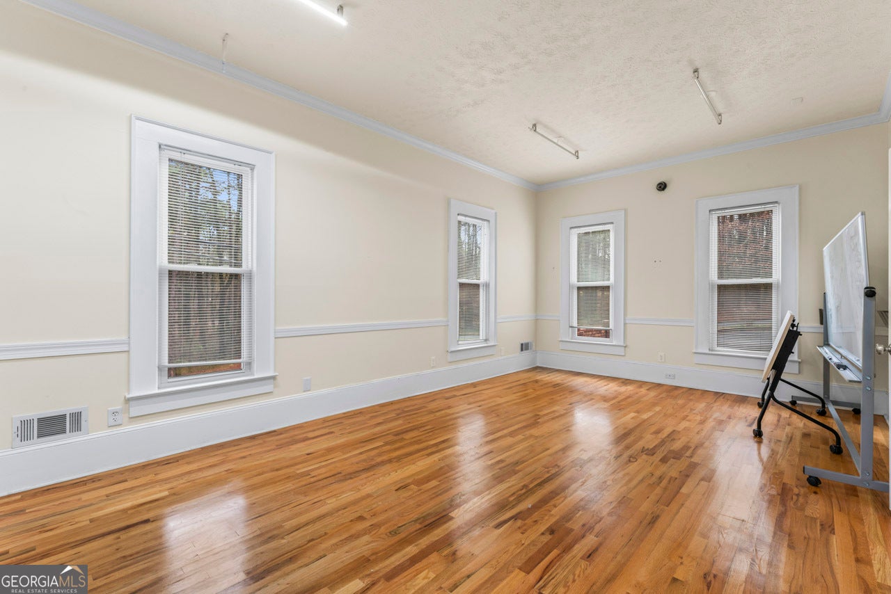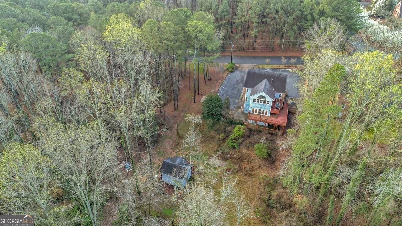 This building is a wonderful opportunity for any professional or investor to be in the heart of it all! Perfect for any large professional office that needs space to work and connection to the outdoors, especially with spring on the way! This four-story Brick/Frame building has approximately 7,700 total square feet spread across 3 stories and a full finished lower level w private entrance and a full usable attic. The main level features four large private offices, two ADA bathrooms, staircase leading upstairs and a kitchen. To the rear, a 16x20 conference room with glass walls on two sides allows plenty of natural light and doors opening up to the large walkout deck. The second floor offers a primary executive office (or secondary conference room) highlighted by an arched ceiling crafted from red cedar tongue-and-groove planks. This level also includes four additional private offices, a private bathroom. Elegant Built-in cabinetry and shelving in the secondary executive office. The top floor provides a versatile, open-concept space configured as a bullpen or as a large meeting area. The ground floor is equally impressive, featuring a 25x45 open classroom or collaborative office space with a separate, private entry, two ADA bathrooms, as well as an adjacent private office with a patio and direct access to the parking lot. Positioned near I-85, Highway 78, and I-285, the property offers privacy while maintaining convenient access to major transit. Don't miss your opportunity to be in the middle of it all, while being away from the noise of traffic.