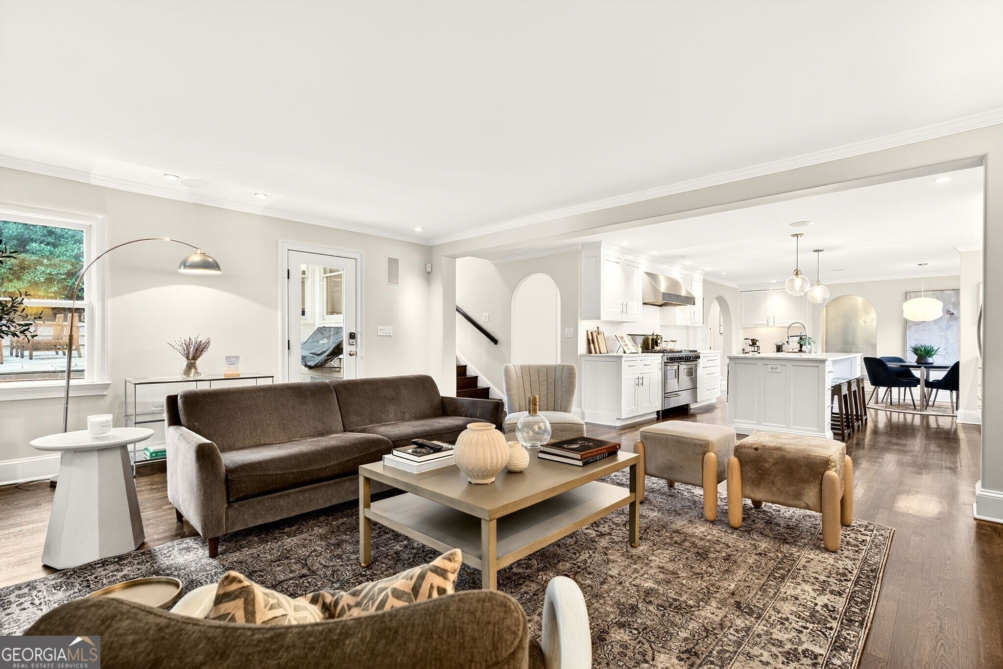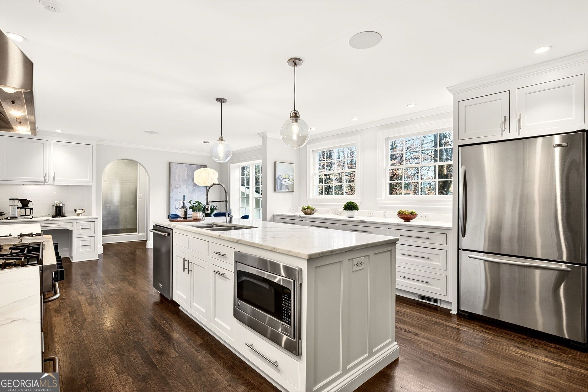 Morning walks to the trails. Summer concerts at the amphitheater. Dinner at the neighborhood's favorite restaurants just minutes from your front door. This is the lifestyle that defines one of Atlanta's most coveted addresses. Tucked into a beautifully wooded setting, this thoughtfully renovated residence blends timeless architecture with refined interiors and exceptional outdoor living. Inside, natural light fills the home, highlighting rich hardwood floors and elegant architectural details throughout. The home's flowing layout was designed for both effortless entertaining and comfortable daily living, with gracious spaces that feel open, warm, and inviting. At the center of the home, a beautifully appointed eat-in chef's kitchen features marble countertops, custom full-inset cabinetry, and top-tier stainless appliances. The generous island anchors the space and opens seamlessly to the family room, creating the natural gathering place for everyday living. Just beyond, French doors lead to an expansive screened porch that truly functions as an outdoor living room. With ample space for both lounging and dining, this inviting retreat features a soaring ceiling, recessed lighting and heaters for year-round comfort. Whether enjoying morning coffee, hosting dinner with friends, or relaxing with a glass of wine in the evening, the porch overlooks the lush backyard and creates the perfect extension of the home's living space. A formal dining room with a beautifully appointed butler's pantry provides the perfect setting for more formal occasions and opens to the inviting fireside living room. Upstairs, the primary suite offers a peaceful retreat, highlighted by vaulted ceilings with exposed beams and a dramatic wall of arched windows overlooking the serene backyard. The spa-like bath features marble finishes, a glass-enclosed shower, soaking tub, and custom vanity. Three additional bedrooms provide comfortable accommodations for family and guests, each filled with natural light and charming architectural character. The beautifully landscaped backyard featured on the 2010 Chastain Park Garden Tour unfolds into a private outdoor oasis with stone terraces, gathering areas, and a fire pit designed for memorable evenings with friends and family. A rare opportunity in the heart of Chastain Park: This impeccably renovated residence offers an unmatched blend of bespoke interior design and curated outdoor living.