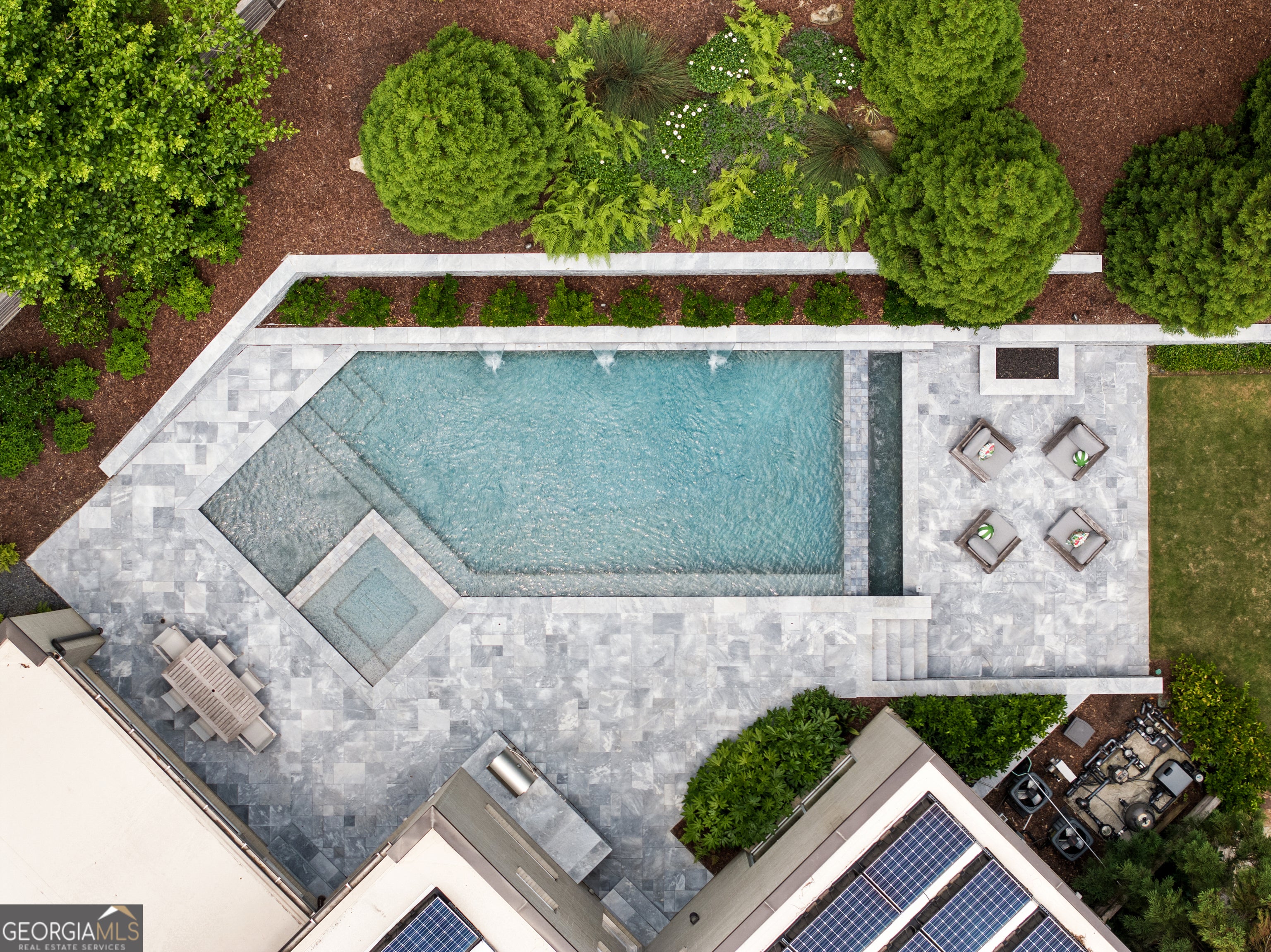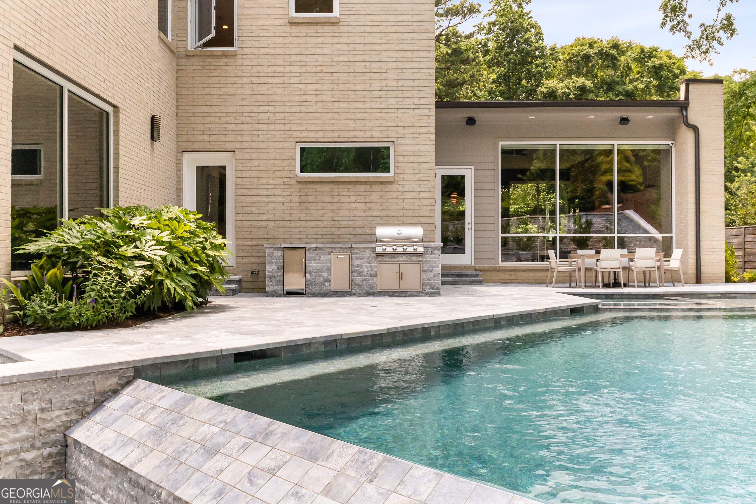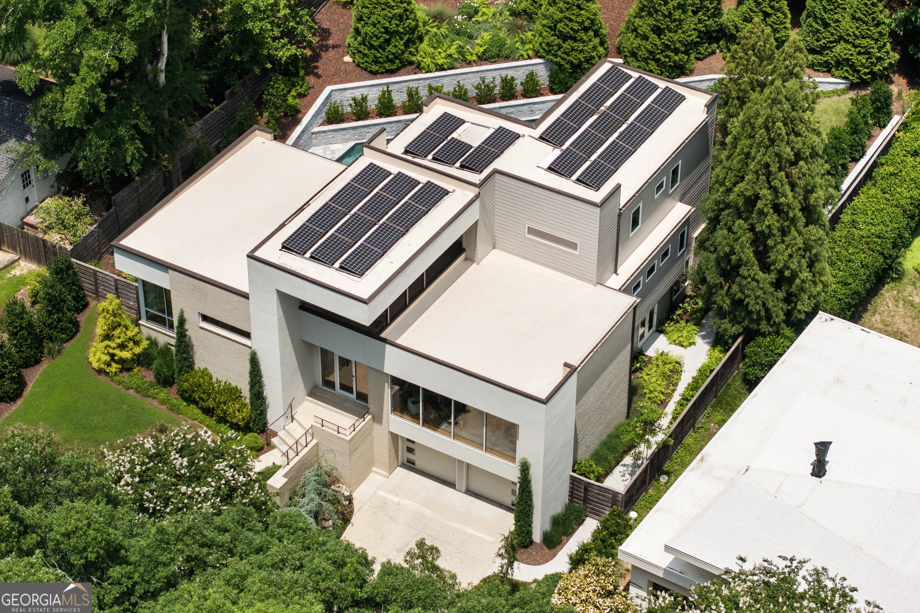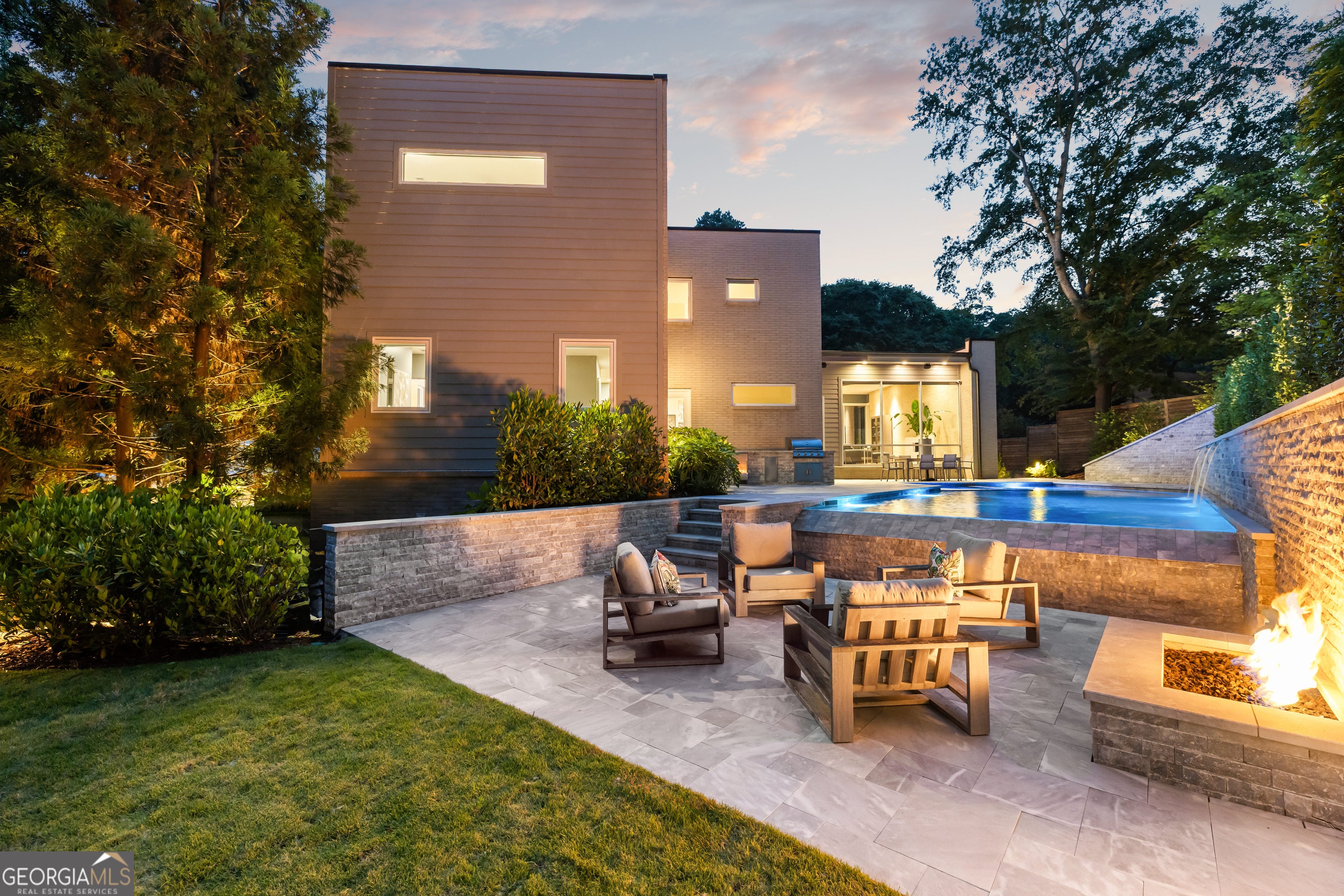 Perched on a quiet hilltop overlooking Lavista Park, this modern showpiece pairs bold architecture with serene privacy. Walls of glass and lush landscaping create dramatic street appeal, while inside, soaring ceilings, a floating glass staircase, and hardwoods throughout set the tone for sophisticated living. Set on one of Lavista Park's best streets, the home opens to a private, resort-style backyard. The outdoor oasis features a new heated PebbleTec saltwater pool with sun shelf, waterfalls, and infinity edge, complemented by marble retaining walls and patios. A fully equipped outdoor kitchen, fire pit, and automated landscape lighting and sound complete the unmatched indoor/outdoor lifestyle. The flexible layout includes a main-level primary suite with spa bath; private guest suites upstairs and on the terrace level; and three indoor plus three outdoor living areas for entertaining. A rooftop terrace with fireplace, wet bar, and skyline views extends the experience above the treetops. Every window is thoughtfully placed to frame dramatic natural landscapes, blurring the line between architecture and nature. At the heart of the home, the chef's kitchen balances clean-lined design with maximum functionality. Features include custom flat-paneled cabinetry, crisp quartz counters, dual full-size sinks, twin dishwashers, double ovens, a walk-in pantry, and an architectural backsplash. A dramatic brick feature wall extends from the exterior into the living spaces, visually connecting the resort-inspired yard to Lavista Park and beyond. Elevator-capable design and a terrace-level multigenerational suite-with second laundry and plumbing for a future kitchen-offer options for long-term guests or extended living. Additional features include a fully finished two-car garage with EV charging, whole-house audio (including rooftop and pool), app-controlled lighting, irrigation, and perimeter fencing with security cameras. A full solar array provides efficient, low-maintenance living through a self-sustaining closed-loop system. Situated in Lavista Park-an architectural enclave celebrated for its leafy streets, green space, and unmatched centrality to Emory, CHOA, the CDC, Midtown, and Buckhead-1242 Wild Creek Trail is not just a residence but a lifestyle destination.
