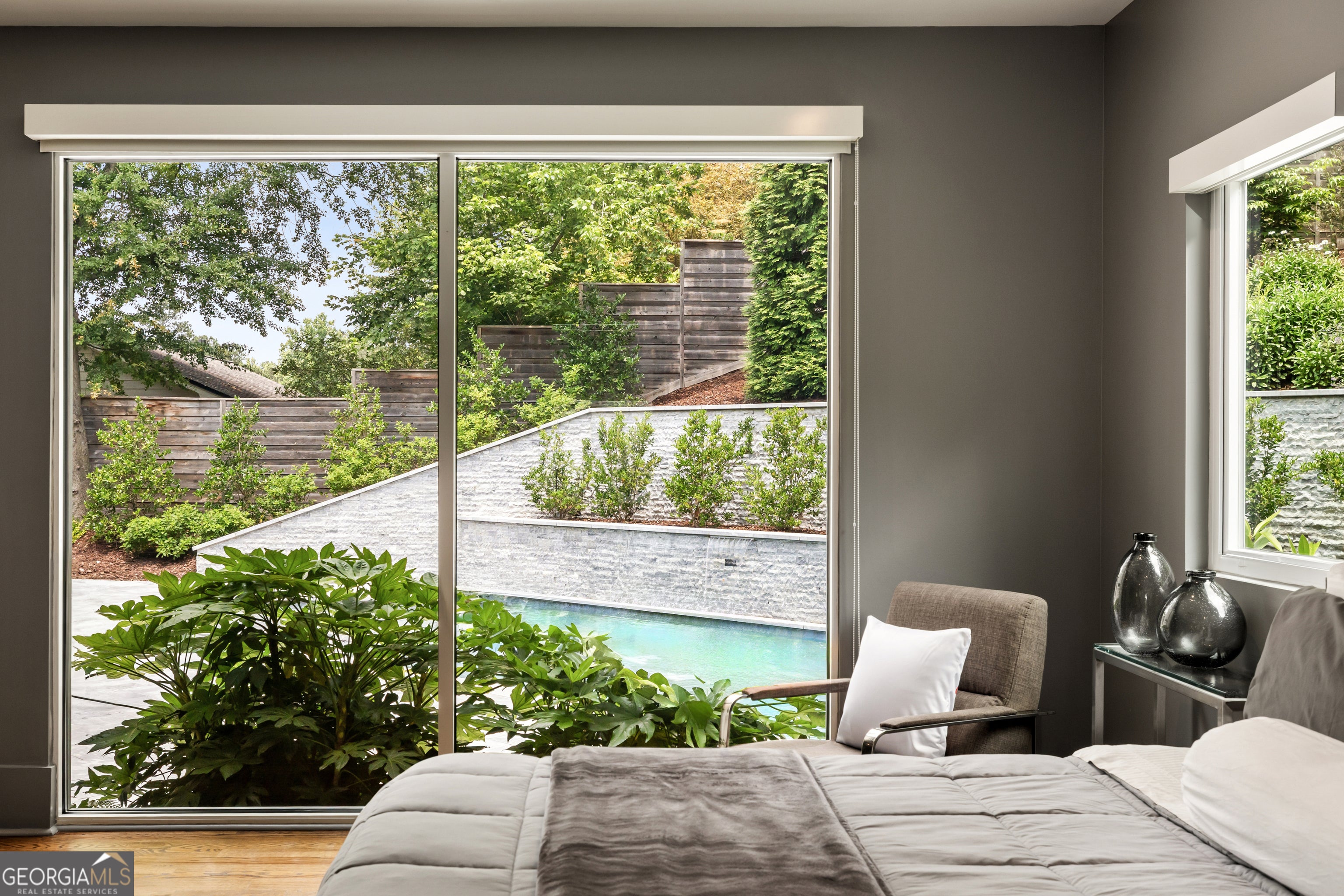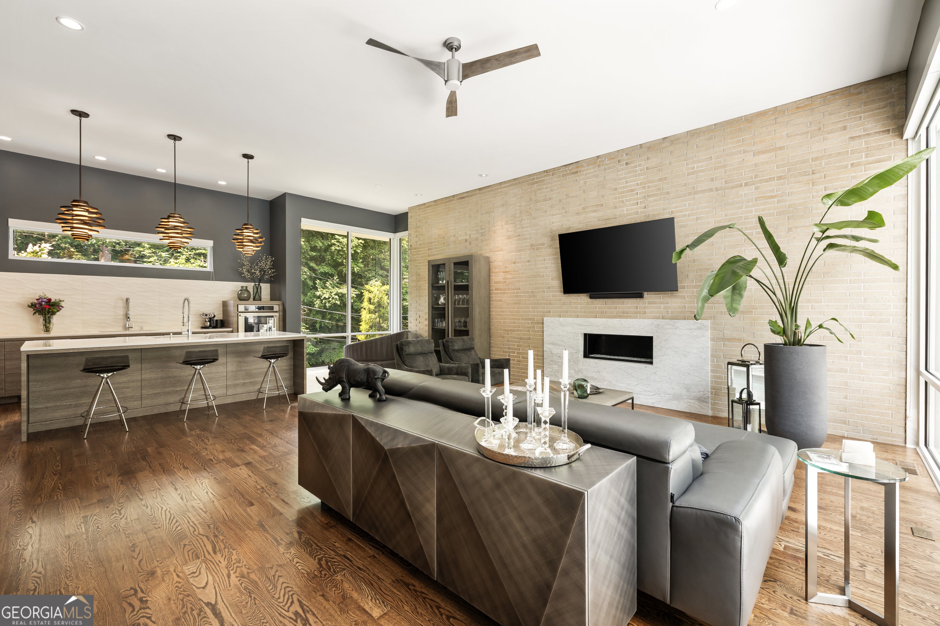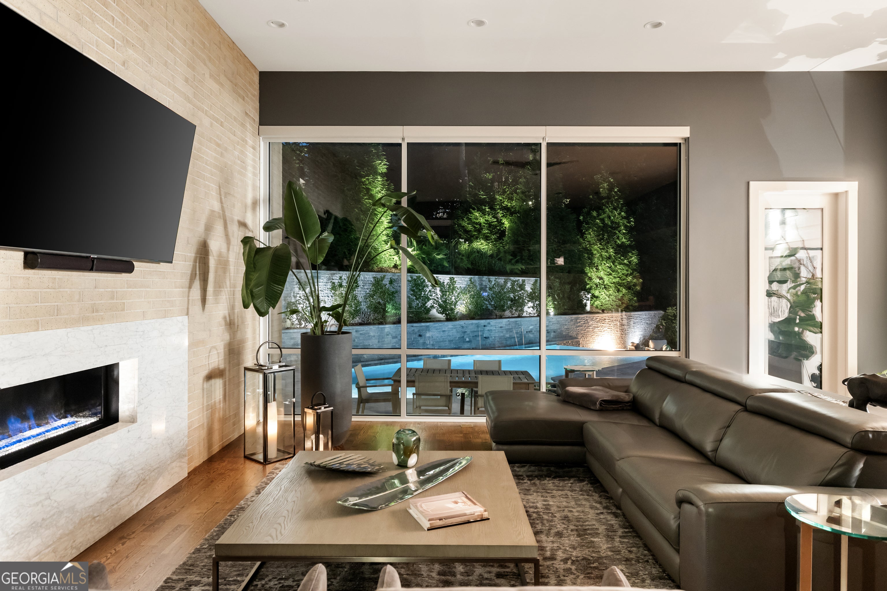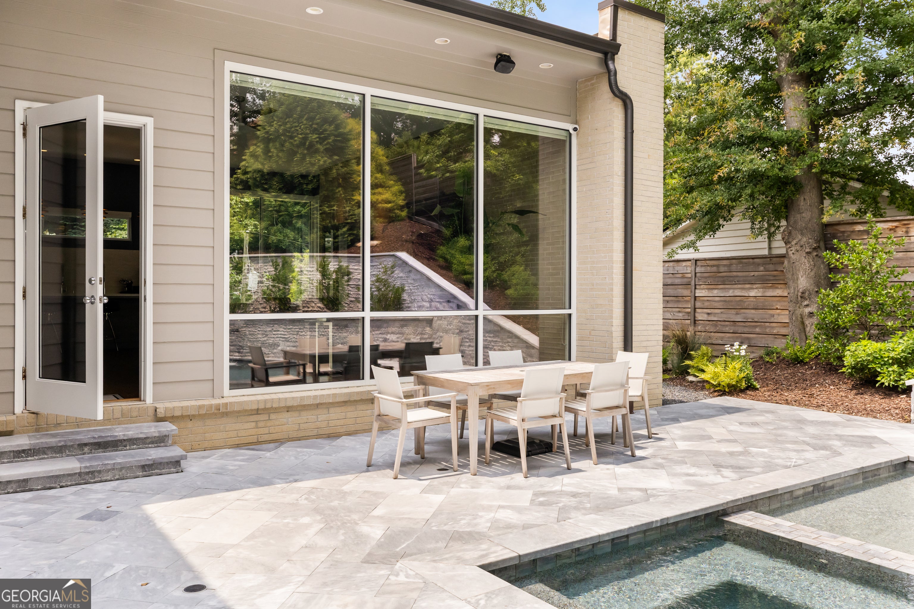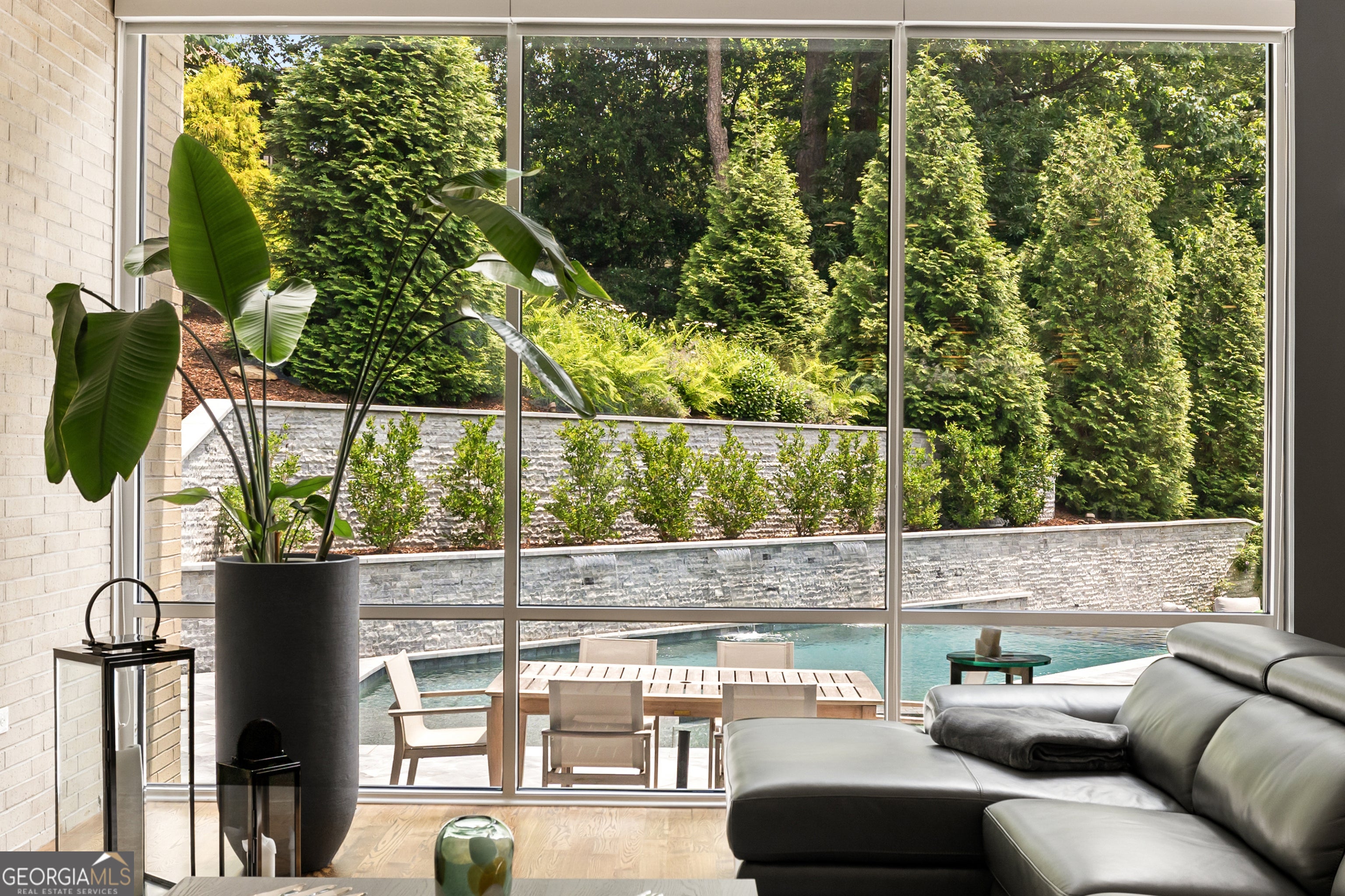 Perched on a quiet hilltop overlooking Lavista Park, this modern showpiece pairs bold architecture with serene privacy. Walls of glass and lush landscaping create dramatic street appeal, while inside, soaring ceilings, a floating glass staircase, and hardwoods throughout set the tone for sophisticated living. Set on one of Lavista Park's best streets, the home opens to a private, resort-style backyard. The outdoor oasis features a new heated PebbleTec saltwater pool with sun shelf, waterfalls, and infinity edge, complemented by marble retaining walls and patios. A fully equipped outdoor kitchen, fire pit, and automated landscape lighting and sound complete the unmatched indoor/outdoor lifestyle. The flexible layout includes a main-level primary suite with spa bath; private guest suites upstairs and on the terrace level; and three indoor plus three outdoor living areas for entertaining. A rooftop terrace with fireplace, wet bar, and skyline views extends the experience above the treetops. Every window is thoughtfully placed to frame dramatic natural landscapes, blurring the line between architecture and nature. At the heart of the home, the chef's kitchen balances clean-lined design with maximum functionality. Features include custom flat-paneled cabinetry, crisp quartz counters, dual full-size sinks, twin dishwashers, double ovens, a walk-in pantry, and an architectural backsplash. A dramatic brick feature wall extends from the exterior into the living spaces, visually connecting the resort-inspired yard to Lavista Park and beyond. Elevator-capable design and a terrace-level multigenerational suite-with second laundry and plumbing for a future kitchen-offer options for long-term guests or extended living. Additional features include a fully finished two-car garage with EV charging, whole-house audio (including rooftop and pool), app-controlled lighting, irrigation, and perimeter fencing with security cameras. A full solar array provides efficient, low-maintenance living through a self-sustaining closed-loop system. Situated in Lavista Park-an architectural enclave celebrated for its leafy streets, green space, and unmatched centrality to Emory, CHOA, the CDC, Midtown, and Buckhead-1242 Wild Creek Trail is not just a residence but a lifestyle destination.