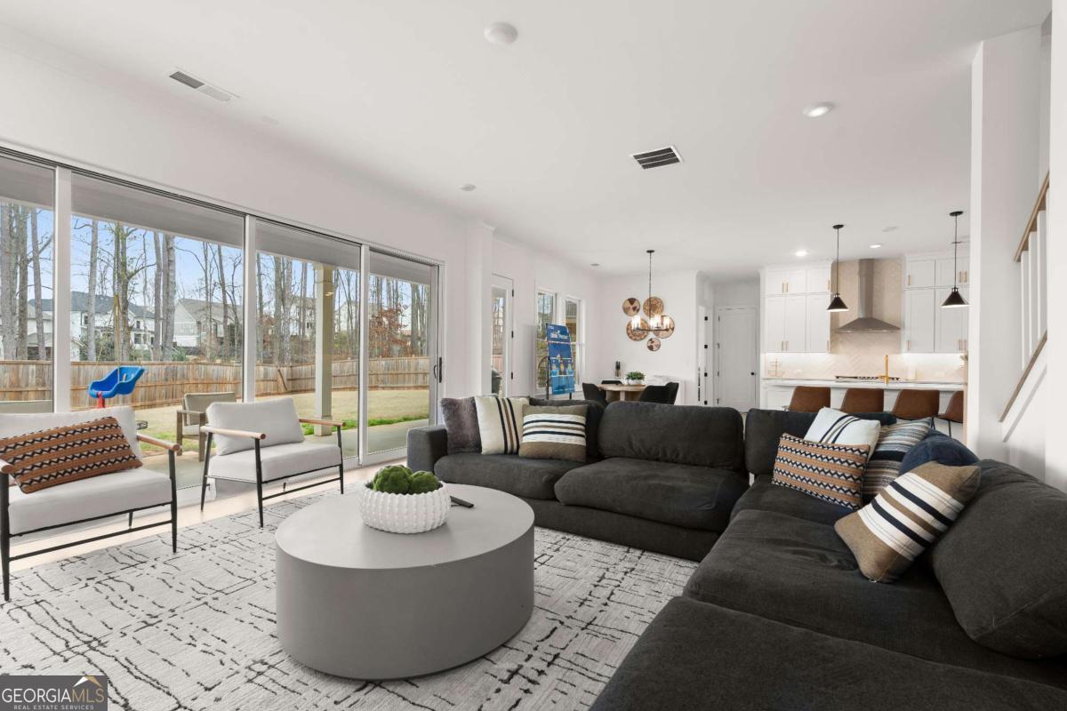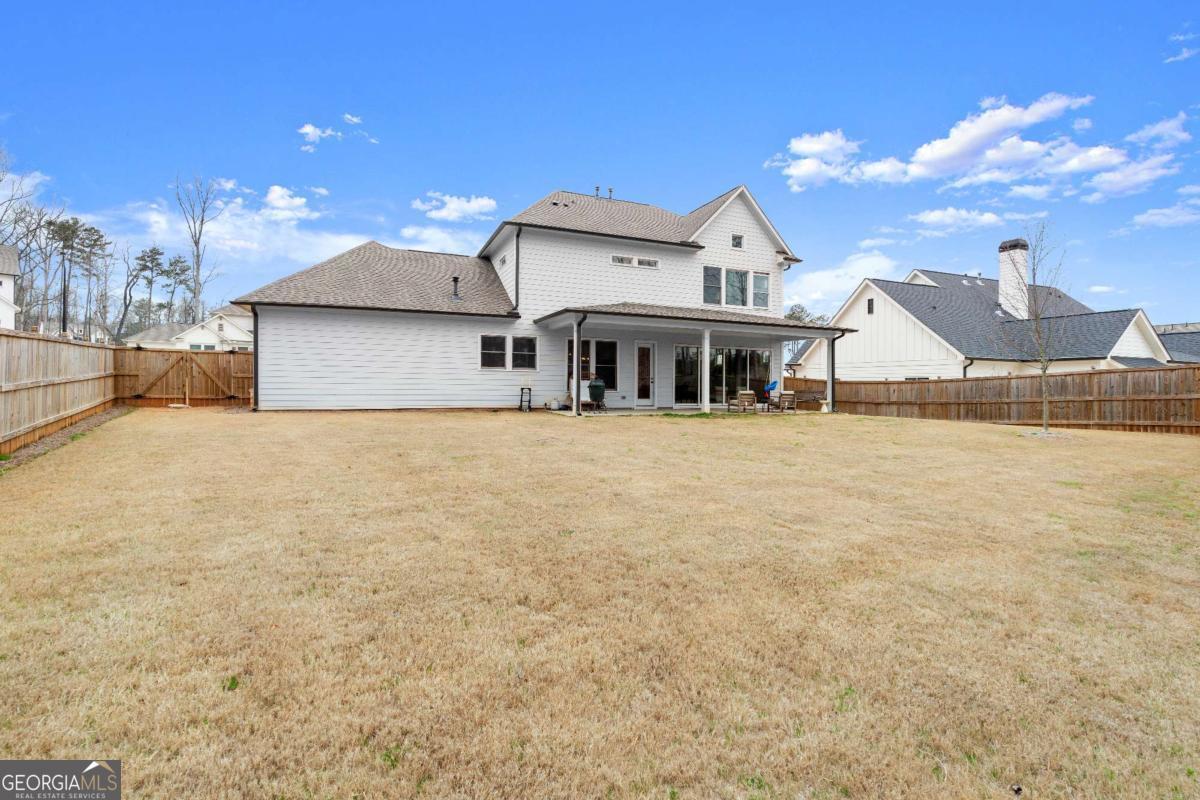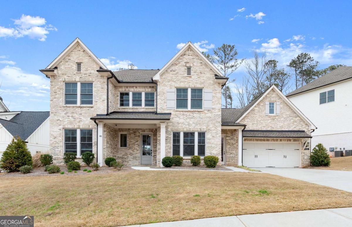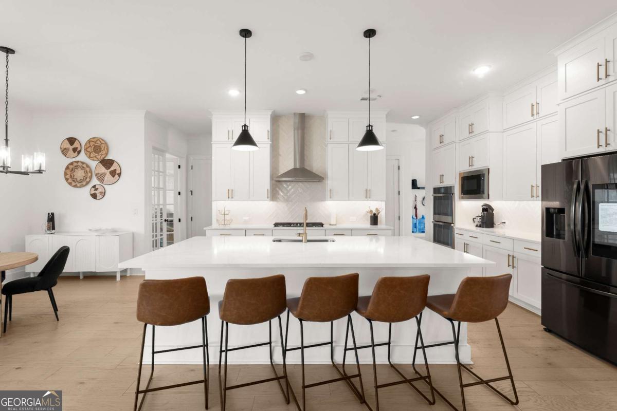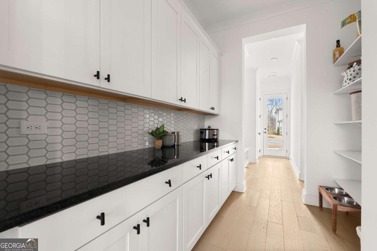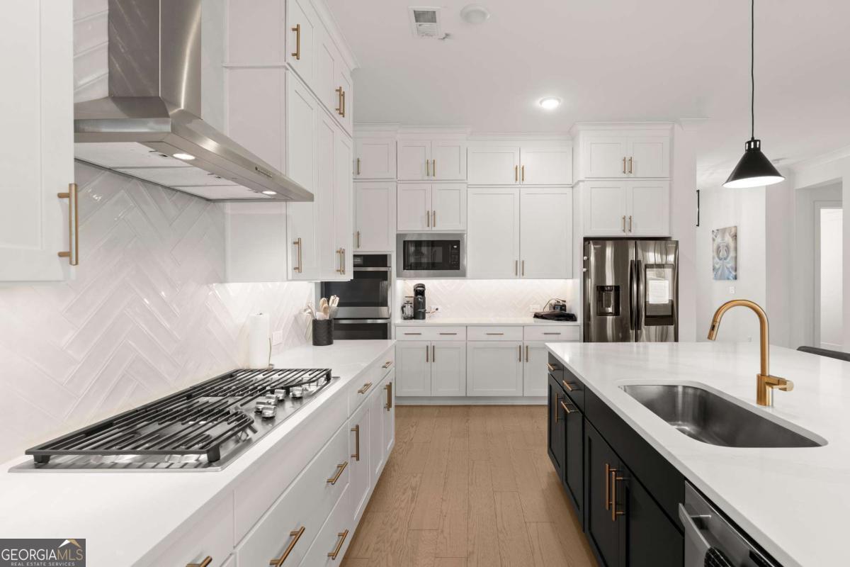 Welcome home to this beautifully appointed 5-bedroom, 4.5-bath residence in an active swim and tennis community, ideally situated in a prime location with a fully fenced backyard and wooded backdrop for added privacy. Charming curb appeal with a brick front exterior, covered front porch, and two-car garage. Inside, the foyer greets you natural-toned hardwood floors that flow seamlessly into a versatile formal living room, perfect as a formal dining room, home office, or flex space. The heart of the home opens into a spacious family and dining area, designed for both everyday living and effortless entertaining. The stunning eat-in kitchen features a large island, elegant herringbone backsplash, double oven, under-cabinet lighting, and a unique galley-style pass-through butler's pantry ideal for storing small appliances and keeping countertops clutter-free while preparing meals or hosting gatherings. Additional main-level highlights include a built-in workspace, mudroom with garage access, and convenient side exit. A bedroom and full bathroom, along with a separate half bath, provide an ideal setup for guests or multi-generational living. Upstairs, a bonus flex space offers endless possibilities for a game room, playroom, media room, or additional living area. The primary suite is a luxurious retreat featuring vaulted ceilings, a double vanity, spacious walk-in closet, and an oversized walk-in shower with dual shower-heads, including a rainfall feature. An additional en-suite bedroom, two more secondary bedrooms, another full bath, and a laundry room with built-in folding counter complete the upper level. Step outside to enjoy the sprawling covered patio and expansive fenced backyard with a peaceful wooded backdrop. Ideally located directly across from the community amenities, you can easily spend afternoons poolside or enjoying the neighborhood offerings, including a pool, tennis courts, pickleball, playground, and more. Conveniently located near Kennesaw State University, Town Center at Cobb, parks, schools, shopping, dining, and year-round entertainment. With nearby highway access for an easy commute, this home offers the perfect blend of comfort, convenience, and lifestyle.