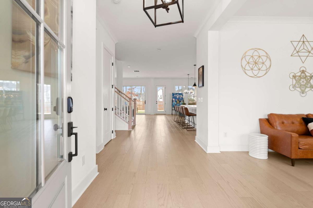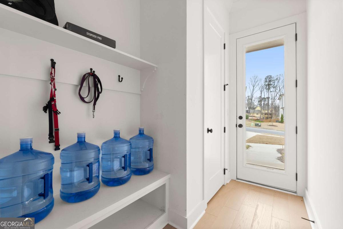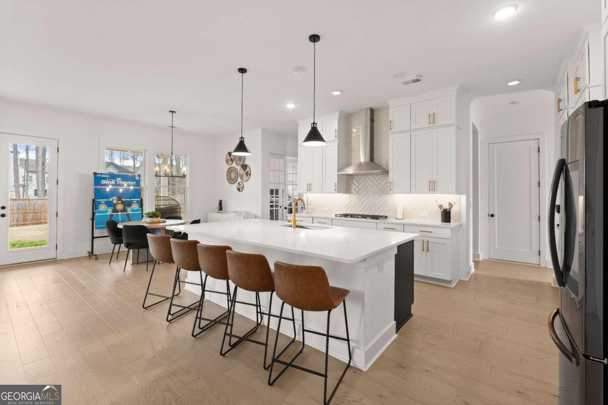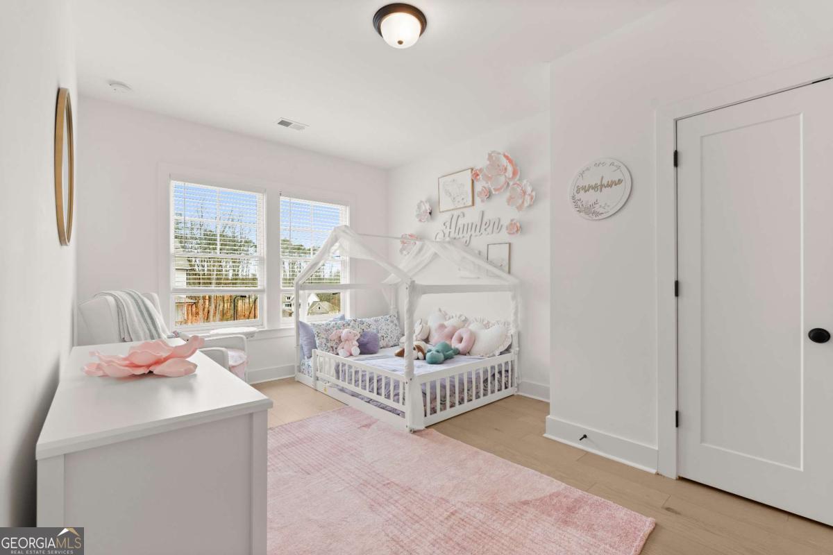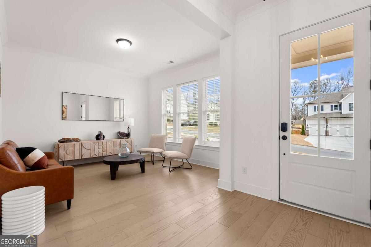 Welcome home to this beautifully appointed 5-bedroom, 4.5-bath residence in an active swim and tennis community, ideally situated in a prime location with a fully fenced backyard and wooded backdrop for added privacy. Charming curb appeal with a brick front exterior, covered front porch, and two-car garage. Inside, the foyer greets you natural-toned hardwood floors that flow seamlessly into a versatile formal living room, perfect as a formal dining room, home office, or flex space. The heart of the home opens into a spacious family and dining area, designed for both everyday living and effortless entertaining. The stunning eat-in kitchen features a large island, elegant herringbone backsplash, double oven, under-cabinet lighting, and a unique galley-style pass-through butler's pantry ideal for storing small appliances and keeping countertops clutter-free while preparing meals or hosting gatherings. Additional main-level highlights include a built-in workspace, mudroom with garage access, and convenient side exit. A bedroom and full bathroom, along with a separate half bath, provide an ideal setup for guests or multi-generational living. Upstairs, a bonus flex space offers endless possibilities for a game room, playroom, media room, or additional living area. The primary suite is a luxurious retreat featuring vaulted ceilings, a double vanity, spacious walk-in closet, and an oversized walk-in shower with dual shower-heads, including a rainfall feature. An additional en-suite bedroom, two more secondary bedrooms, another full bath, and a laundry room with built-in folding counter complete the upper level. Step outside to enjoy the sprawling covered patio and expansive fenced backyard with a peaceful wooded backdrop. Ideally located directly across from the community amenities, you can easily spend afternoons poolside or enjoying the neighborhood offerings, including a pool, tennis courts, pickleball, playground, and more. Conveniently located near Kennesaw State University, Town Center at Cobb, parks, schools, shopping, dining, and year-round entertainment. With nearby highway access for an easy commute, this home offers the perfect blend of comfort, convenience, and lifestyle.