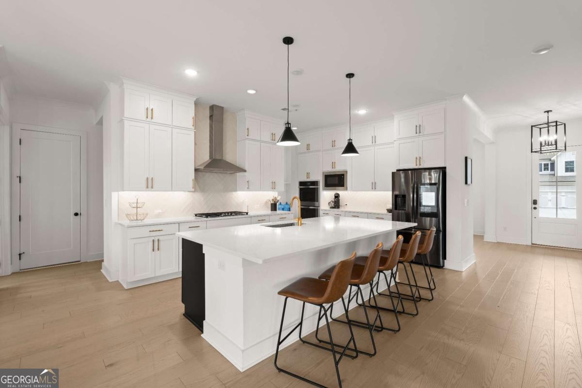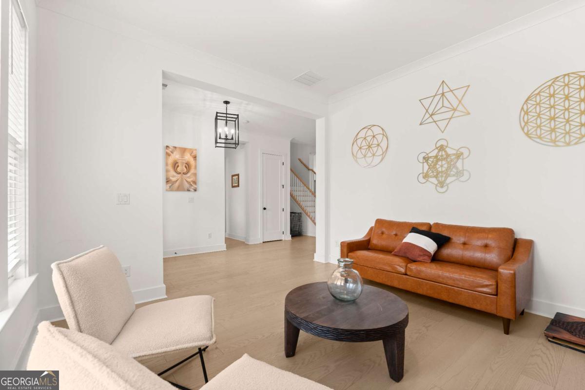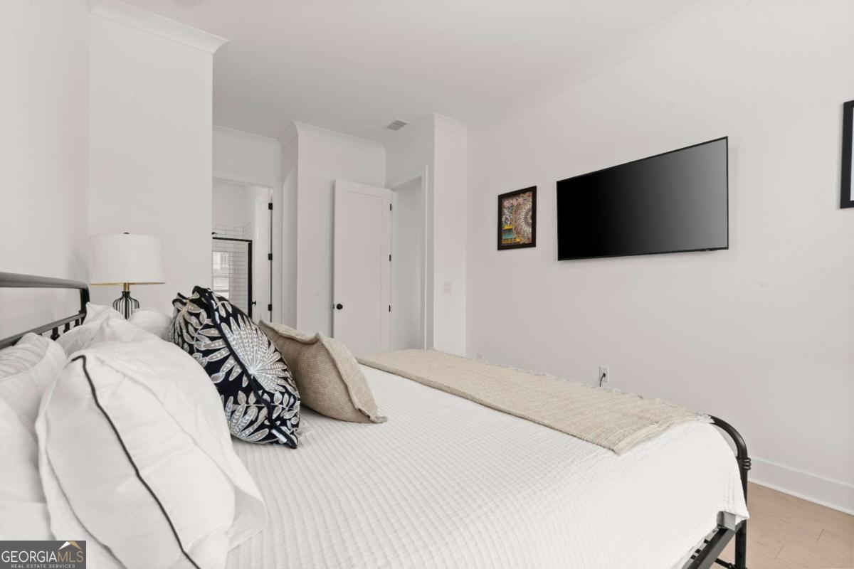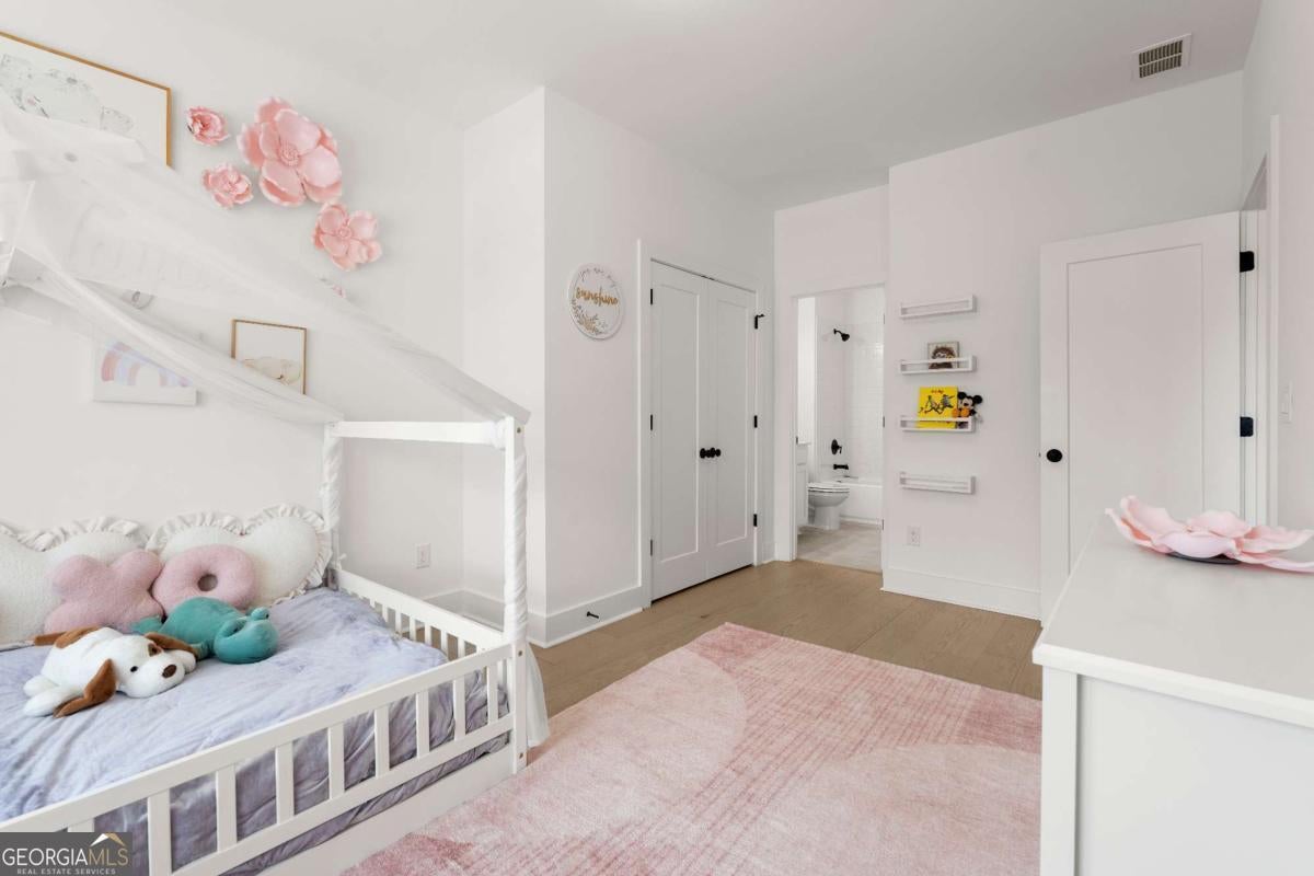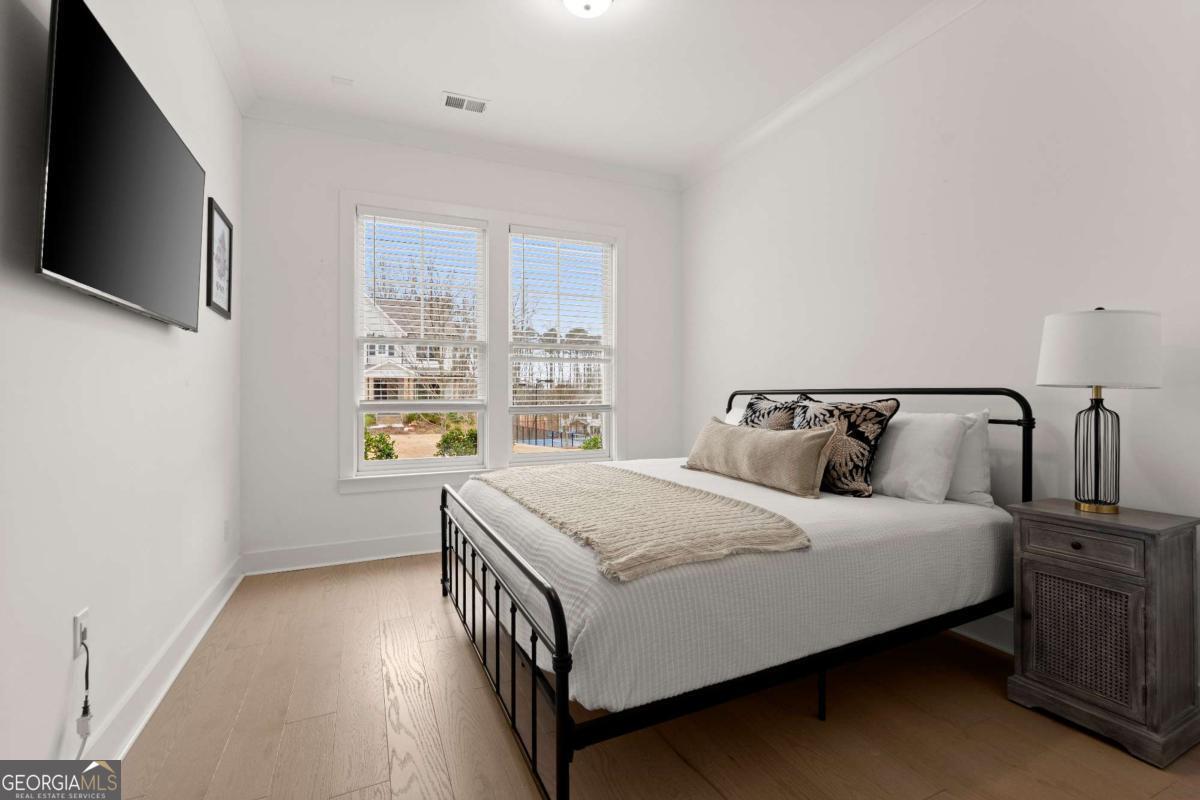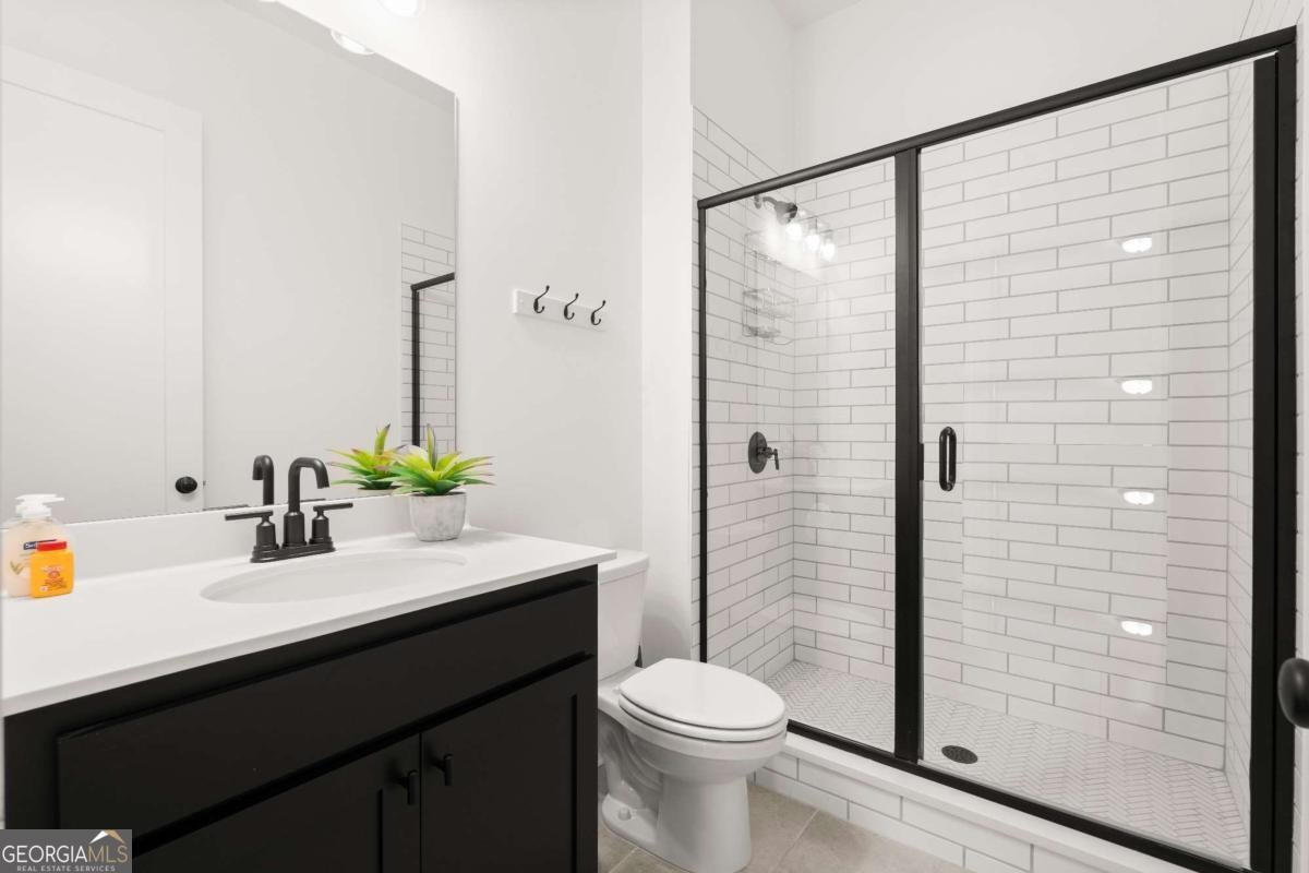 Welcome home to this beautifully appointed 5-bedroom, 4.5-bath residence in an active swim and tennis community, ideally situated in a prime location with a fully fenced backyard and wooded backdrop for added privacy. Charming curb appeal with a brick front exterior, covered front porch, and two-car garage. Inside, the foyer greets you natural-toned hardwood floors that flow seamlessly into a versatile formal living room, perfect as a formal dining room, home office, or flex space. The heart of the home opens into a spacious family and dining area, designed for both everyday living and effortless entertaining. The stunning eat-in kitchen features a large island, elegant herringbone backsplash, double oven, under-cabinet lighting, and a unique galley-style pass-through butler's pantry ideal for storing small appliances and keeping countertops clutter-free while preparing meals or hosting gatherings. Additional main-level highlights include a built-in workspace, mudroom with garage access, and convenient side exit. A bedroom and full bathroom, along with a separate half bath, provide an ideal setup for guests or multi-generational living. Upstairs, a bonus flex space offers endless possibilities for a game room, playroom, media room, or additional living area. The primary suite is a luxurious retreat featuring vaulted ceilings, a double vanity, spacious walk-in closet, and an oversized walk-in shower with dual shower-heads, including a rainfall feature. An additional en-suite bedroom, two more secondary bedrooms, another full bath, and a laundry room with built-in folding counter complete the upper level. Step outside to enjoy the sprawling covered patio and expansive fenced backyard with a peaceful wooded backdrop. Ideally located directly across from the community amenities, you can easily spend afternoons poolside or enjoying the neighborhood offerings, including a pool, tennis courts, pickleball, playground, and more. Conveniently located near Kennesaw State University, Town Center at Cobb, parks, schools, shopping, dining, and year-round entertainment. With nearby highway access for an easy commute, this home offers the perfect blend of comfort, convenience, and lifestyle.