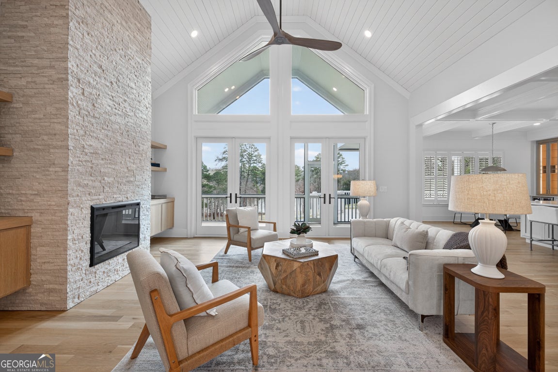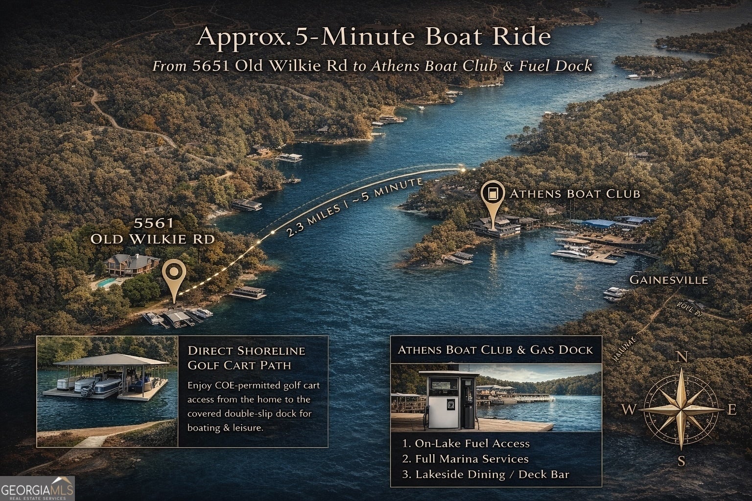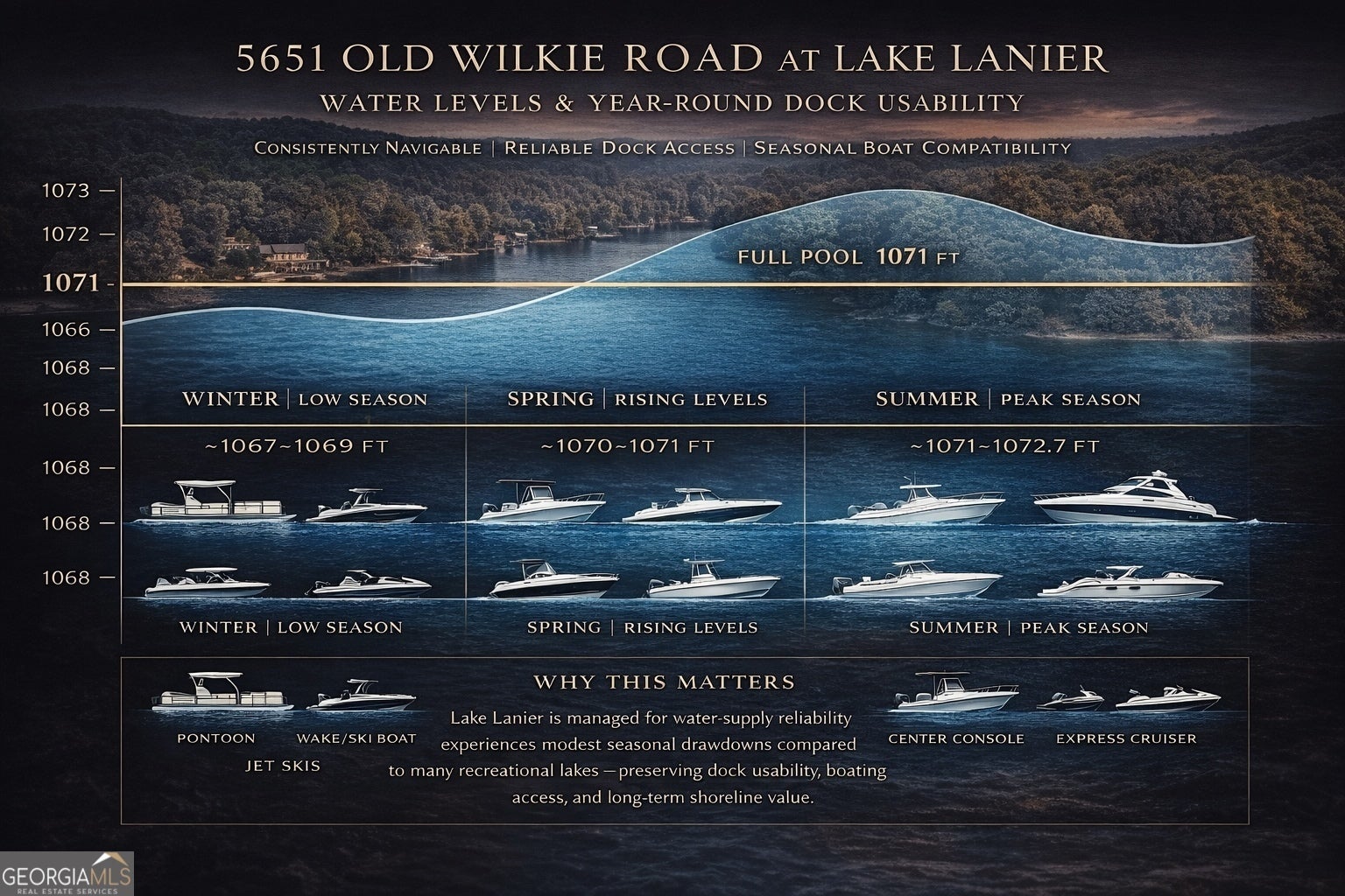 Experience refined lake living on this private and beautifully landscaped 1.5-acre estate, ideally positioned along one of Lake Lanier's most desirable and navigable shoreline corridors. Offering a rare blend of privacy, usability, and long-term value, this thoughtfully updated residence delivers the lifestyle lake buyers seek-without compromise. Inside, the home features an expansive open layout filled with natural light, soaring ceilings, and effortless flow between the main living spaces. A spacious fireside family room anchors the heart of the home, framed by walls of windows that capture tranquil wooded lake views. The gourmet kitchen is equipped with premium appliances, generous prep space, and an inviting layout perfectly suited for both entertaining and everyday living. Formal dining, multiple lounge areas, and seamless indoor-outdoor transitions create a home designed for connection and comfort. The main-level owner's suite serves as a serene private retreat, complete with a spa-inspired bath, walk-in dressing area, and direct access to the pool terrace. Additional guest suites and flexible bonus rooms allow the home to adapt easily for multigenerational living, work-from-home needs, or extended-stay guests. Outdoors, the property transforms into a true private lakefront resort. Enjoy a heated pool with sun shelf, stone terrace, covered entertaining areas, and a fully equipped outdoor grilling kitchen-ideal for hosting or unwinding in total seclusion. The property's rare gentle topography provides exceptional usable yard space, setting it apart from much of Lake Lanier's steeper shoreline and offering flexibility for future enhancements. A defining advantage of this home is its exceptional lake access and dock usability, supported by Lake Lanier's historically stable water levels. During peak boating season, the lake remains at or above full pool, allowing comfortable docking for pontoons, wake and ski boats, center-console vessels, and personal watercraft. Even during seasonal winter drawdowns, the dock remains highly functional, supporting continued use for pontoons, ski and wake boats, jet skis, and other shallow-draft recreational vessels-a meaningful benefit that preserves year-round enjoyment and long-term value. Enhancing everyday convenience, the home is located just approximately five minutes by boat from Athens Boat Club, providing immediate access to on-lake fuel, marina services, and waterfront dining. This exceptionally short run eliminates long trips across the lake, making spontaneous outings, guest use, and weekend entertaining effortless while maintaining the privacy of a quiet residential cove. A COE-deeded mowing permit further elevates the offering, allowing owners to maintain open lake views and enjoy the rare privilege of golf-cart access to the shoreline-an amenity seldom available and highly prized among Lake Lanier properties. Together, these features create a lakefront estate that delivers privacy without isolation, recreation without inconvenience, and luxury without compromise-a compelling opportunity for discerning end users.