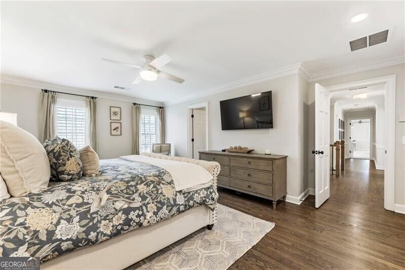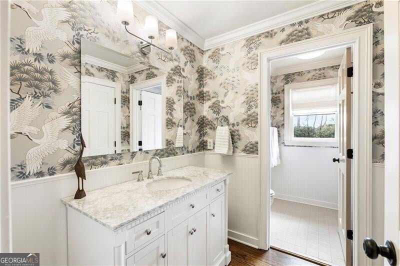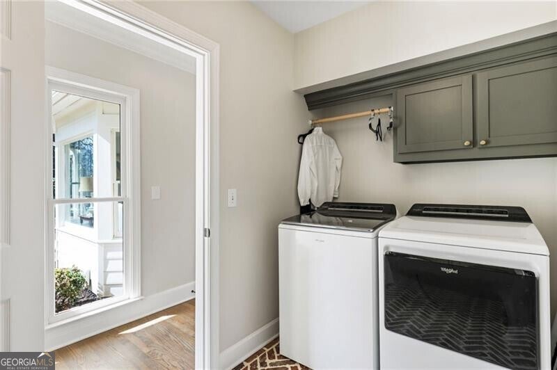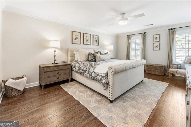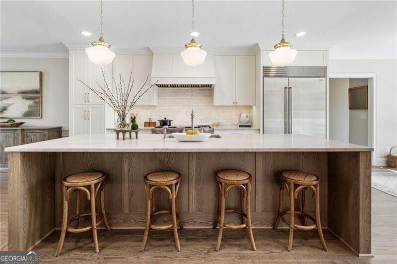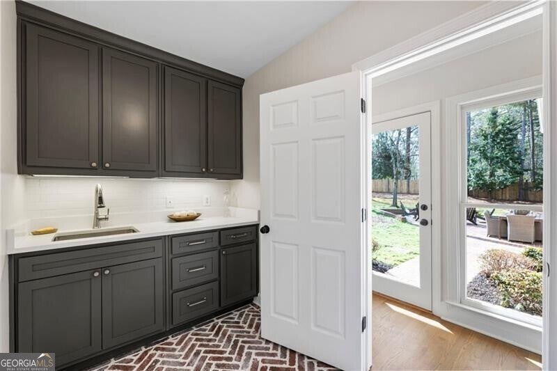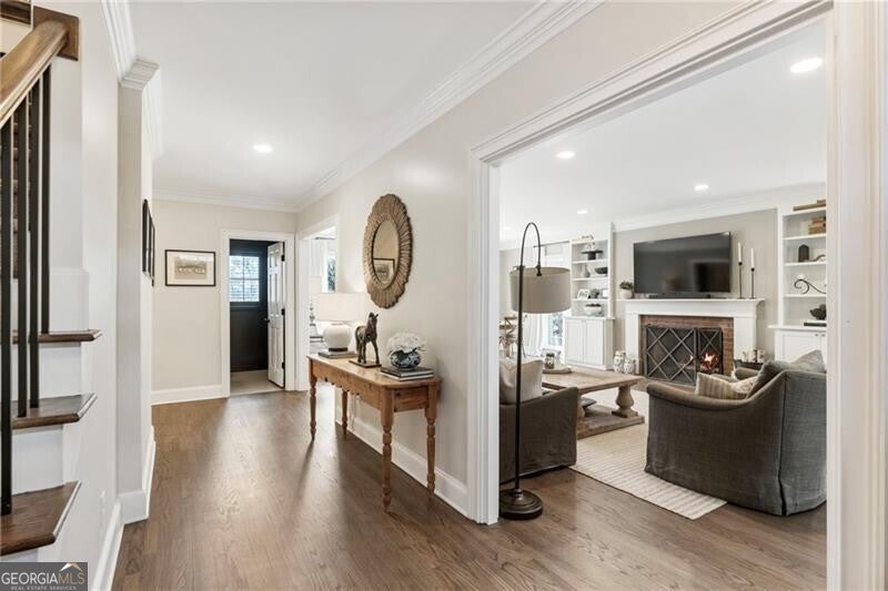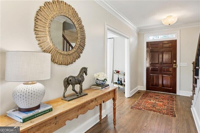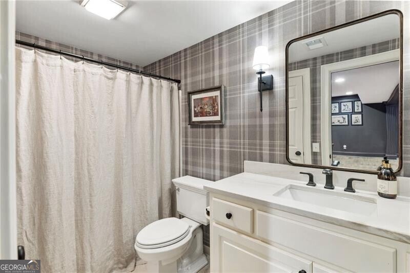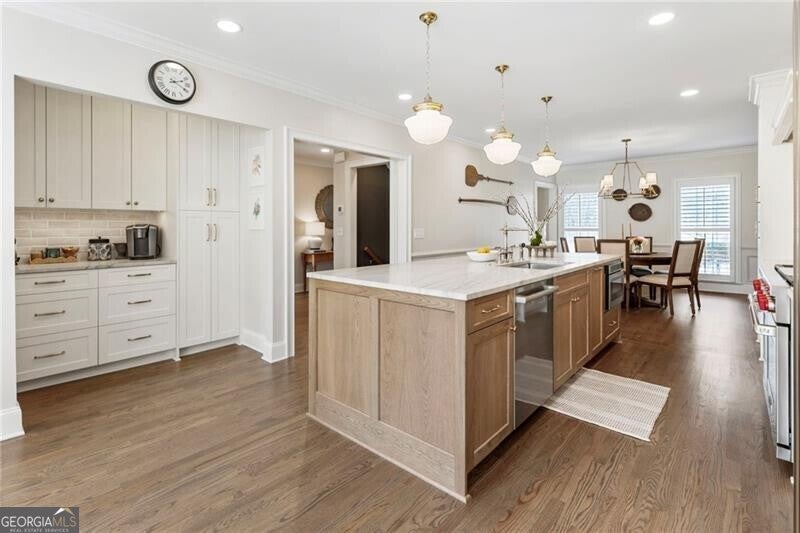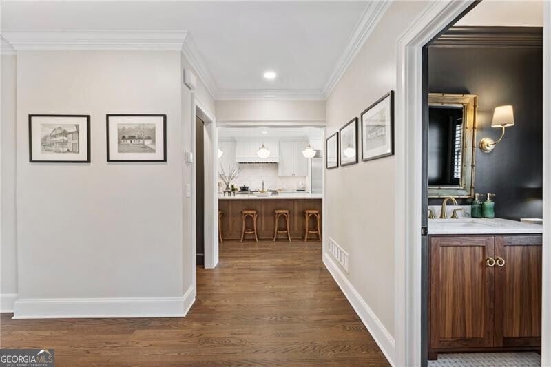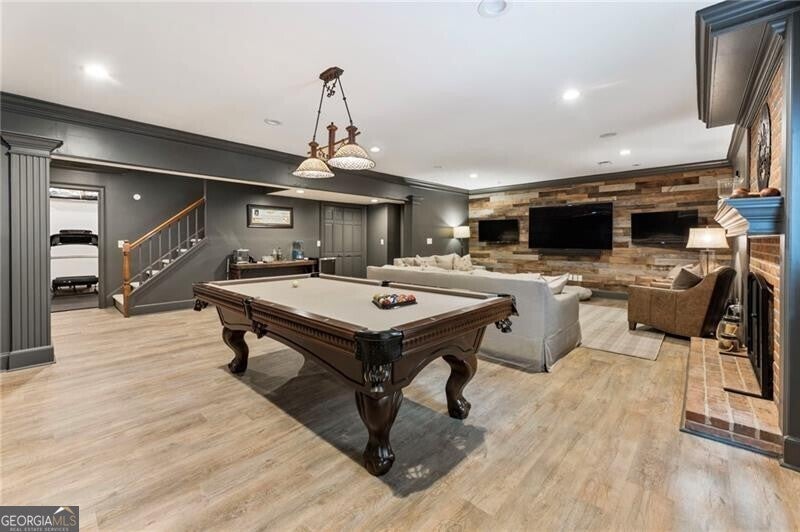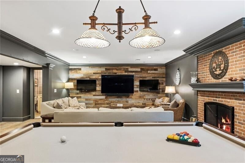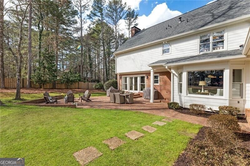 Welcome to this beautifully renovated Williamsburg Colonial, perfectly situated on a private level 1 acre lot that offers both charm and modern luxury. You will see a blend of classic colonial architecture with thoughtful, high end updates throughout. The renovation includes a modernized kitchen with Wolf & Sub-Zero appliances, a 10 foot white oak island, custom cabinets, a built in coffee station with pantry and honed Quartzite counters. The semi open floor plan allows for a smooth transition from room to room and a wonderful flow for entertaining both indoors and outdoors on the brick patio. A dedicated office on the main level offers a bright comfortable space for working with plenty of built in storage. Other notable features include Visual Comfort brand lighting throughout, custom built in shelves, custom mudroom cabinets, brick floor laundry room with plenty of cabinets with Quartz counters, a powder bathroom with custom walnut vanity and marble basketweave flooring. On the second floor, you will find 5 bedrooms and 4 fully updated bathrooms. The cozy primary bedroom offers large double custom closets and a spacious marble bathroom with a deep soaking tub, large shower and a custom white oak double vanity. Having all five bedrooms on the same level offers exceptional functionality while a back staircase leading to two of the largest bedrooms allows for privacy or you have the option to use this space as a bonus room, playroom or In-law suite. The finished basement offers the perfect space for both relaxation and recreation, featuring a pool table and cozy gas fireplace. Features LVP flooring, a barn wood feature wall and a full bathroom. The level backyard has ample space for playing, gardens and a pool! Nestled in between downtown Crabapple and downtown Alpharetta, this location makes it very convenient to walk to enjoy shopping and dining. Top rated schools are just three minutes away. Homes like this one do not come on the market very often!