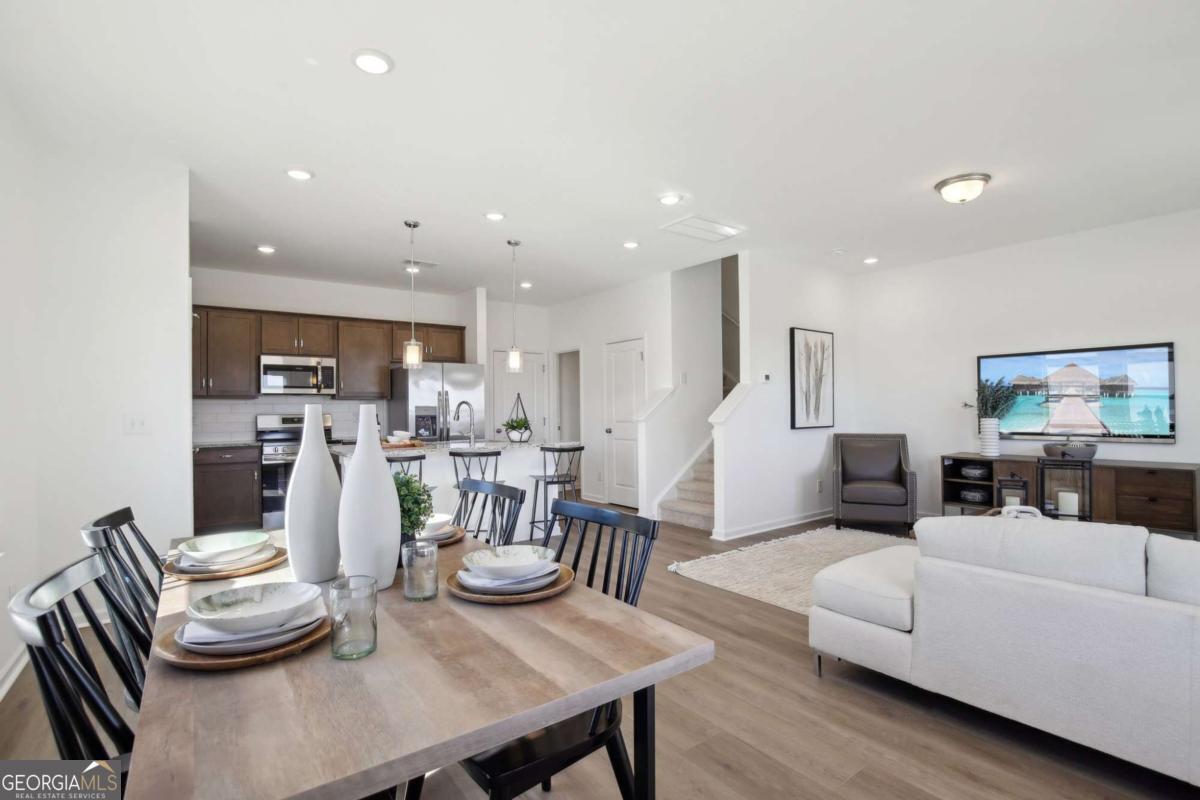 Move in Ready July 2026! The Sussex plan by Smith Douglas Homes in Crescent Towns! This thoughtfully designed rear entry 3BR/2.5BA end-unit townhome offers comfort, convenience, and functionality throughout. The two-car rear garage leads to a kitchen with upgraded cabinetry, granite countertops, and a large center island. The cozy dining area is open to the kitchen and family room, with a convenient exit to the expansive front porch. There is also, a linear fireplace in the family room. Upstairs, the owner's suite features double vanities, a separate shower, garden tub and a spacious walk-in closet. Two bedrooms, a full hall bath, and a second-floor laundry room provide convenience for household chores. Nine-foot ceilings on both levels create a spacious, airy feel throughout. Residents will also enjoy a planned community pool with cabana and lawn maintenance included through the HOA-making this home as effortless as it is elegant. Photos representative of plan not of actual home. Agent is not onsite at present time. Please contact Wendy Williams for further information and to set up an appointment.