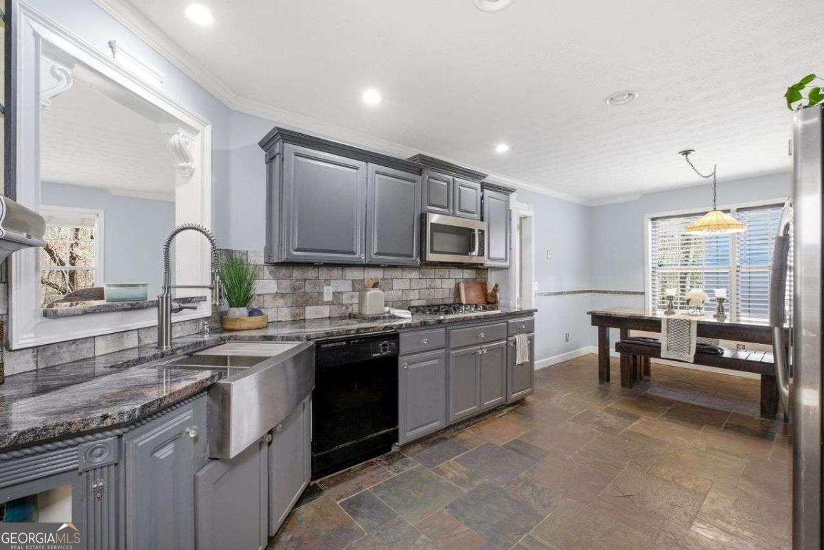 BACK ON MARKET DUE TO NO FAULT OF SELLER! MOTIVATED SELLER! Beautifully crafted, distinctive 3-bedroom with additional bedroom in basement. Custom craftsmanship and natural textures create a warm, elevated living experience. From the moment you enter, the home makes a statement with its natural stone tile flooring and rich wood detailing. The remodeled kitchen is both stylish and functional, featuring custom cabinetry and authentic stone wall accents that add depth, character, and architectural interest rarely found in today's homes. Just off the kitchen, a sun-drenched sunroom offers a tranquil retreat; perfect for morning coffee, journaling, meditation, or simply unwinding in a peaceful setting overlooking the massive backyard. Home warranty included, preferred lender offering 1st year rate buy down, assumable loan