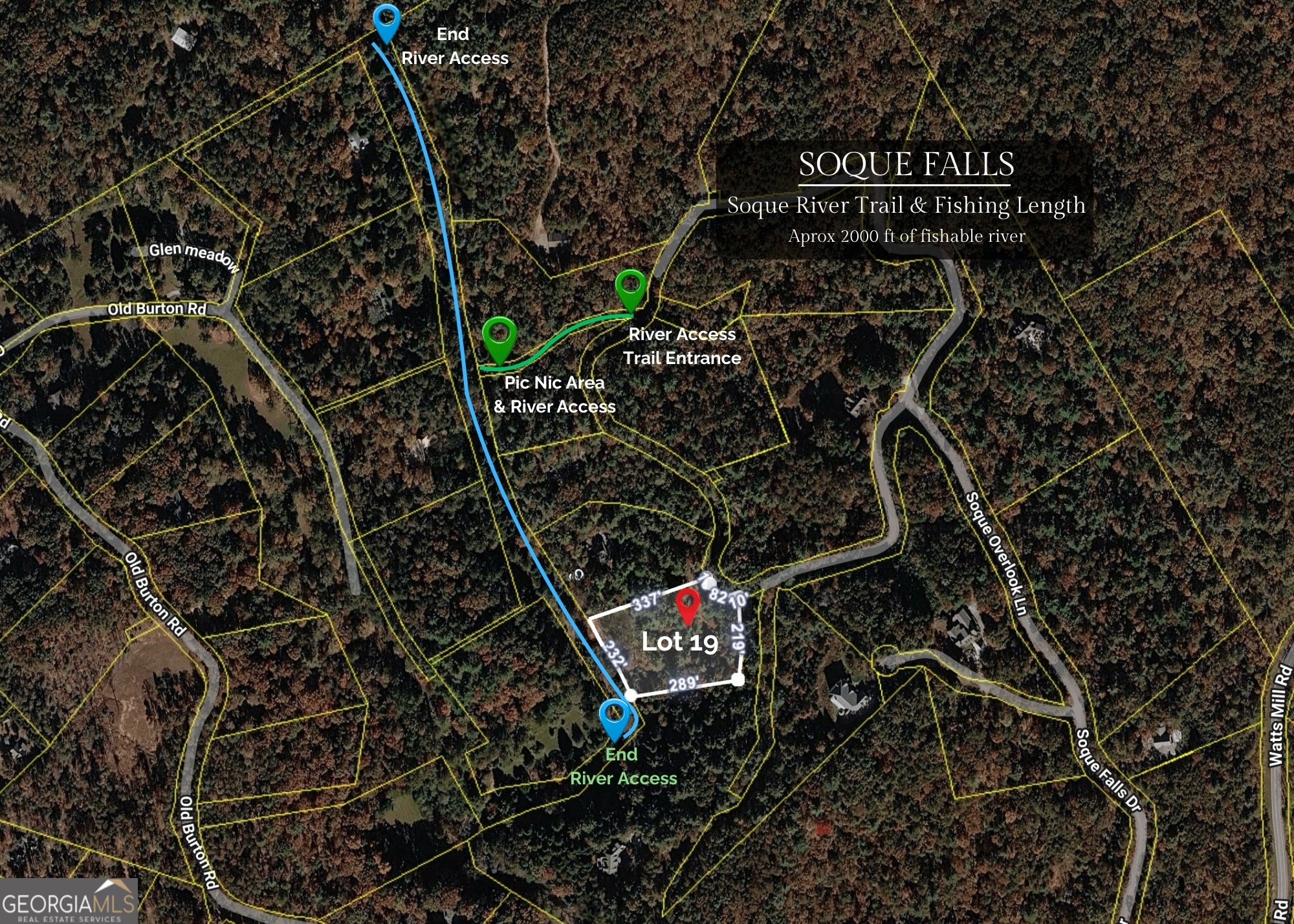 Homesite 19 - Soque Falls | Rare opportunity to own on the highly sought-after north section of the Soque River. This beautiful 2-acre riverfront homesite offers more than 200 feet of pristine river frontage along with access to approximately 2,000 feet of additional stocked river frontage within the private Soque Falls community-an ideal setting for those seeking peace, nature, and world-class fly fishing. Practical details are already in place-soil tests and a site plan are available upon request, helping streamline the process of planning your riverfront vision within site and sound of the water. The property features mostly gentle terrain with an easy, gradual entry to the water, making the river highly wadeable and enjoyable for anglers and nature lovers alike. This private section of the Soque River is renowned for its trophy trout waters, carefully managed, stocked, and regularly fed, creating one of the premier fly-fishing destinations in Northeast Georgia. A recently cleared walkway allows you to easily explore the property and experience the beauty of the river firsthand, while clearly marked boundary lines make touring simple. The area is rich with wildlife and natural beauty, providing a peaceful setting that feels truly tucked away in the mountains. Residents of the community also enjoy private access to the expansive trails and wilderness of the Chattahoochee National Forest, offering endless opportunities for hiking, exploring, and outdoor recreation. Perfectly positioned to balance seclusion and convenience, the property is just a short drive from shopping, dining, and medical services in Clarkesville, and close to the outdoor recreation of Lake Burton, scenic waterfalls, and miles of hiking trails. A rare chance to own a piece of one of North Georgia's most desirable trout streams-where peaceful mountain living meets exceptional riverfront adventure.