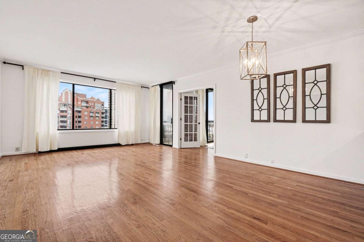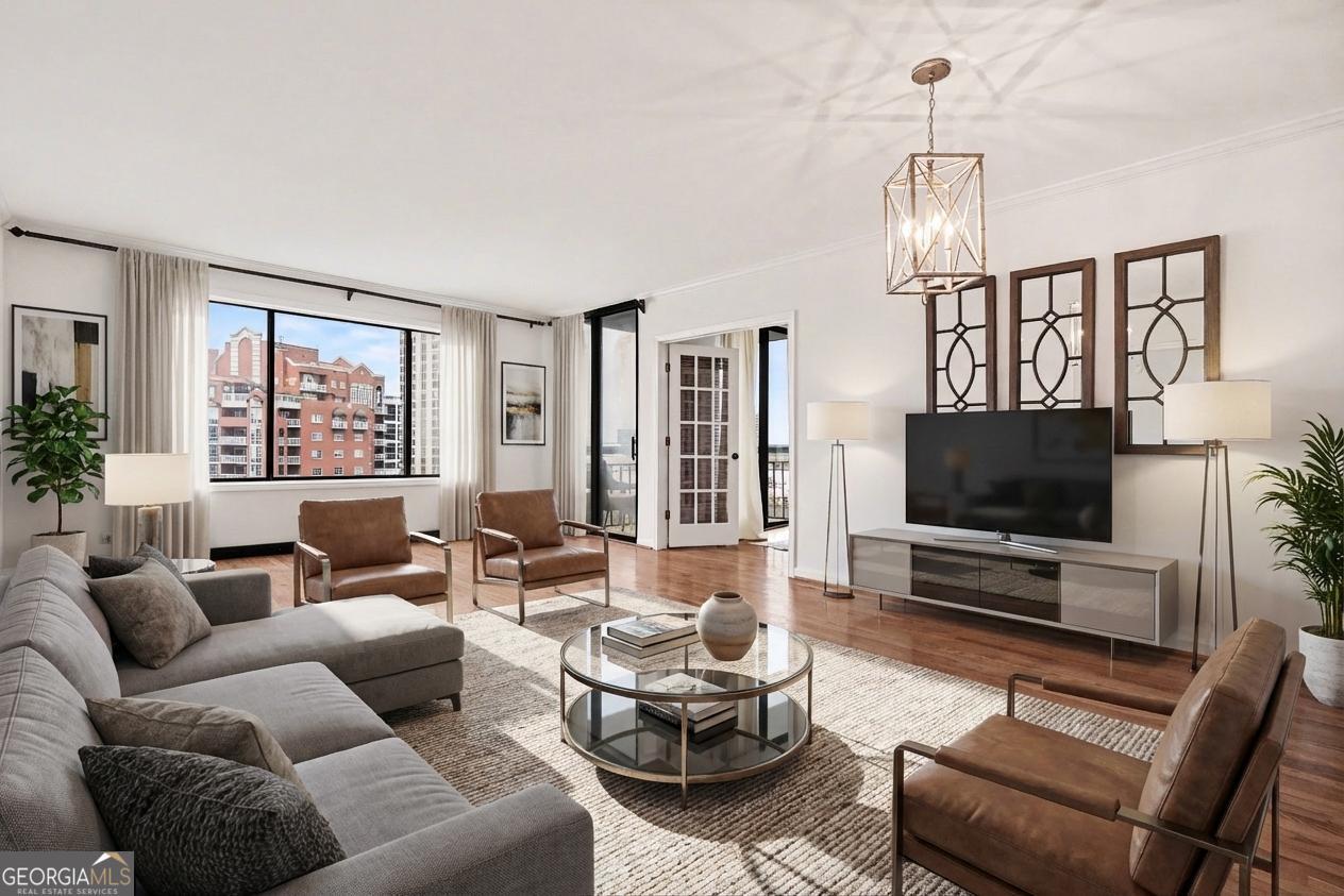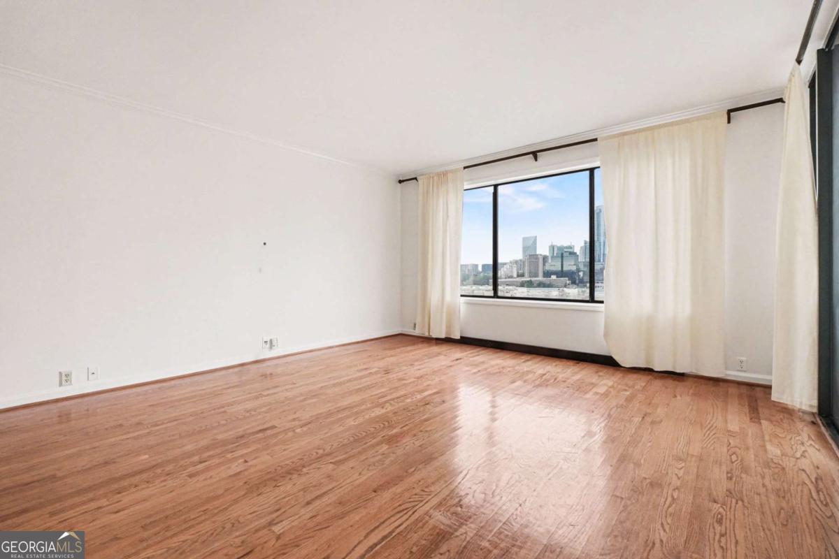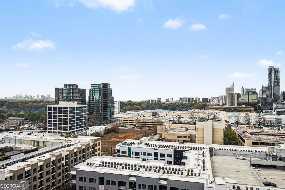 Welcome to your luxurious 22nd floor corner residence at The Grandview - a move-in ready 2BR, 2BA home featuring breathtaking sunrise views toward Stone Mountain and sweeping city skylines. Thoughtful upgrades shine throughout, including custom hardwood floors, designer lighting, and elegant built-in bookcases that add warmth and character. The gourmet kitchen offers granite countertops, premium appliances and walk-in pantry with laundry connections. The expansive primary suite features double closets, private balcony access, and a spa-style bath with frameless walk-in shower, dual vanities, and custom-lit mirrors. The spacious second bedroom includes a walk-in closet, balcony access, and direct bathroom entry. Residents enjoy assigned garage parking, visitor parking, and resort-style amenities including a pool, hot tub, sauna, fitness center, club lounge, theater room, business center, grilling terrace, library, EV charging, and 24-hour gated concierge service. Perfectly located near Marie Sims Park, Path400, Lenox Square, Lifetime Fitness, and the Lenox MARTA Gold Line. HOA includes water and sewer. Experience elevated Buckhead living at The Grandview.