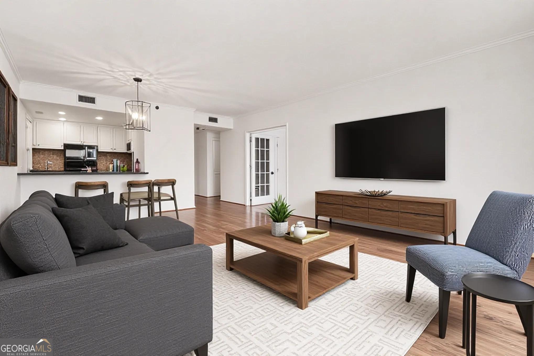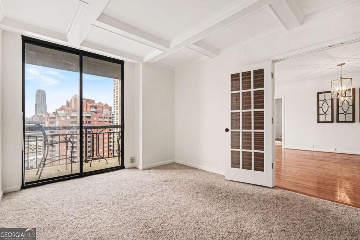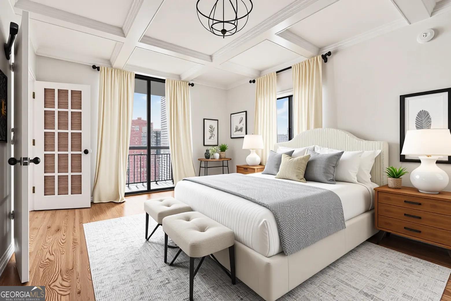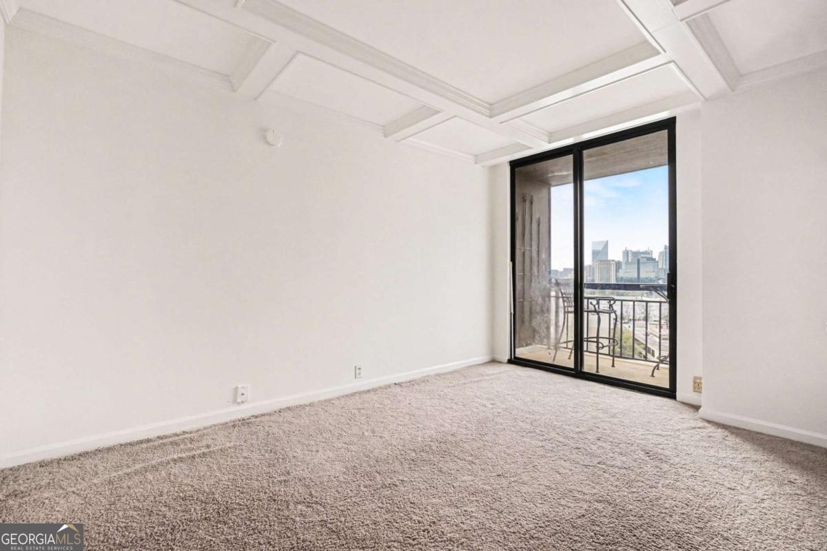 Welcome to your luxurious 22nd floor corner residence at The Grandview - a move-in ready 2BR, 2BA home featuring breathtaking sunrise views toward Stone Mountain and sweeping city skylines. Thoughtful upgrades shine throughout, including custom hardwood floors, designer lighting, and elegant built-in bookcases that add warmth and character. The gourmet kitchen offers granite countertops, premium appliances and walk-in pantry with laundry connections. The expansive primary suite features double closets, private balcony access, and a spa-style bath with frameless walk-in shower, dual vanities, and custom-lit mirrors. The spacious second bedroom includes a walk-in closet, balcony access, and direct bathroom entry. Residents enjoy assigned garage parking, visitor parking, and resort-style amenities including a pool, hot tub, sauna, fitness center, club lounge, theater room, business center, grilling terrace, library, EV charging, and 24-hour gated concierge service. Perfectly located near Marie Sims Park, Path400, Lenox Square, Lifetime Fitness, and the Lenox MARTA Gold Line. HOA includes water and sewer. Experience elevated Buckhead living at The Grandview.