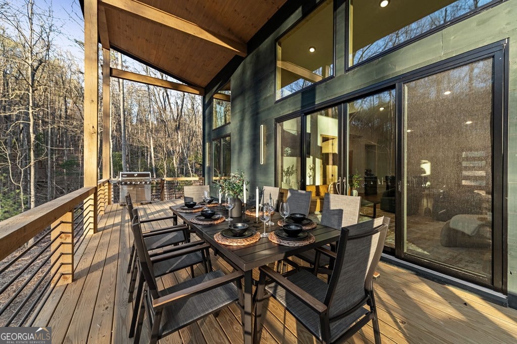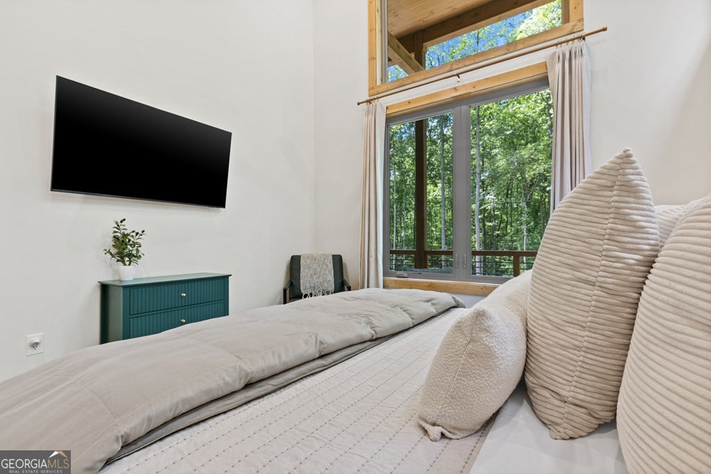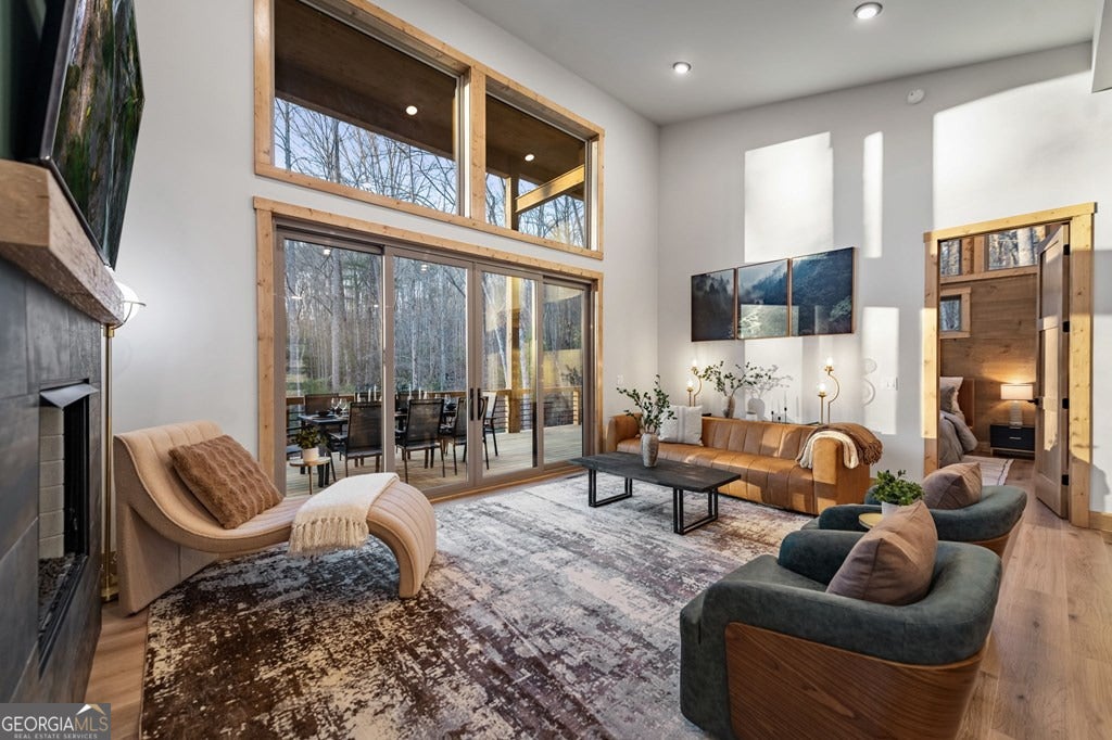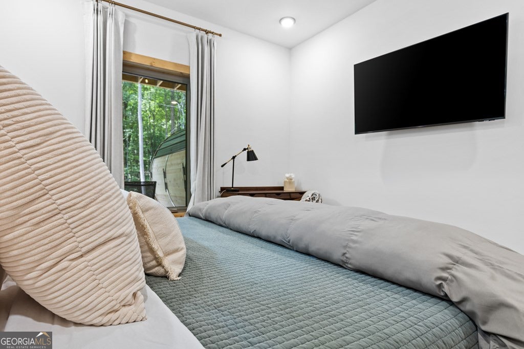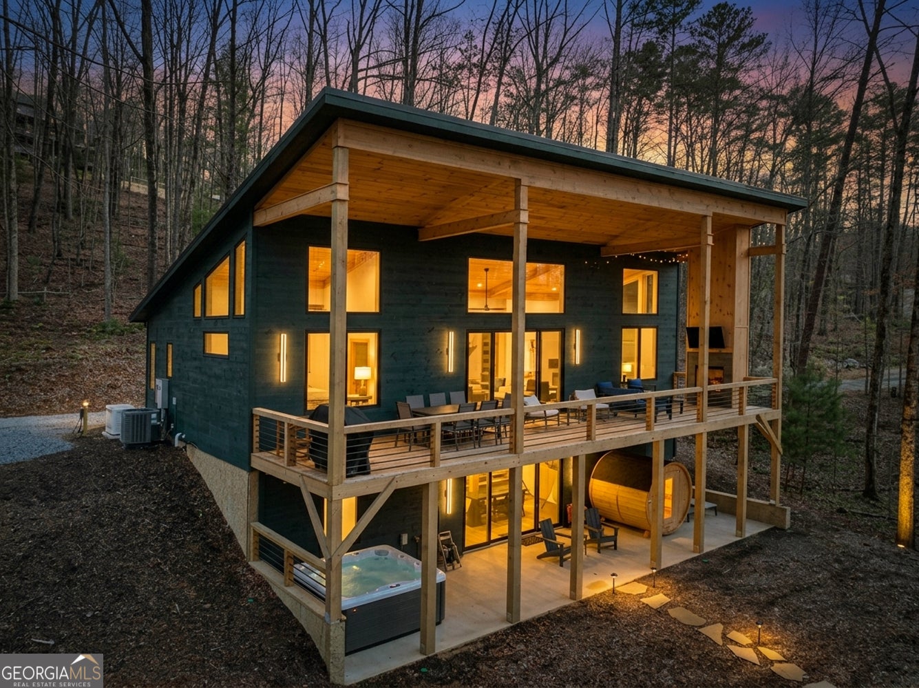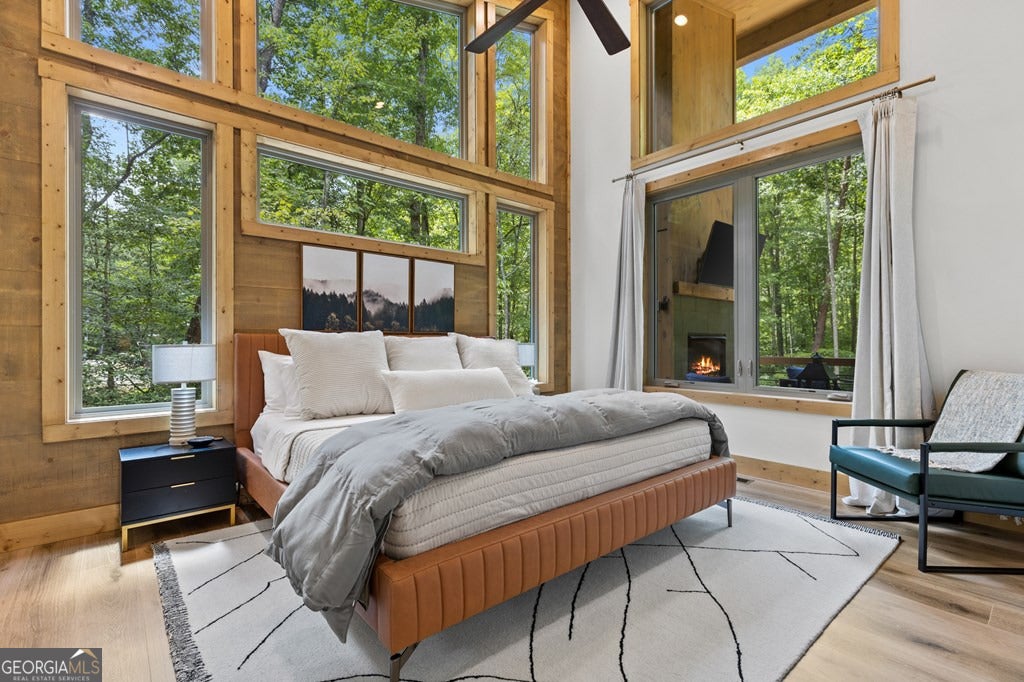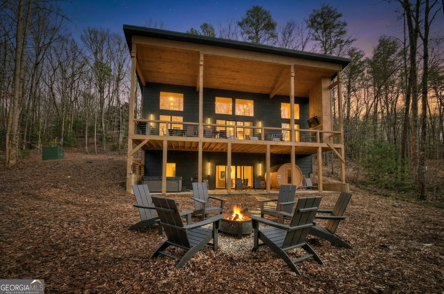 Welcome to Blue Fern-where refined luxury meets the unhurried beauty of the North Georgia mountains. Tucked at the end of a quiet cul-de-sac on 1.22 private, usable acres, this like new, fully furnished retreat redefines the Blue Ridge cabin experience. The open-concept main level flows perfectly with a chef's kitchen featuring JennAir appliances, a 36" gas range, custom cabinetry, and a dedicated coffee bar. The primary suite offers wooded views and a spa-caliber ensuite with soaking tub, custom tile shower, and dual vanities. A second main-level bedroom enjoys its own beautifully finished bath. The finished terrace level features a large bunk room sleeping six, an additional bedroom, full bath, wet bar, and dedicated fitness area-ideal for groups or maximizing rental potential. Outside, level usable grounds-rare in the mountains-are appointed with covered living spaces, a wood-burning fireplace, fire pit, hot tub, and private barrel sauna. Additional highlights include a whole-house generator, EV charging station, and tankless hot water heater. Just 10 minutes from downtown Blue Ridge and Lake Blue Ridge-the perfect balance of seclusion and convenience. 3 BR + Bunk Room 3 BA 1.22 Acres Turnkey & Fully Furnished STR-Ready