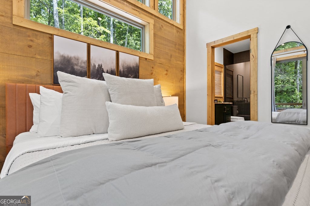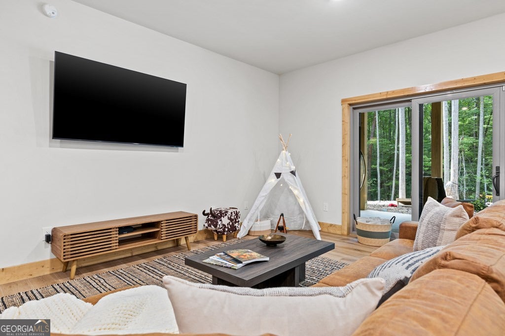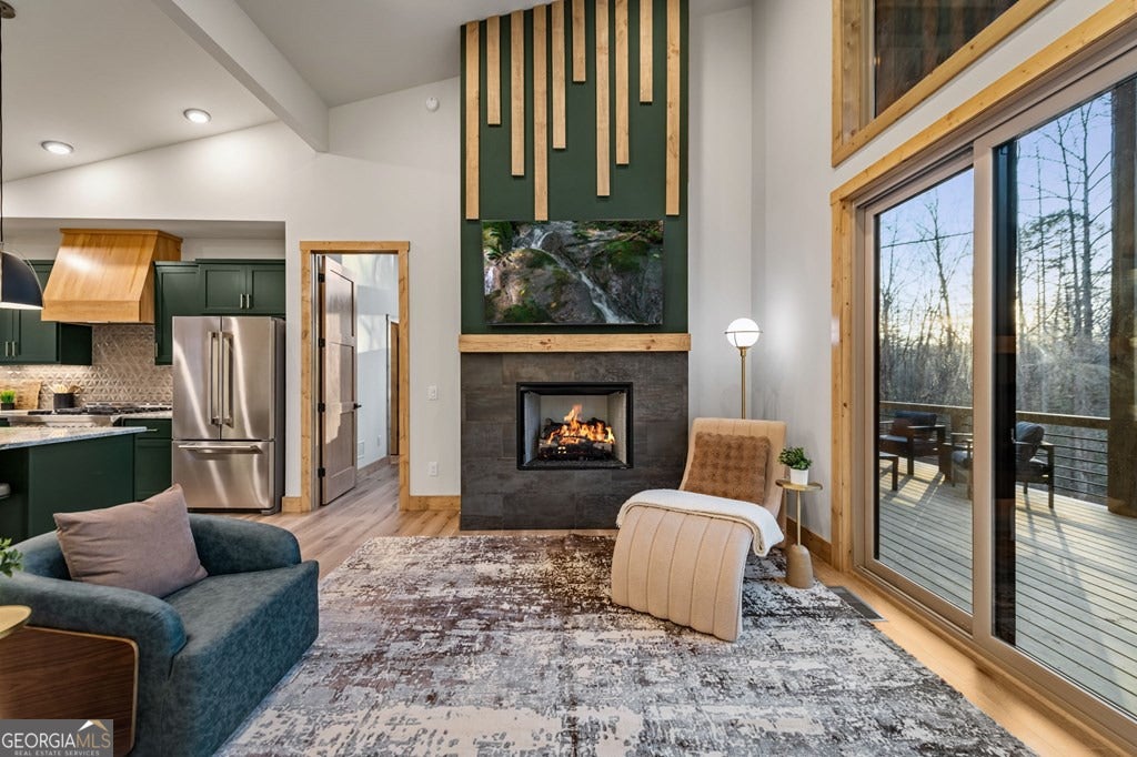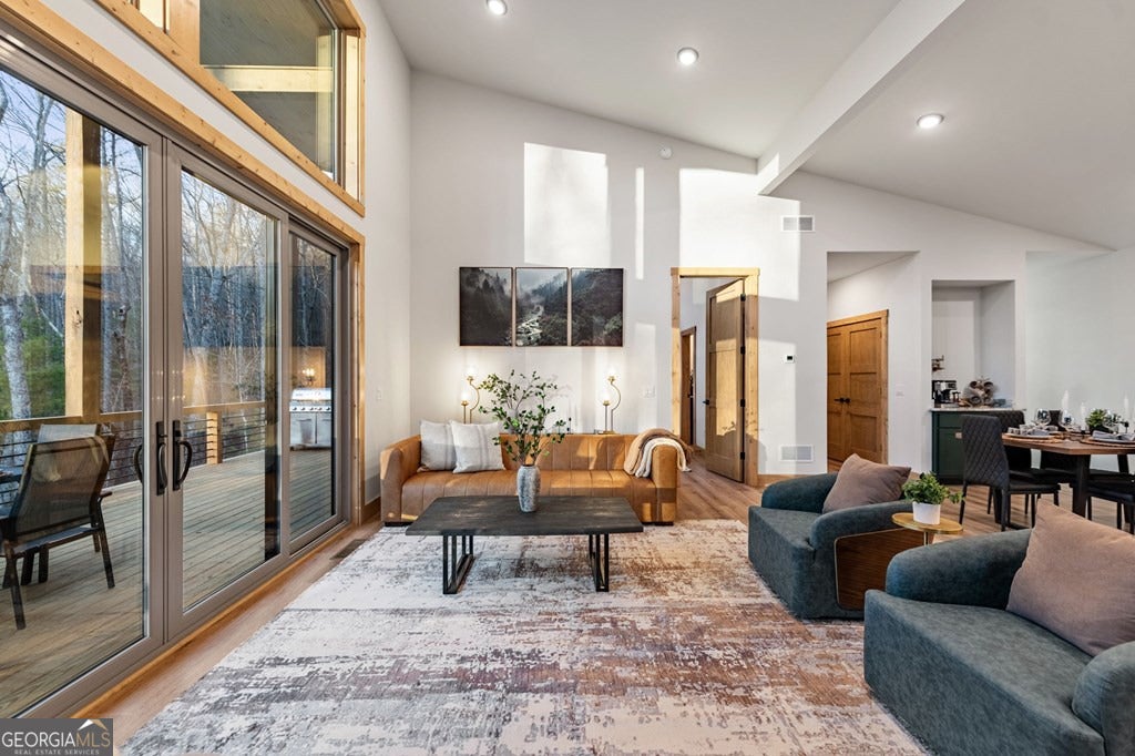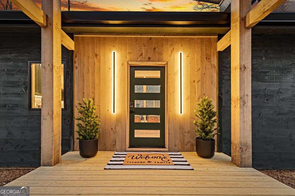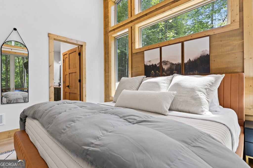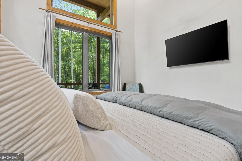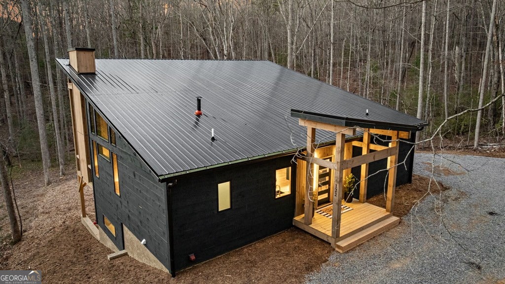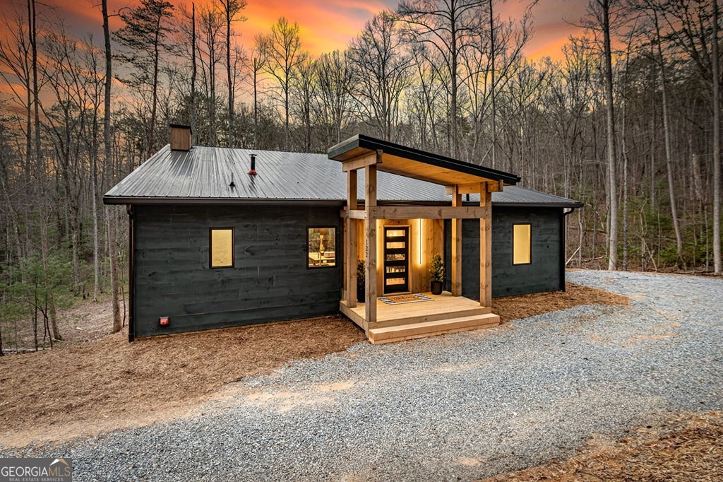 Welcome to Blue Fern-where refined luxury meets the unhurried beauty of the North Georgia mountains. Tucked at the end of a quiet cul-de-sac on 1.22 private, usable acres, this like new, fully furnished retreat redefines the Blue Ridge cabin experience. The open-concept main level flows perfectly with a chef's kitchen featuring JennAir appliances, a 36" gas range, custom cabinetry, and a dedicated coffee bar. The primary suite offers wooded views and a spa-caliber ensuite with soaking tub, custom tile shower, and dual vanities. A second main-level bedroom enjoys its own beautifully finished bath. The finished terrace level features a large bunk room sleeping six, an additional bedroom, full bath, wet bar, and dedicated fitness area-ideal for groups or maximizing rental potential. Outside, level usable grounds-rare in the mountains-are appointed with covered living spaces, a wood-burning fireplace, fire pit, hot tub, and private barrel sauna. Additional highlights include a whole-house generator, EV charging station, and tankless hot water heater. Just 10 minutes from downtown Blue Ridge and Lake Blue Ridge-the perfect balance of seclusion and convenience. 3 BR + Bunk Room 3 BA 1.22 Acres Turnkey & Fully Furnished STR-Ready