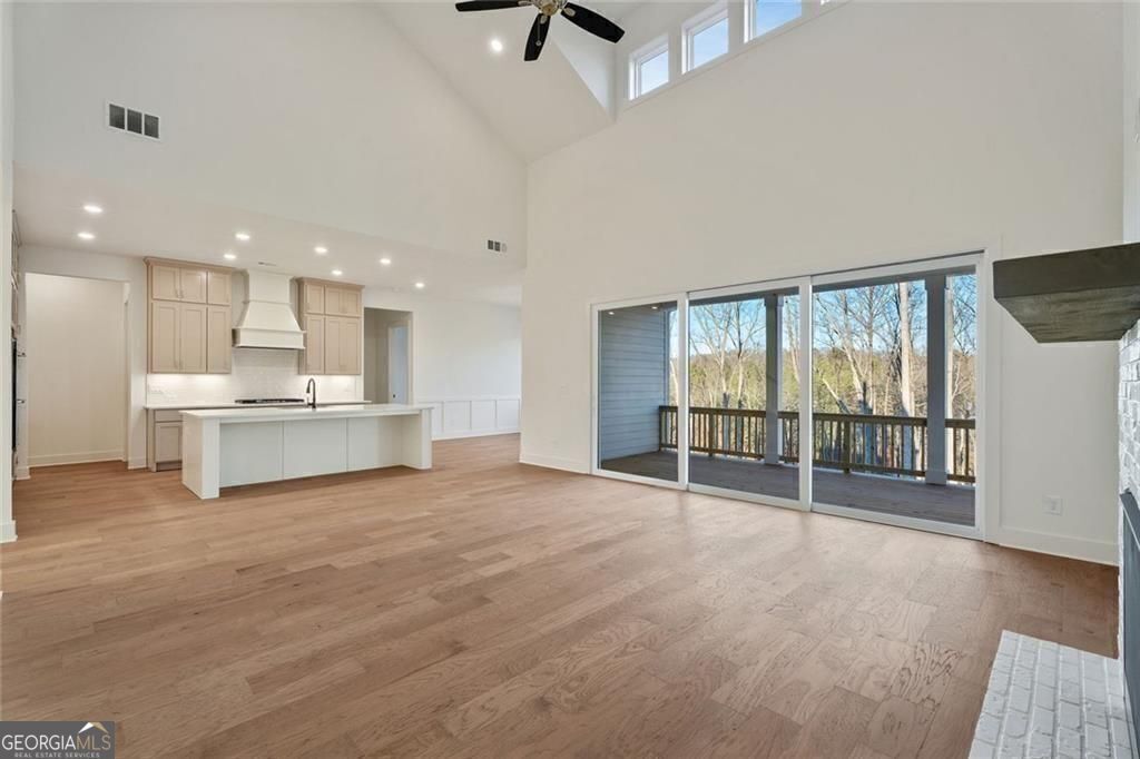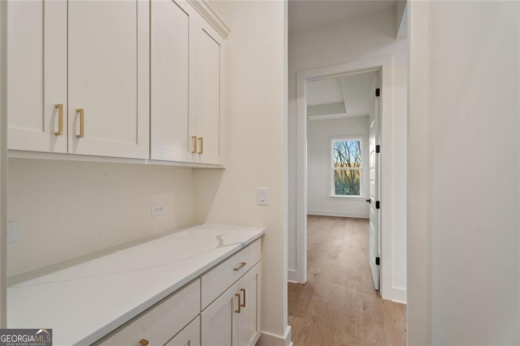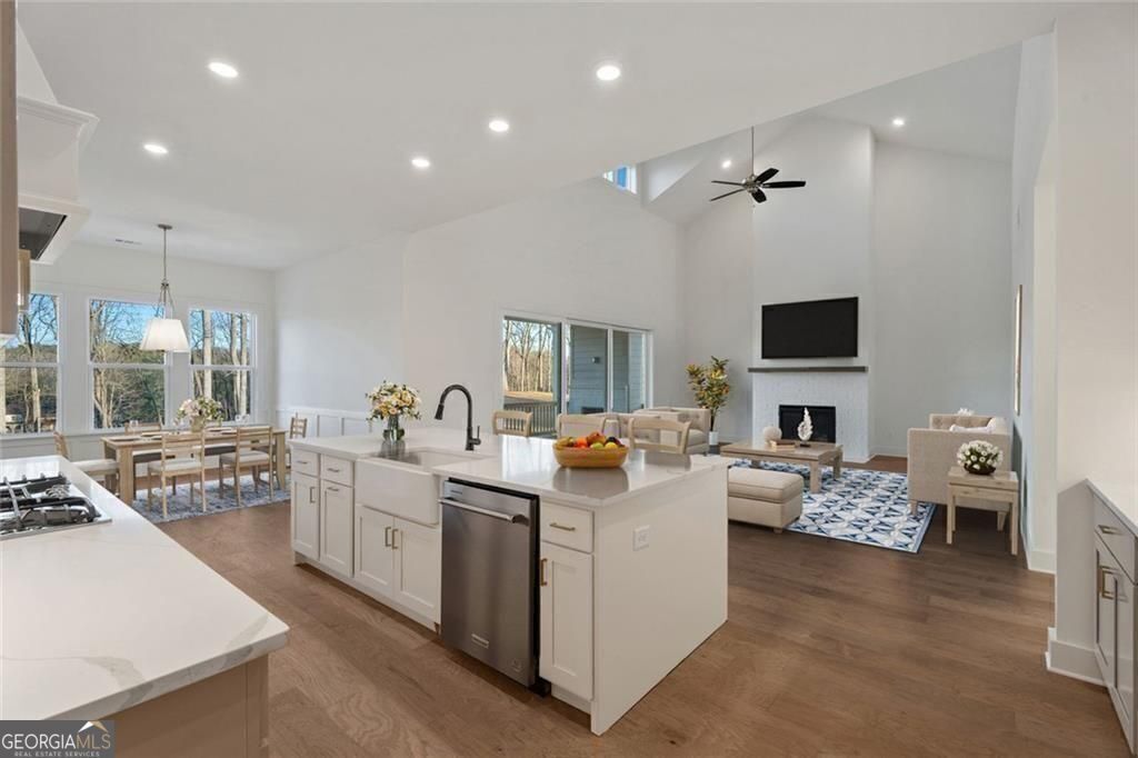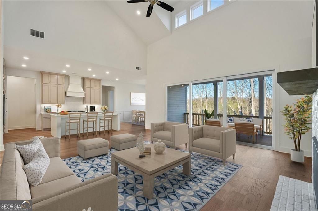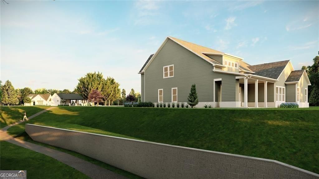 Lakeside at Long Hollow Lot 29. Gorgeous Lakefront home built by David Patterson Homes comes with a deeded boat slip in the community dock. The 1st level includes a grand foyer leading to a large great room with soaring ceilings, a fireplace with built-in cabinets and shelving, and sliding glass doors to the covered patio with a fireplace and Lake Lanier views. The open-concept great room includes a kitchen with double-stacked cabinets, a microwave, a range, and a 36-inch gas cooktop with a designer hood. The oversized island has a deep white farmhouse sink. A walk-in pantry and a butler's pantry behind the kitchen. Also on this level, an office space and a guest bedroom with a full bath. The owner's suite includes a large bedroom and bath with a double vanity, a separate tub and shower, and a large closet with a laundry room off the owner's closet. The bedroom has large windows with a view of the lake. The 2nd level includes a media room, two bedrooms with baths, a secondary office with a closet, and a loft. This home features ample storage and a 3-car garage. Situated on lot 29, this residence holds the premier location within the community, being closest to the lake. It is very close to the community dock and firepit pavilion.