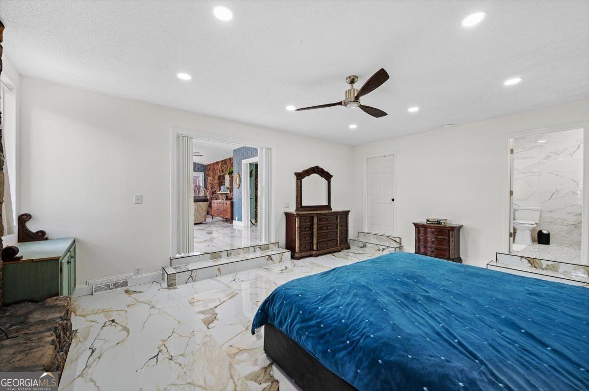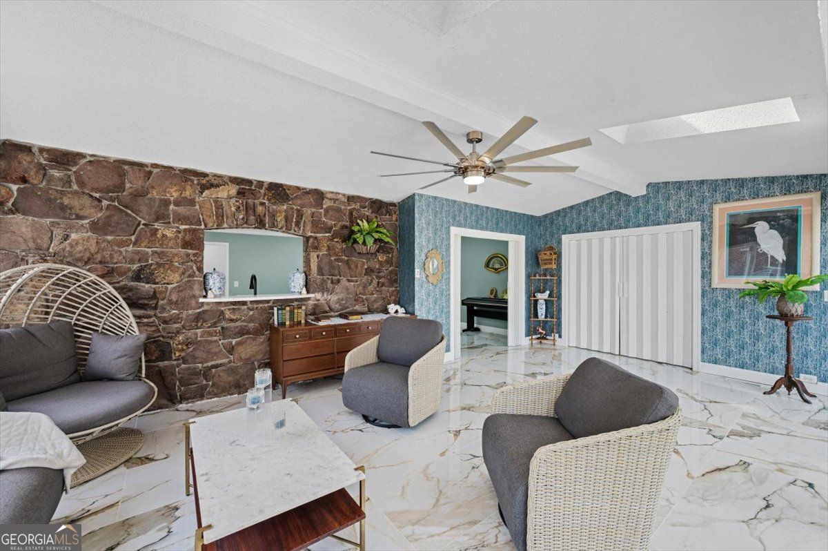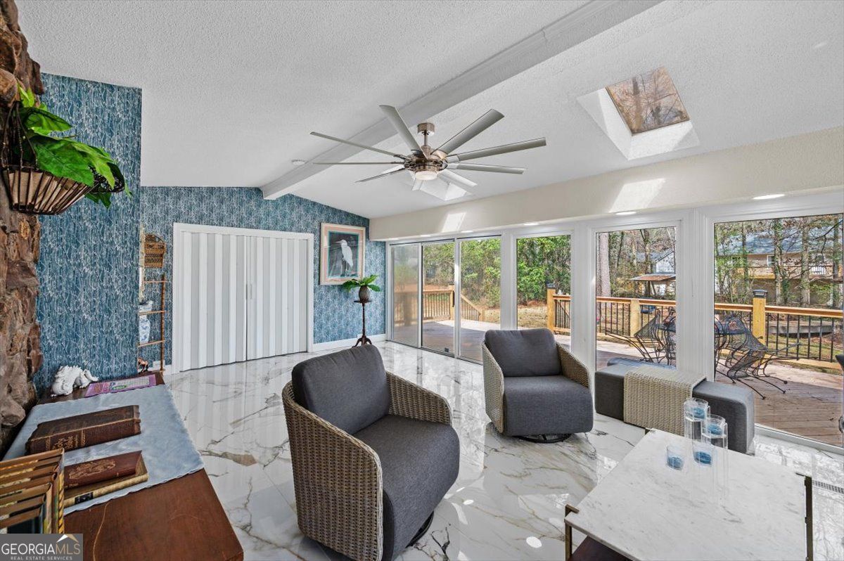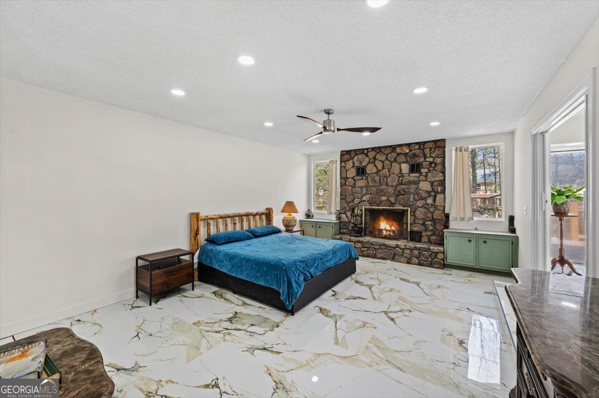 Renovated and full of character, this home stands out with its timeless design. Inside you'll find beautiful marble-style flooring, fresh finishes, and a spacious layout that works well for both everyday living and entertaining. The main living area features vaulted ceilings, a striking stone fireplace, and a wall of windows that fills the space with natural light and opens to the large back deck. The kitchen has been tastefully updated with custom cabinetry, a farmhouse sink, designer fixtures, and a large waterfall island that's perfect for gathering with family and friends. The primary suite offers a private retreat with its own fireplace, outdoor access, and plenty of closet space. The renovated bathroom features elegant tile work and a spacious walk-in shower. Additional bedrooms are generously sized, and the home offers multiple living areas that provide flexibility for relaxing, entertaining, or working from home. Outside, the large deck overlooks a private backyard surrounded by mature trees, creating a peaceful setting to enjoy the outdoors.Conveniently located in a beautiful and accessible area of Rome, Georgia, this home offers easy access to local shopping, dining, and everyday amenities.With thoughtful updates, unique architectural character, and move-in ready condition, this home offers a special opportunity you won't want to miss.