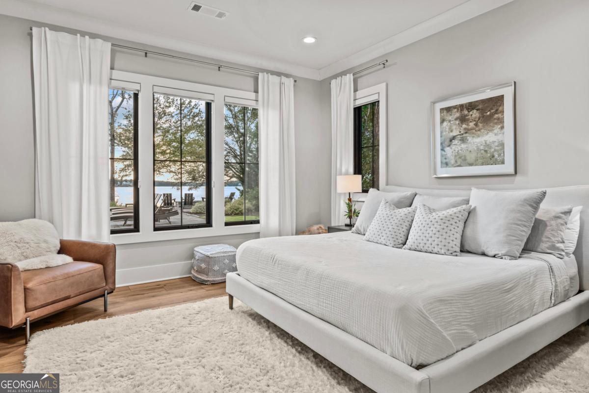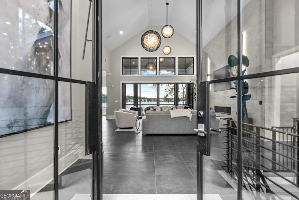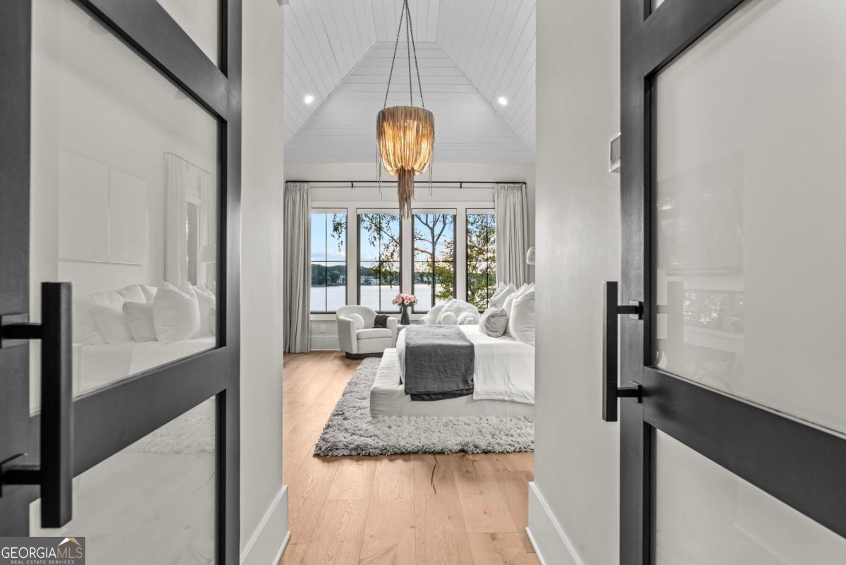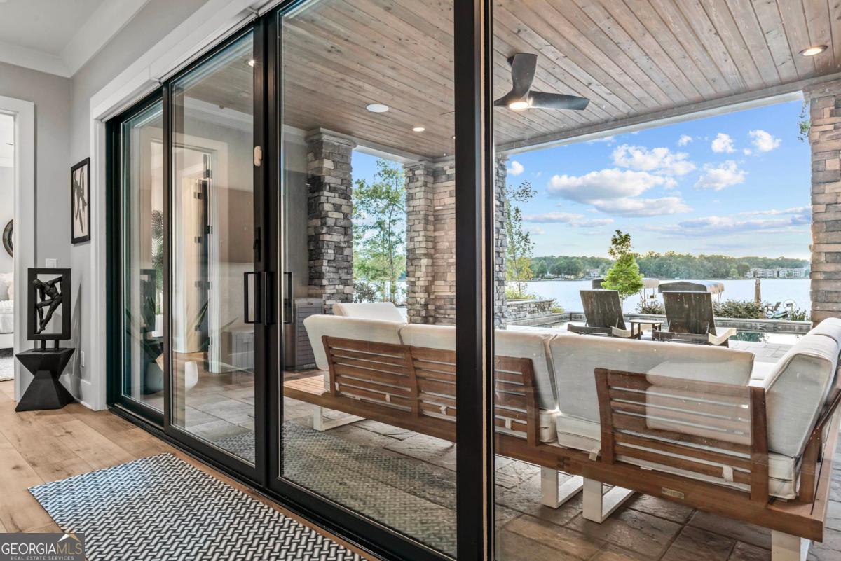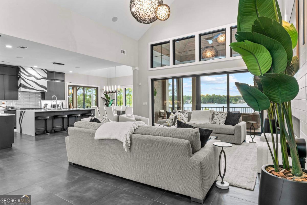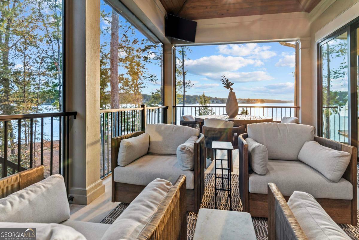 Luxury lakefront like-new home, built by Hatfield Custom Homes, with all the amenities in Reynolds Lake Oconee showcasing the most breathtaking, expansive lake views imaginable. Nestled on nearly an acre of lakefront, this stunning home offers modern elegance with high-end finishes throughout. The long private driveway sets the tone for the grand experience that awaits inside. The 24ft ceiling great room with 9ft glass sliders seamlessly invite the outdoors in offering front row sunset views. Designed with style and convenience in mind, this smart home delivers a sophisticated yet welcoming ambiance. The custom cast iron front door opens to a striking interior with custom Italian tile flooring, designer lighting, floating iron and wood staircase highlighted by a custom antique mirrored glass, remote-controlled electric fireplace. The exceptional open floorplan was designed to capture views of the lake from nearly every room. The kitchen is framed by Bentley Cambria quartz waterfall countertop island and coordinating vent hood, sleek custom cabinetry, and professional designer appliance package that include Sub-Zero refrigerator, Wolf cooktop, Cafe Professional Series oven, Cove dishwasher, ice maker, dual refrigerator drawers, and a 288-bottle Zephyr wine refrigerator. The luxurious primary suite boasts 10" natural hardwood plank floors, remote-controlled electric fireplace, custom Artisan closets, and a spa-like bath with floor-to-ceiling tile throughout, natural wood vanities and cabinets with concrete vessel sinks. The main level also include a versatile office that can easily serve as an additional bedroom. A beautiful floating iron staircase leads to the terrace level where a spacious family room and billiard room await. This level is an entertainer's dream featuring a full bar, powder room and a seamless access to the pool deck with expansive lake views as the perfect backdrop. The rare flat lake backyard is a true gem in this community. The terrace level also features three well-appointed guest suites ensuring ample space for family and friends. Watch your favorite games in your expansive outdoor deck or enjoy the sunset in your salt water pool/spa with spillway, automatic cover and fire pit. This luxurious home features remote control blinds, three-car garage, large custom seasonal closet and Smart Home features (security, pool, firepit, lighting). Great location! Walk to the clubhouse and the Jack Nicklaus course. Membership is available.