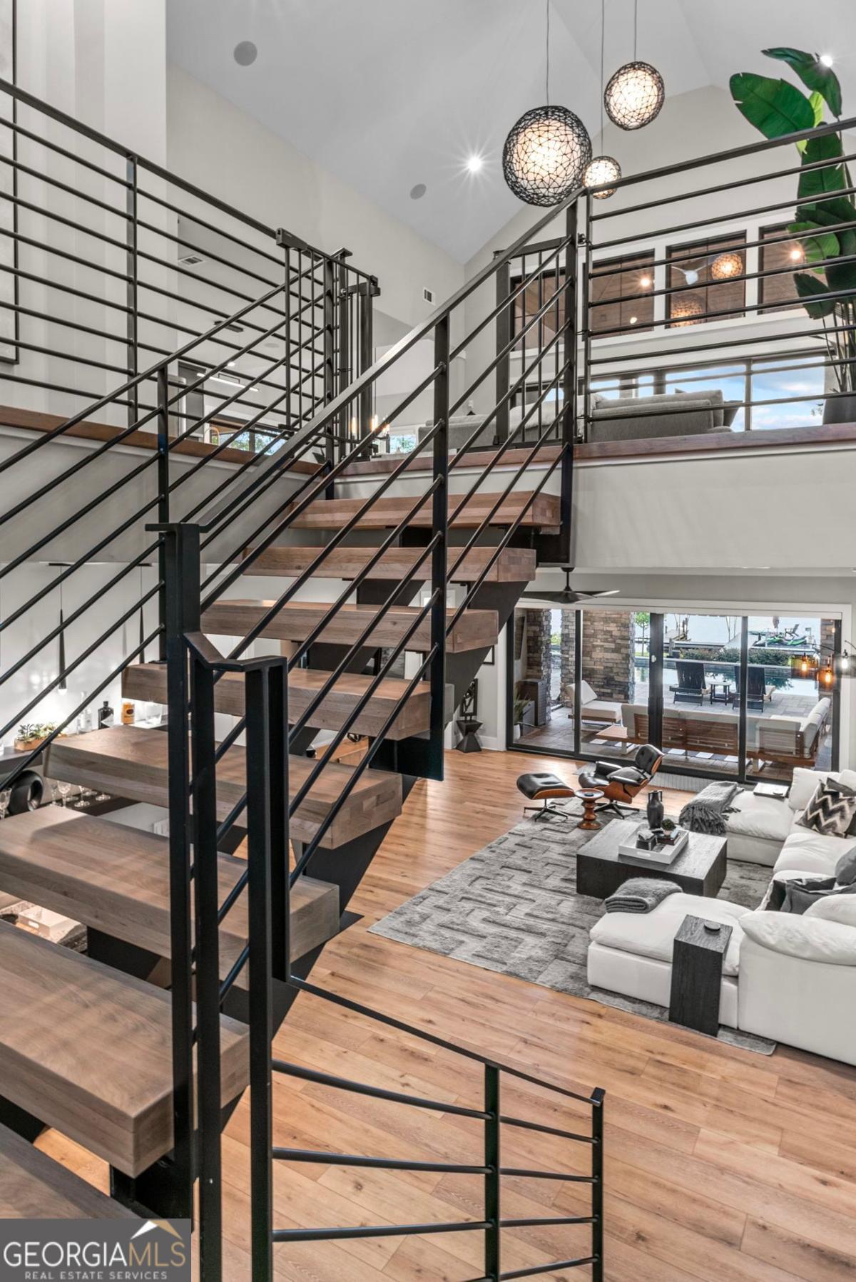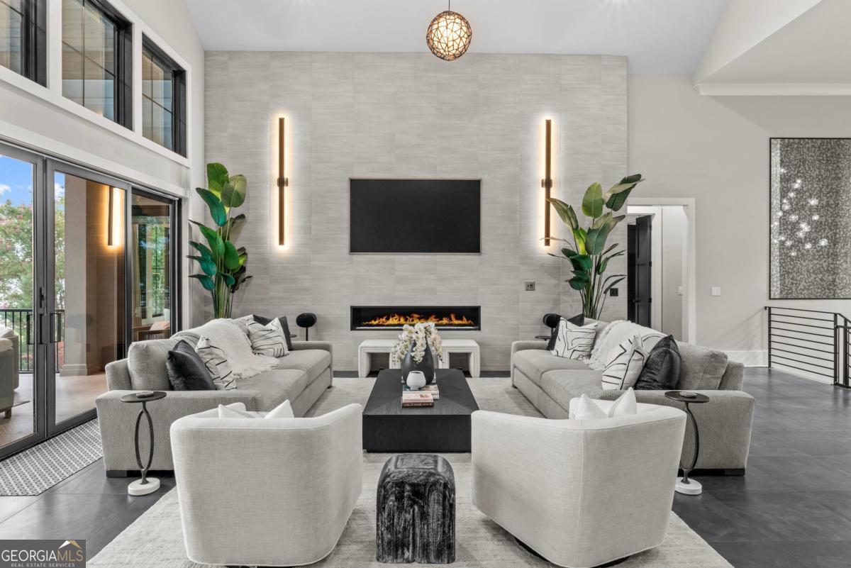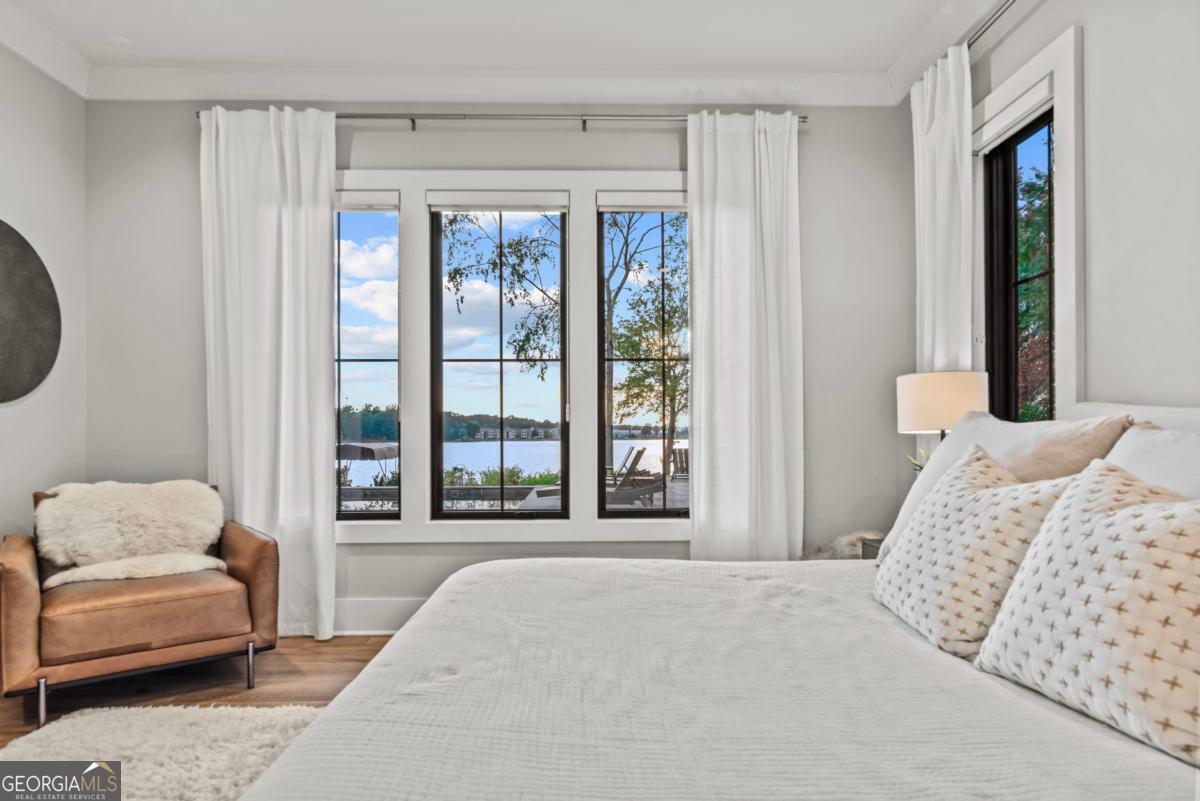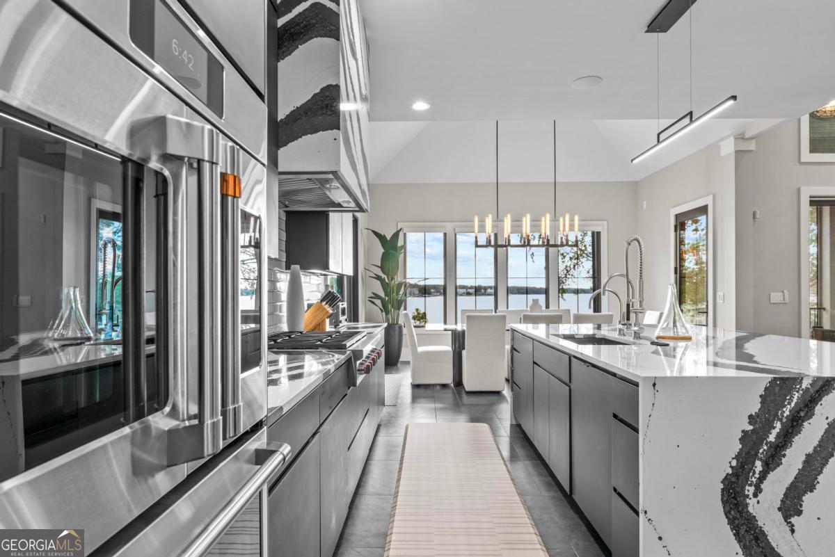 Luxury lakefront like-new home, built by Hatfield Custom Homes, with all the amenities in Reynolds Lake Oconee showcasing the most breathtaking, expansive lake views imaginable. Nestled on nearly an acre of lakefront, this stunning home offers modern elegance with high-end finishes throughout. The long private driveway sets the tone for the grand experience that awaits inside. The 24ft ceiling great room with 9ft glass sliders seamlessly invite the outdoors in offering front row sunset views. Designed with style and convenience in mind, this smart home delivers a sophisticated yet welcoming ambiance. The custom cast iron front door opens to a striking interior with custom Italian tile flooring, designer lighting, floating iron and wood staircase highlighted by a custom antique mirrored glass, remote-controlled electric fireplace. The exceptional open floorplan was designed to capture views of the lake from nearly every room. The kitchen is framed by Bentley Cambria quartz waterfall countertop island and coordinating vent hood, sleek custom cabinetry, and professional designer appliance package that include Sub-Zero refrigerator, Wolf cooktop, Cafe Professional Series oven, Cove dishwasher, ice maker, dual refrigerator drawers, and a 288-bottle Zephyr wine refrigerator. The luxurious primary suite boasts 10" natural hardwood plank floors, remote-controlled electric fireplace, custom Artisan closets, and a spa-like bath with floor-to-ceiling tile throughout, natural wood vanities and cabinets with concrete vessel sinks. The main level also include a versatile office that can easily serve as an additional bedroom. A beautiful floating iron staircase leads to the terrace level where a spacious family room and billiard room await. This level is an entertainer's dream featuring a full bar, powder room and a seamless access to the pool deck with expansive lake views as the perfect backdrop. The rare flat lake backyard is a true gem in this community. The terrace level also features three well-appointed guest suites ensuring ample space for family and friends. Watch your favorite games in your expansive outdoor deck or enjoy the sunset in your salt water pool/spa with spillway, automatic cover and fire pit. This luxurious home features remote control blinds, three-car garage, large custom seasonal closet and Smart Home features (security, pool, firepit, lighting). Great location! Walk to the clubhouse and the Jack Nicklaus course. Membership is available.