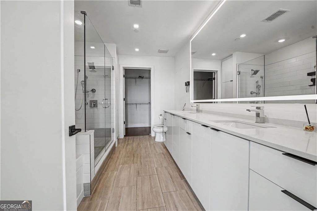 Experience luxury living in the heart of West Midtown at Seven88 West Midtown! This modern 2-bedroom, 2.5-bath condominium offers approximately 1,345 sq ft of stylish living space with hardwood floors, high ceilings, and stunning city views from the private balcony. The contemporary kitchen features stone countertops, a kitchen island, and stainless steel appliances including a gas oven, microwave, dishwasher, refrigerator, and trash compactor, along with an in-unit washer and dryer for added convenience. The spacious primary suite includes a walk-in closet and a spa-inspired bath with double vanities and a separate tub and shower. Residents enjoy exceptional building amenities including a 24-hour concierge, gated access, fitness center, clubhouse, pool and spa with skyline views, meeting rooms, pet spa, and indoor dog park, plus easy access to nearby trails and greenways. Located within walking distance to Georgia Tech, restaurants, shopping, and entertainment, this home offers the perfect blend of modern comfort, convenience, and vibrant city living.