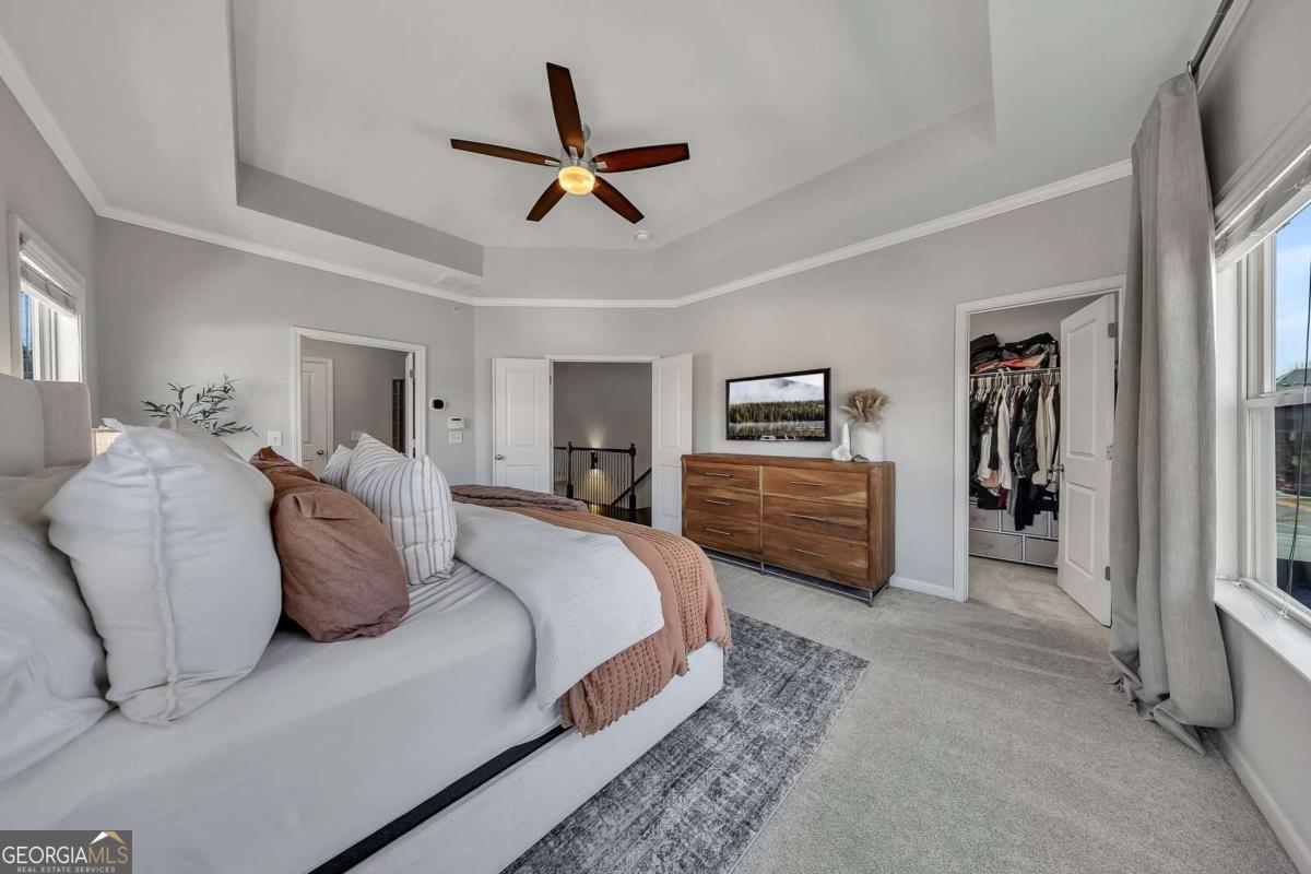 - Interior FeaturesBookcases, Double Vanity, Pulldown Attic Stairs, Tray Ceiling(s), Walk-In Closet(s)