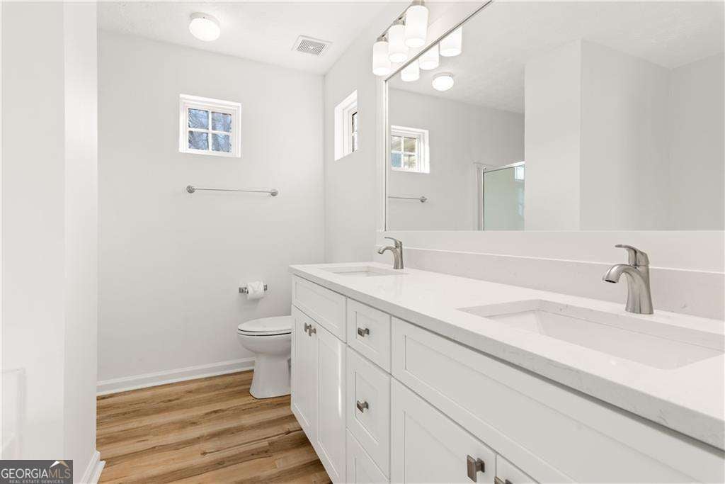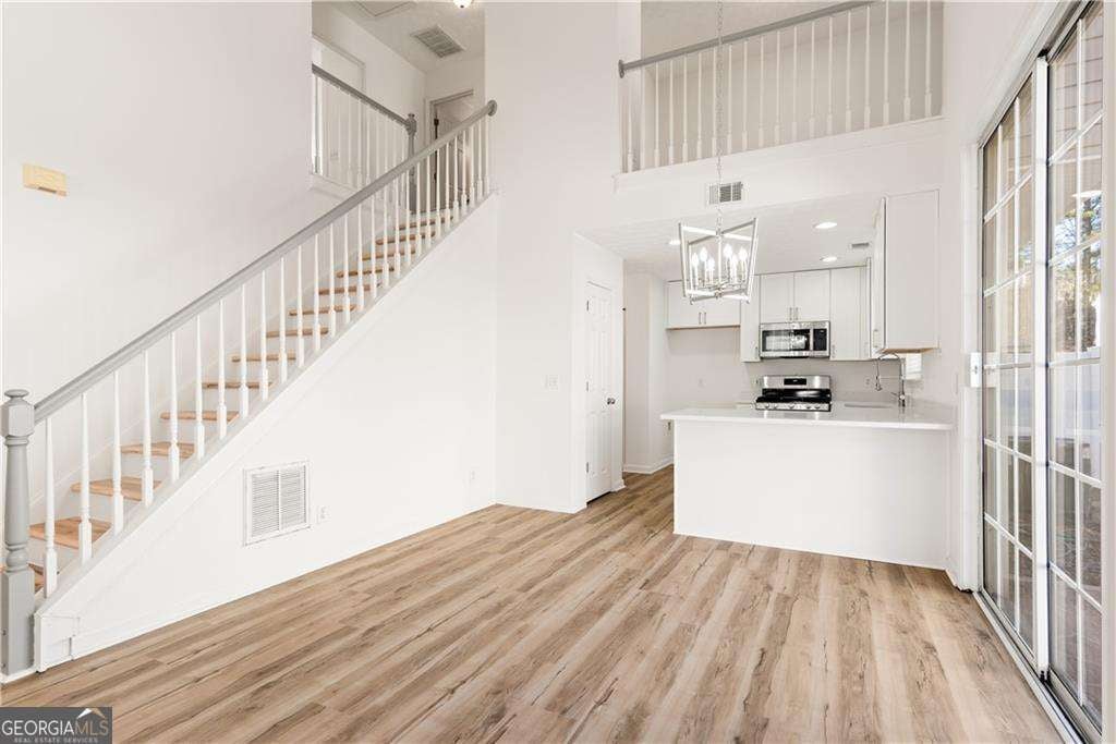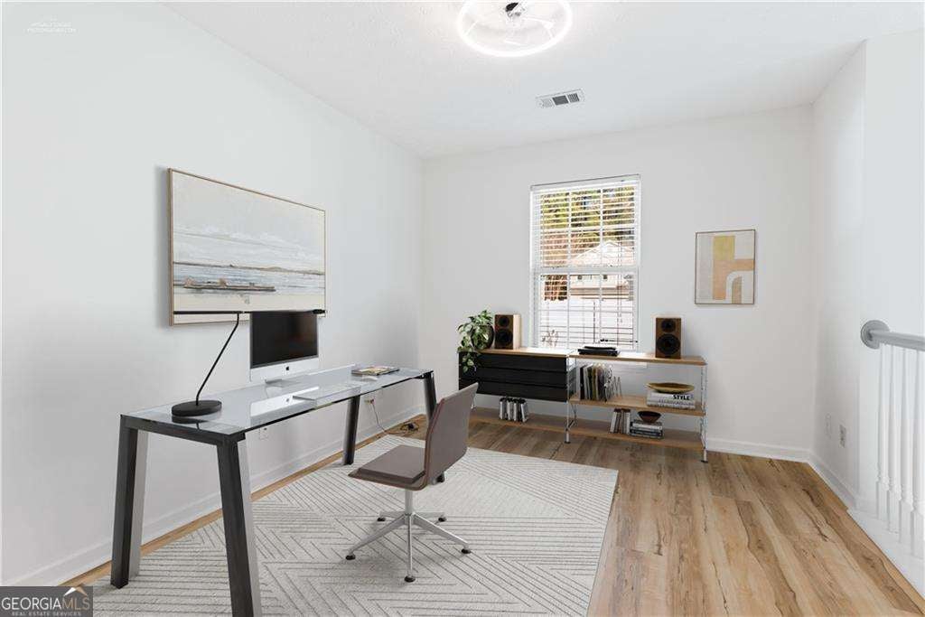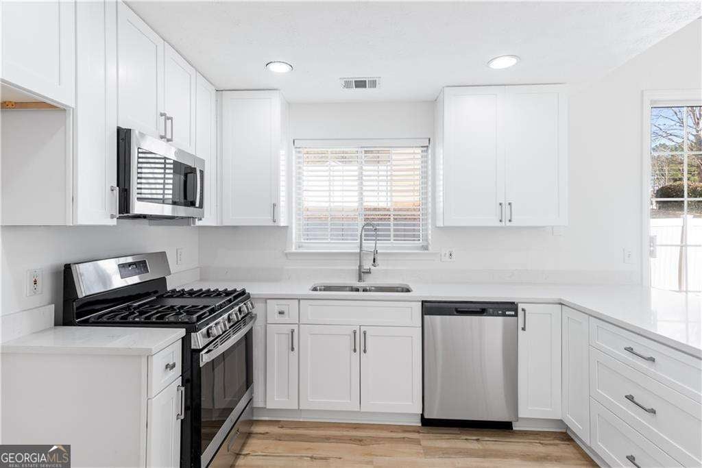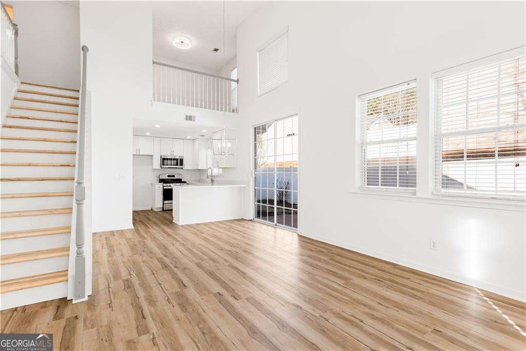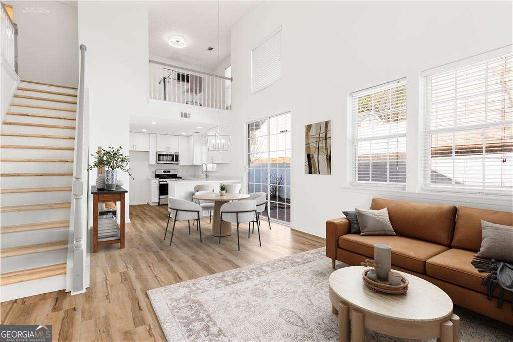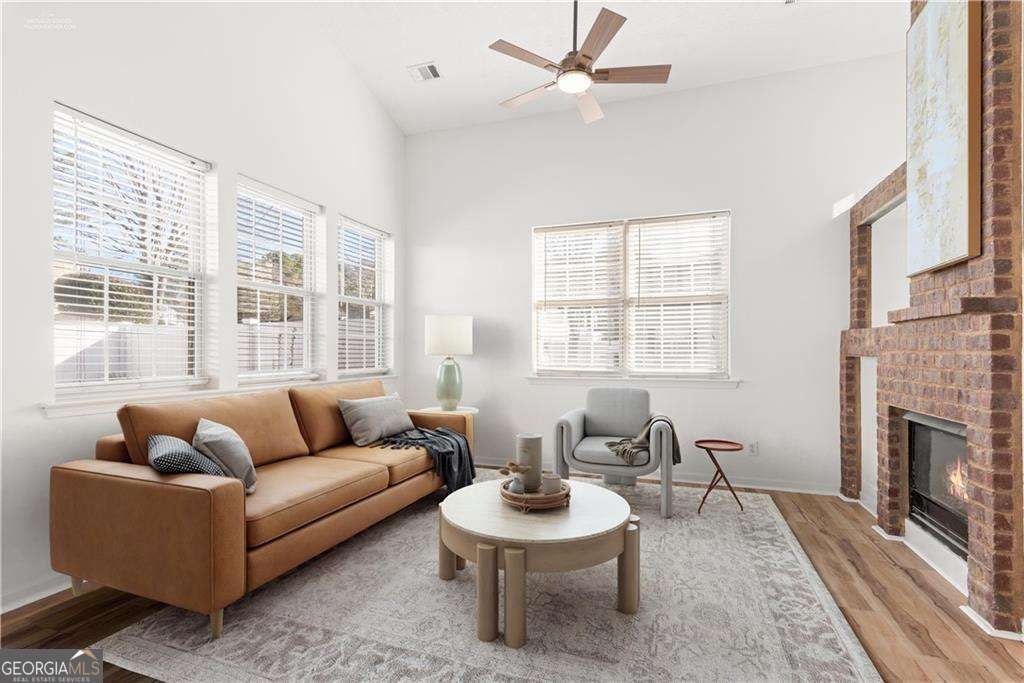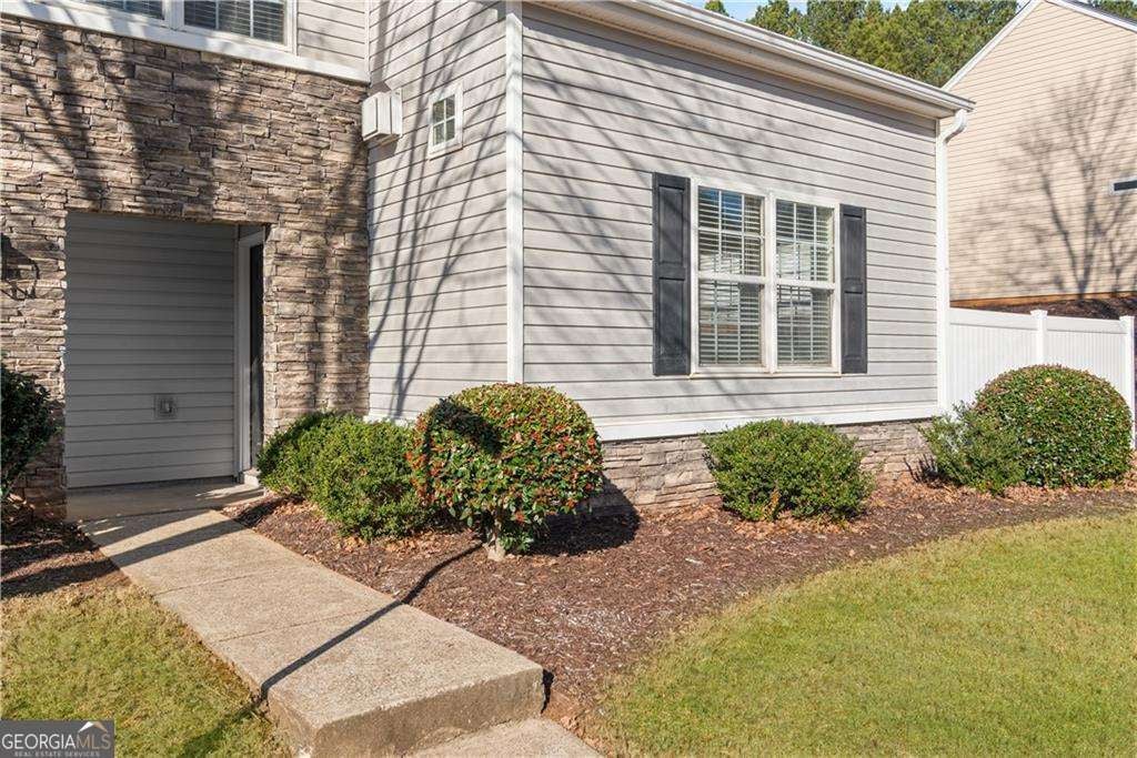 Completely renovated and move-in ready, this stunning corner-lot home in the sought-after West Oaks community offers the perfect blend of style, comfort, and convenience. As you enter, you are welcomed by an open-concept floor plan and dramatic vaulted ceilings that create a bright and spacious atmosphere. The inviting living room features a cozy gas fireplace and built-in shelving, making it the perfect place to relax or entertain. Filled with natural light, the designer kitchen showcases ceiling-height cabinetry, quartz countertops, and brand-new stainless steel appliances, combining modern style with everyday functionality. New light fixtures and luxury vinyl plank flooring run throughout the entire home-no carpet anywhere. Upstairs, a versatile loft overlooking the main living area makes an ideal home office, reading nook, or media space and could easily be enclosed to create a third bedroom if desired. The primary suite offers two spacious closets and a beautifully renovated bathroom with dual vanities, new cabinetry, and quartz countertops. A second renovated bedroom and bathroom complete the upper level. Step outside to enjoy your morning coffee in the private fenced patio and garden area-a peaceful retreat perfect for relaxing or entertaining. Even better, the HOA handles yard maintenance, allowing you to enjoy truly low-maintenance living. Additional conveniences include a two-car garage and parking directly in front of the home. Other upgrades include a new roof in 2022 and a new hot water heater in 2023. Tucked away in a quiet community yet ideally located just 2.5 miles from I-575, this home provides quick access to shopping, dining, and entertainment in vibrant Downtown Woodstock, with easy access to Roswell as well. Beautifully renovated, ideally located, and completely move-in ready-this is the one you've been waiting for.