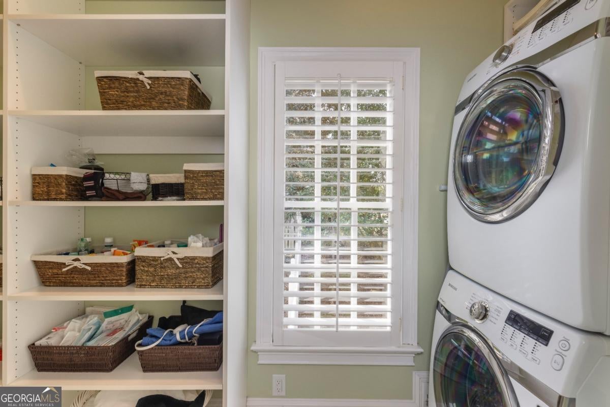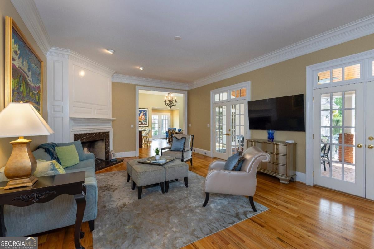 This stunning home, inspired by the historic Raleigh Tavern, is beautifully situated on a spectacular park-like lot offering privacy, charm, and timeless architecture. A spacious foyer welcomes you and is flanked by a private office or study and an elegant dining room featuring a wine cellar, perfect for entertaining. The fireside family room opens to a beautiful oversized covered porch, creating seamless indoor-outdoor living. The chef's kitchen is designed for both everyday living and entertaining, complete with stainless steel appliances, a scullery kitchen, and a fireside keeping room. The primary suite on the main level offers a luxurious retreat with his-and-her closets and a fully updated spa bath featuring a large shower, double vanities, and an additional laundry room. Upstairs you'll find a versatile flex room, two additional bedrooms with a shared bath, and another laundry room for added convenience. A separate staircase leads to a private in-law or guest suite with an ensuite bedroom and flex room, providing ideal space for extended family or guests. The fenced yard offers ample room to enjoy the beautiful setting, and the property includes an impressive five-car garage with plenty of additional parking. Sweet Bottom Plantation is influenced by the historic homes of Savannah, Charleston, and the Garden District of New Orleans, with each street featuring its own common areas with gazebos and fountains. The community offers gas-lit streets, a saltwater pool, lighted tennis courts, clubhouse, pickleball court, playground, and access to the river. Conveniently located near Whole Foods, Publix, Target, and Home Depot, as well as upscale dining, and just minutes from the Atlanta Athletic Club and top private and public schools.