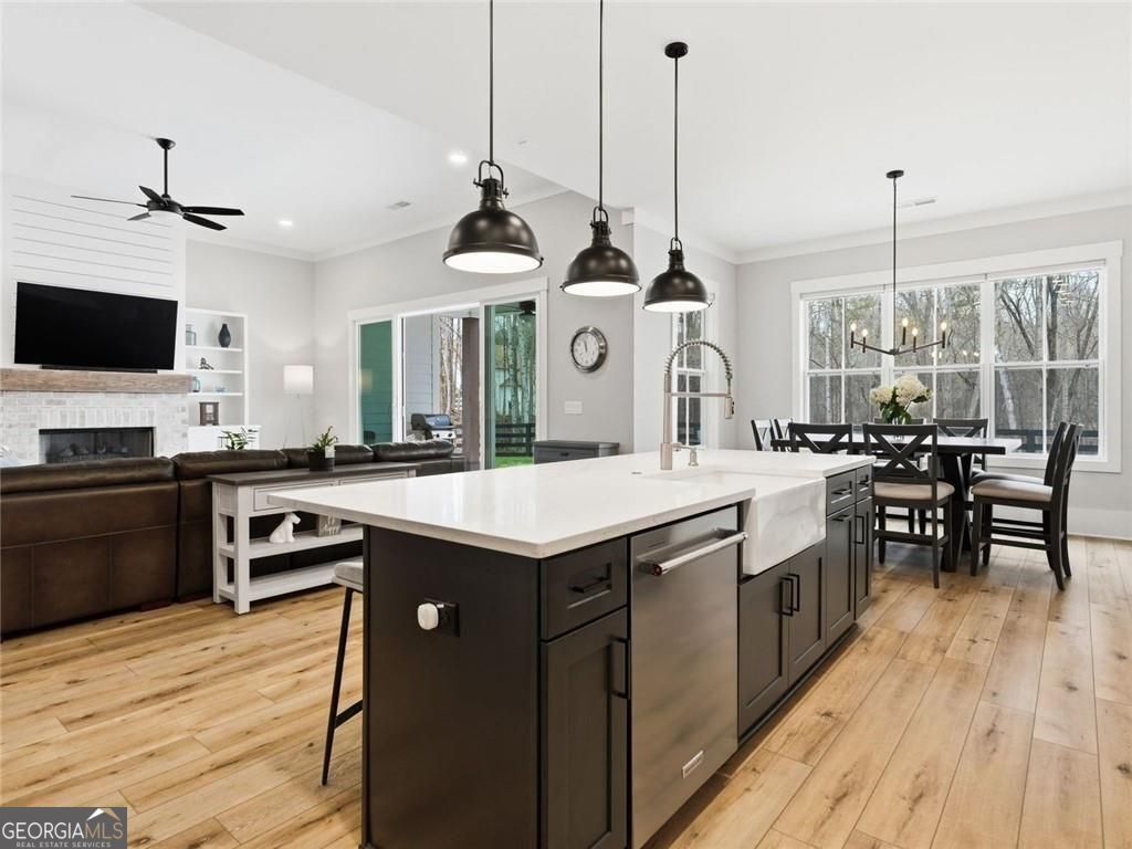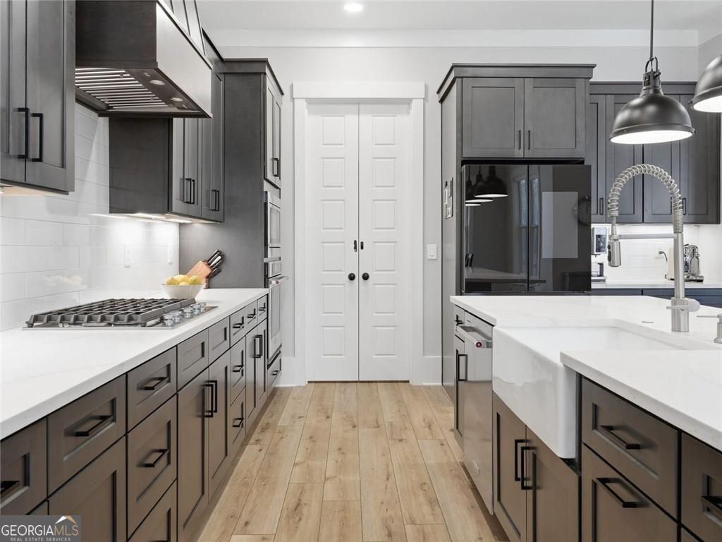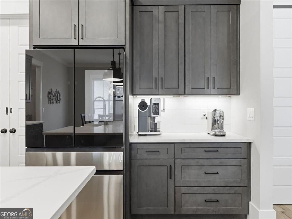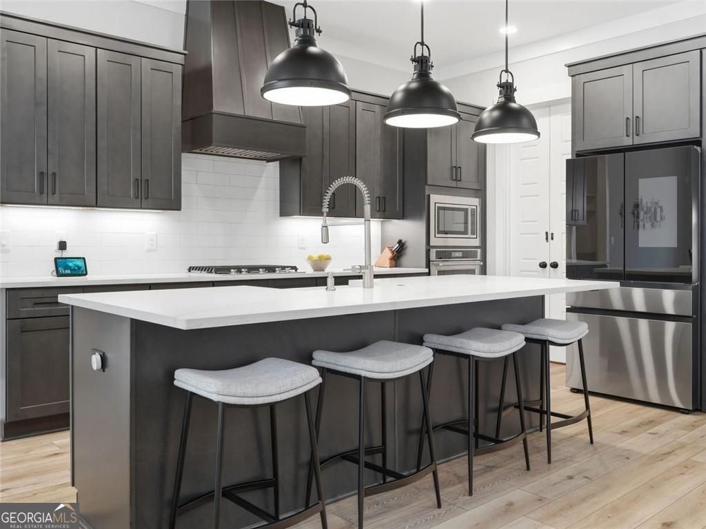 Board-and-batten farmhouse design paired with a wide rocking chair front porch immediately sets the tone for this 2022 Red Barn / Corsini custom build, tucked onto a private 1.5-acre homesite in Woodstock. Clean lines, black metal porch roof accents, and a three-car garage create strong curb appeal before you even step inside. The main level centers around an open floor plan designed for everyday living and easy entertaining. Wide plank luxury vinyl flooring run throughout, while the living room anchors the space with a gas log fireplace framed by built-in cabinetry. The kitchen stands out with an oversized quartz island with seating, quartz countertops, stainless steel appliances, a farmhouse sink, designer pendant lighting, and a walk-in pantry, all surrounded by custom soft-close cabinetry. Just off the living area, the main-level primary suite creates a private retreat with a spa-style bathroom featuring a double walk-in shower, dual vanities, and an oversized walk-in closet with direct access to the laundry room. Two additional bedrooms share a double vanity hall bath, while a dedicated office and a flexible room with a dog door to the backyard add practical daily function. A drop-zone mudroom connects directly to the garage entry. Upstairs, a private suite offers a bedroom and living room space, full bath, and walk-in closet, creating a separate space for guests or extended stays. Outdoor living continues on the covered rear porch with a ceiling fan, plus an extended patio designed for grilling and gathering. The level fenced backyard backs to a wooded tree line, creating a private setting with room to relax, play, or entertain. Enjoy convenient access to Downtown Woodstock's vibrant dining and events, plus nearby outdoor recreation at Hobgood Park and the Blankets Creek trail system. Roswell's Canton Street and the shopping and dining at Downtown Alpharetta and Avalon are all within a short drive.