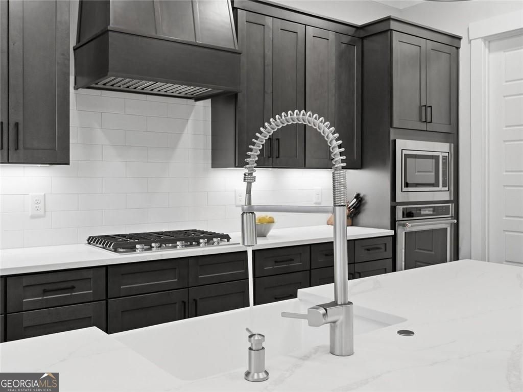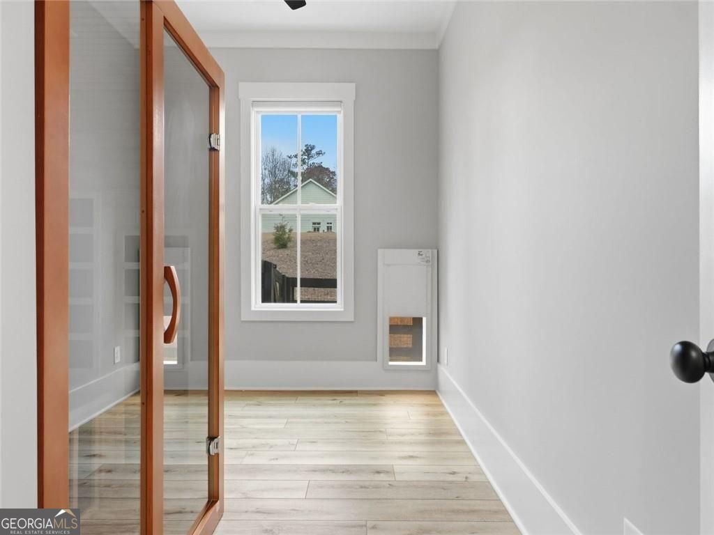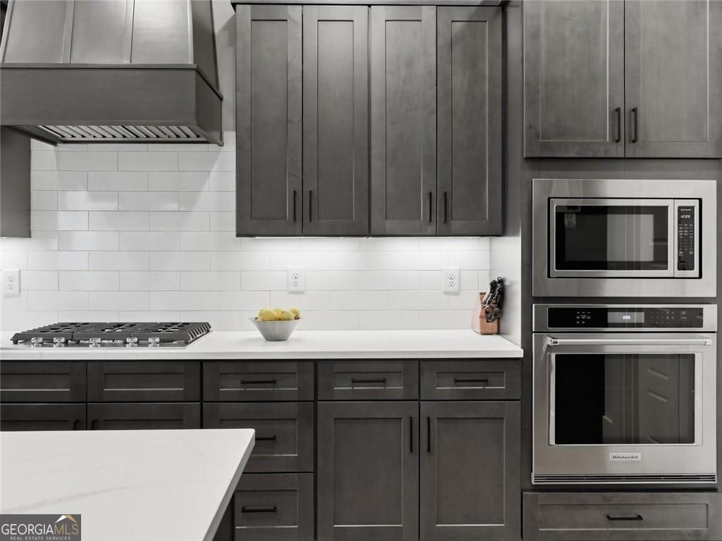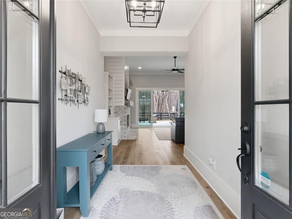 Board-and-batten farmhouse design paired with a wide rocking chair front porch immediately sets the tone for this 2022 Red Barn / Corsini custom build, tucked onto a private 1.5-acre homesite in Woodstock. Clean lines, black metal porch roof accents, and a three-car garage create strong curb appeal before you even step inside. The main level centers around an open floor plan designed for everyday living and easy entertaining. Wide plank luxury vinyl flooring run throughout, while the living room anchors the space with a gas log fireplace framed by built-in cabinetry. The kitchen stands out with an oversized quartz island with seating, quartz countertops, stainless steel appliances, a farmhouse sink, designer pendant lighting, and a walk-in pantry, all surrounded by custom soft-close cabinetry. Just off the living area, the main-level primary suite creates a private retreat with a spa-style bathroom featuring a double walk-in shower, dual vanities, and an oversized walk-in closet with direct access to the laundry room. Two additional bedrooms share a double vanity hall bath, while a dedicated office and a flexible room with a dog door to the backyard add practical daily function. A drop-zone mudroom connects directly to the garage entry. Upstairs, a private suite offers a bedroom and living room space, full bath, and walk-in closet, creating a separate space for guests or extended stays. Outdoor living continues on the covered rear porch with a ceiling fan, plus an extended patio designed for grilling and gathering. The level fenced backyard backs to a wooded tree line, creating a private setting with room to relax, play, or entertain. Enjoy convenient access to Downtown Woodstock's vibrant dining and events, plus nearby outdoor recreation at Hobgood Park and the Blankets Creek trail system. Roswell's Canton Street and the shopping and dining at Downtown Alpharetta and Avalon are all within a short drive.