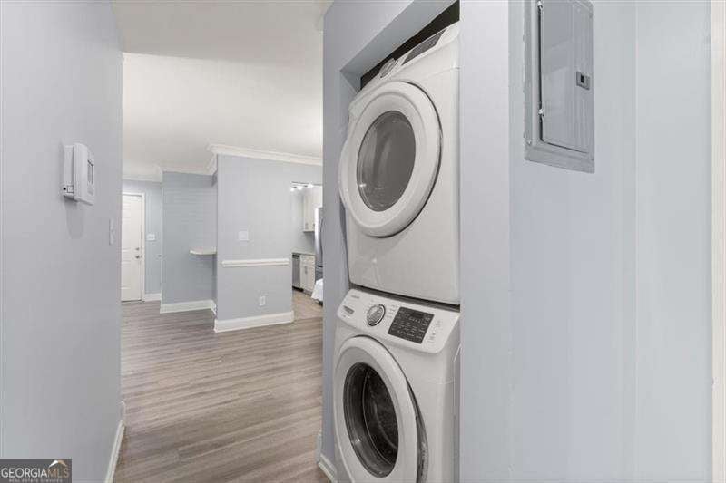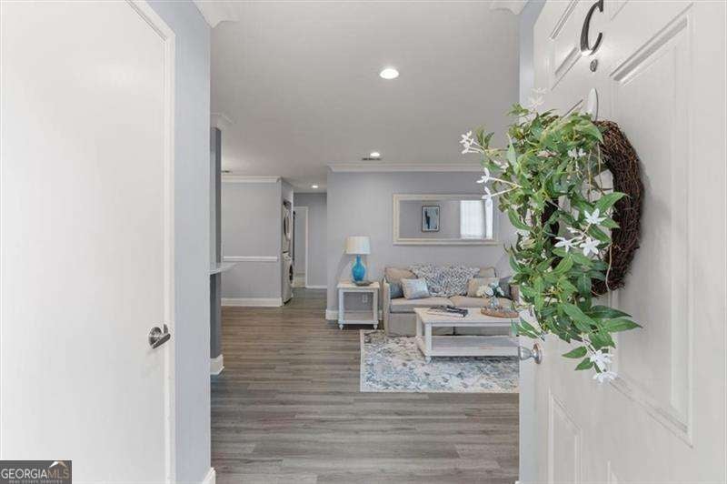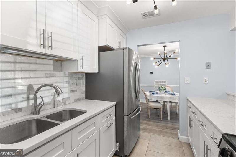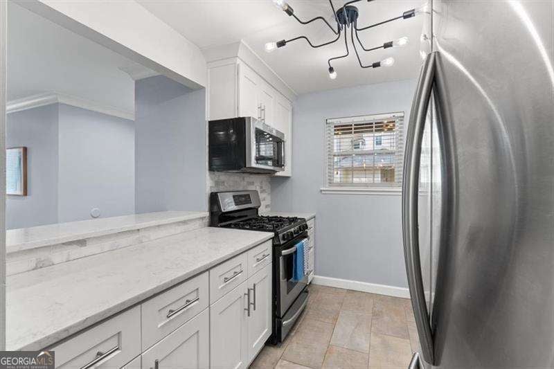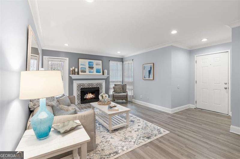 WOW! PRICE IMPROVEMENT! Here is the deal you have been waiting for! Welcome to this beautifully updated 2-bedroom, 1-bath first-floor corner condo in the gated Glenridge Park community in Sandy Springs. This move-in ready, single-level home features crown molding, recessed lighting and modern light fixtures, LVP flooring, and a stylish tiled fireplace with trendy fireplace balls that anchors the bright open living space. The designer kitchen showcases white cabinetry to the ceiling, quartz countertops, gas range, stainless steel appliances, and a modern backsplash, opening seamlessly to the dining and living areas-perfect for everyday living or entertaining. The spacious owner's suite includes a custom walk-in closet and light filled window. The updated bath features a brand new tub/shower surround, beautiful marble countertop and cabinet with updated hardware. A second bedroom offers flexibility for guests or a home office. Now, Step outside to the cozy covered porch, a peaceful spot to enjoy morning coffee or just unwind. Residents enjoy resort-style amenities including a pool, tennis courts, fitness center, grilling area, and abundant parking. Ideally located minutes from Perimeter Mall, Mercedes-Benz USA, and convenient access to MARTA, GA-400, and I-285, this home offers the perfect blend of luxury, convenience, and quiet gated living. A rare opportunity in the heart of Sandy Springs.