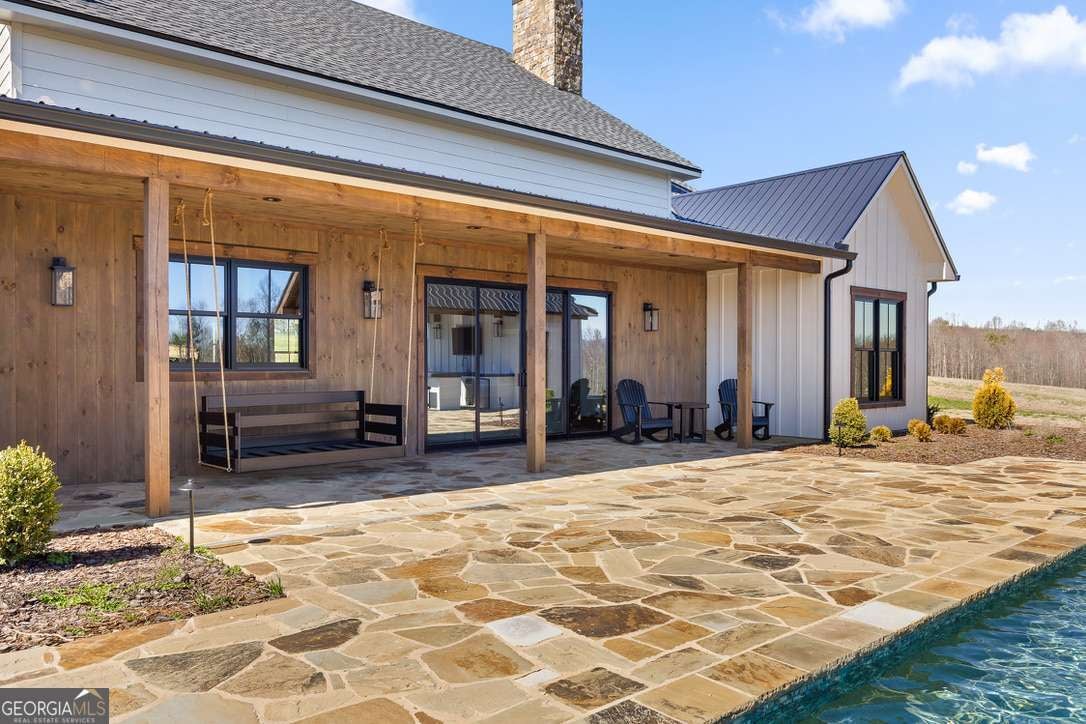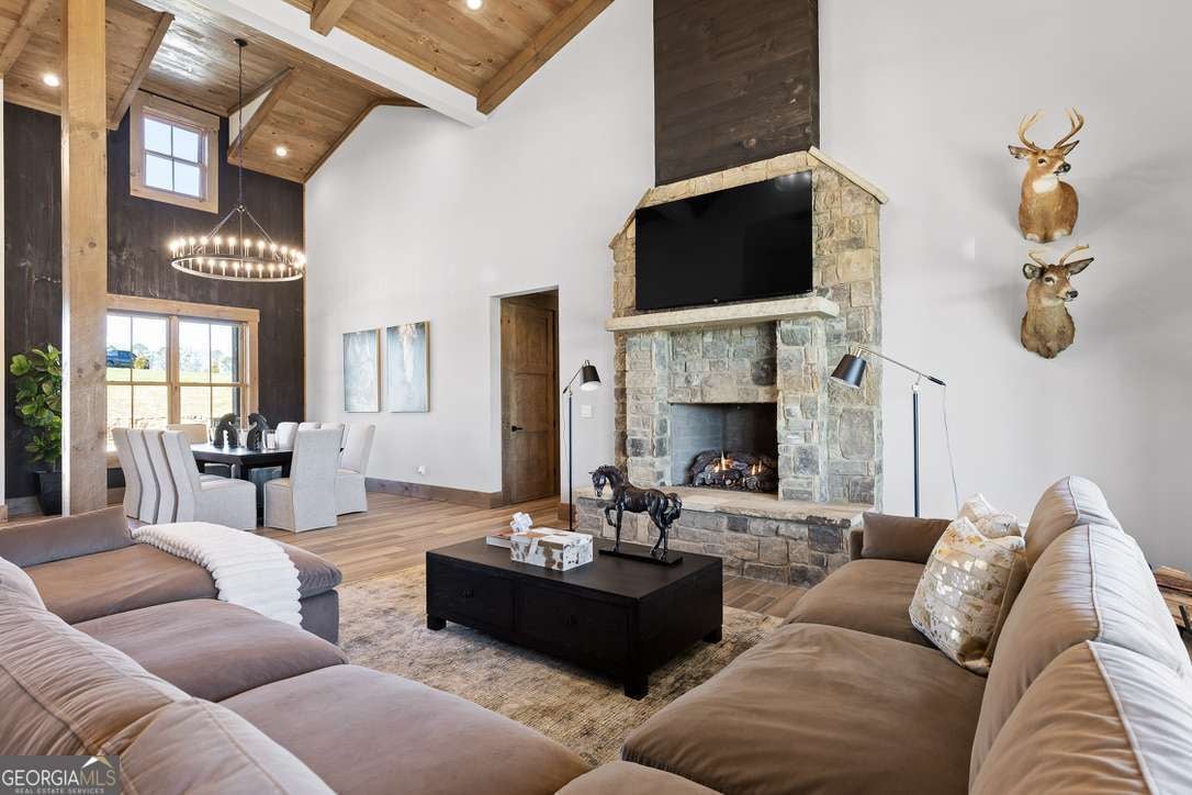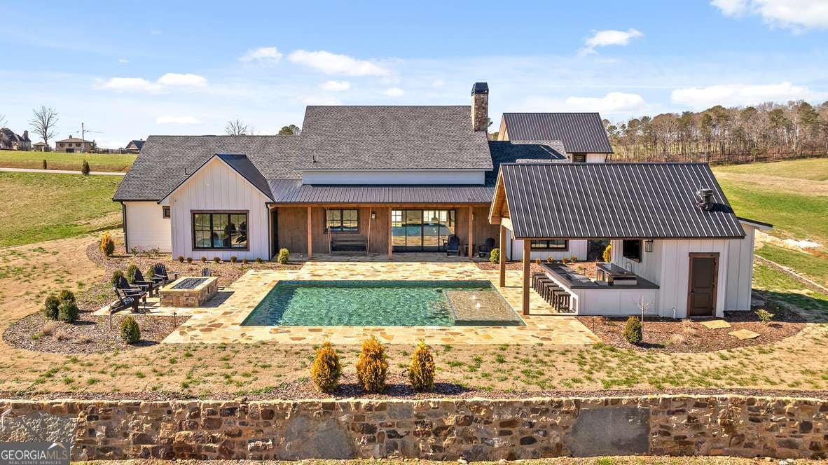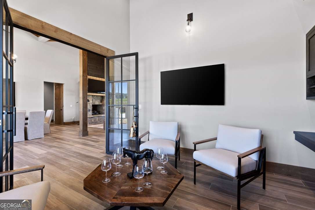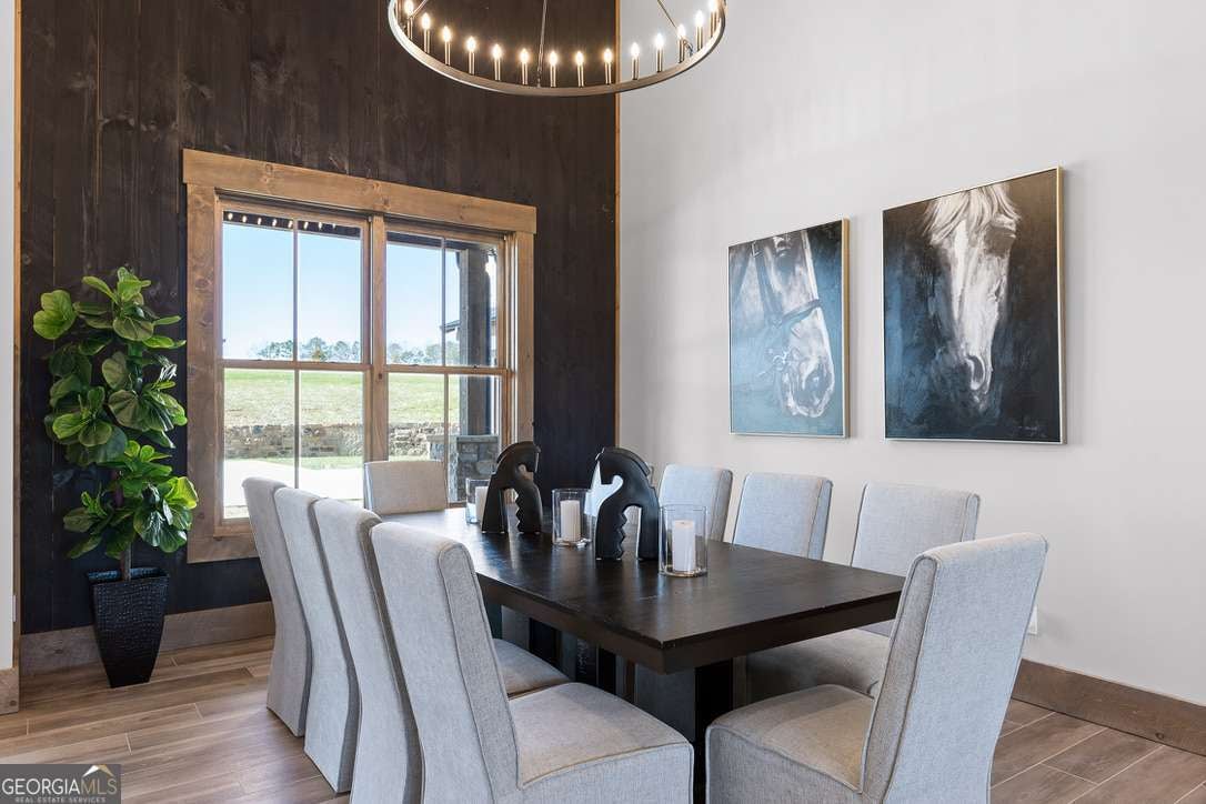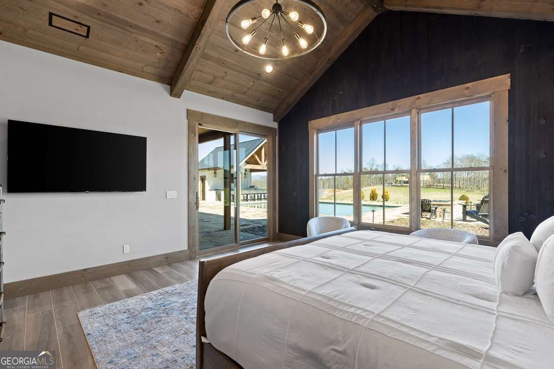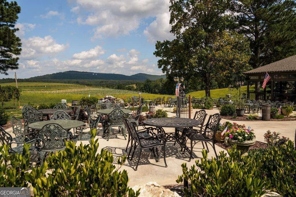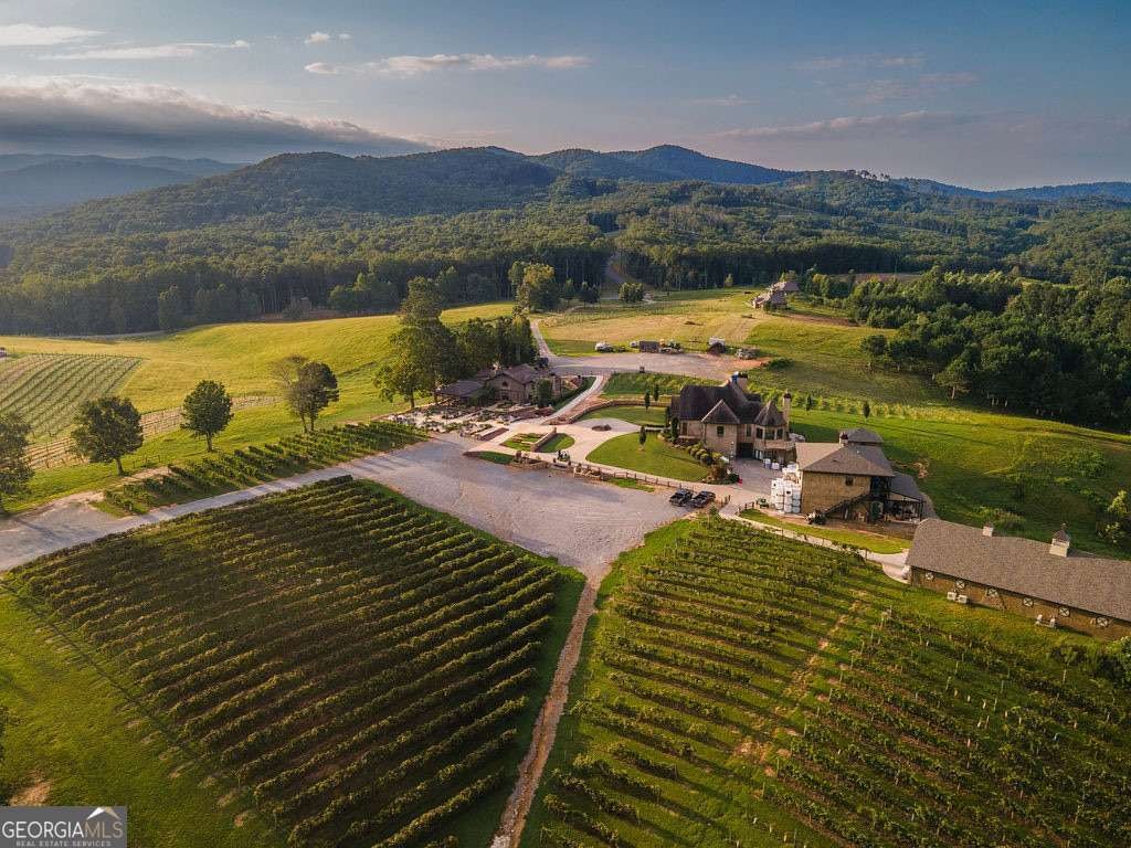 In the heart of North Georgia's wine country, where rolling pastureland meets picturesque mountain views, this extraordinary modern farmhouse estate sits on 9 scenic acres, offering a lifestyle as remarkable as the setting itself. Located within an exclusive 29-homesite community of estate-sized lots, the home is perfectly positioned to capture sweeping views of distant mountains, open pastureland, and the charm of vineyard life while providing generous space between neighbors and room to expand or further personalize the property over time. The beloved local winery, Chateau Meichtry, sits directly across from the community, offering the rare luxury of strolling over for an evening tasting while still returning home to the quiet beauty of the countryside. Built by renowned luxury builder Ron Lomonaco, celebrated for his signature modern rustic aesthetic and thoughtful craftsmanship, the home blends refined design with warm, inviting spaces meant to be lived in and shared. Inside, every detail has been carefully considered. A welcoming flex space just off the entry offers the perfect setting for a quiet sitting room, office, or reading retreat. The home then opens into a dramatic living room anchored by soaring vaulted ceilings and a striking rock fireplace, where expansive sliding doors frame the surrounding mountain views and seamlessly connect indoor living to the outdoors. The kitchen is both beautiful and highly functional, featuring sleek black cabinetry, elevated finishes, and a spacious walk-in pantry designed for effortless entertaining. Just beyond, a dedicated wine cellar provides the perfect place to showcase a curated collection fitting for a home surrounded by vineyards. The primary suite is a true sanctuary, offering breathtaking mountain views, a generous walk-in closet, and a beautifully appointed bath designed with both comfort and sophistication in mind. Outdoor living here is just as exceptional as the interior. A covered porch lined with classic swings invites slow mornings with coffee and peaceful evenings watching the sun dip behind the mountains. Beyond, the resort-style pool and pool house create a stunning backdrop for entertaining, complete with a built-in grill, luxury appliances, and a stylish bar that makes hosting effortless. Guests will enjoy complete privacy in the separate suite above the garage, creating the perfect space for extended visits. Offered fully furnished with locally sourced pieces, this home is truly move-in ready, allowing its next owner to step directly into the lifestyle it was designed for. With breathtaking scenery, a prime location within walking distance to a winery, and luxurious amenities throughout, the property also presents an incredible opportunity as a high-end vacation retreat or short-term rental in one of North Georgia's most sought-after destinations. A home where design, landscape, and lifestyle come together effortlessly and where the next chapter could begin the moment you arrive.