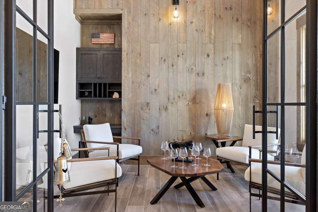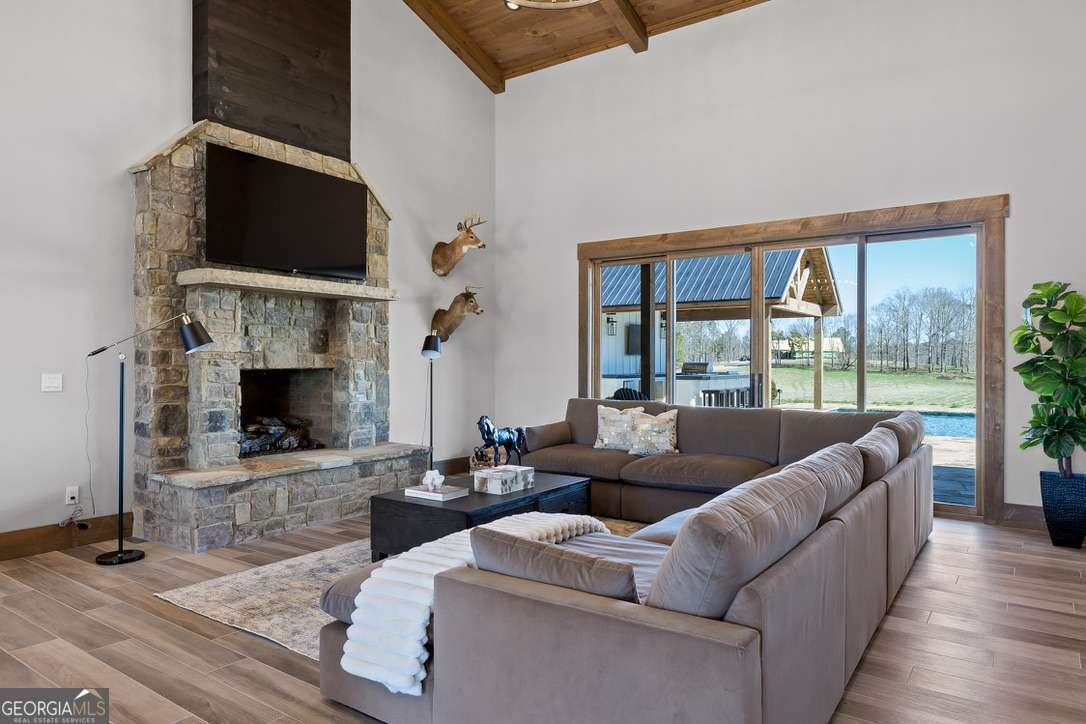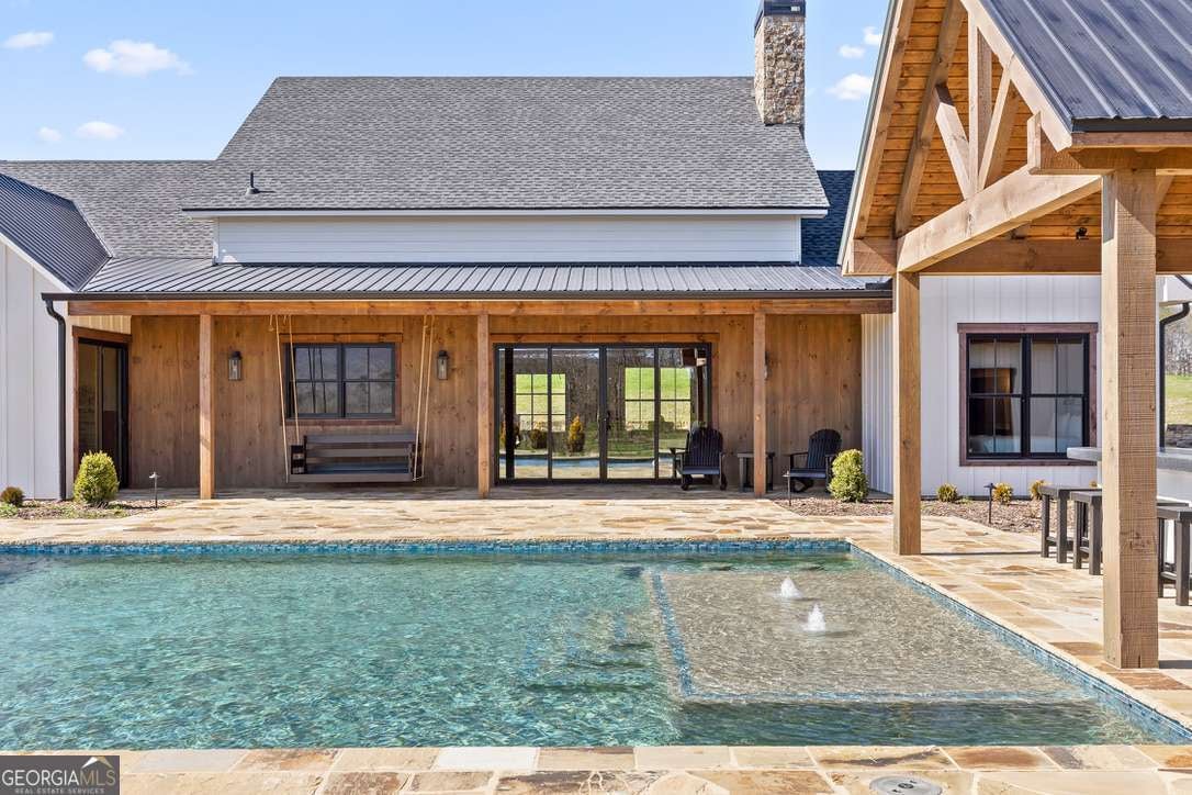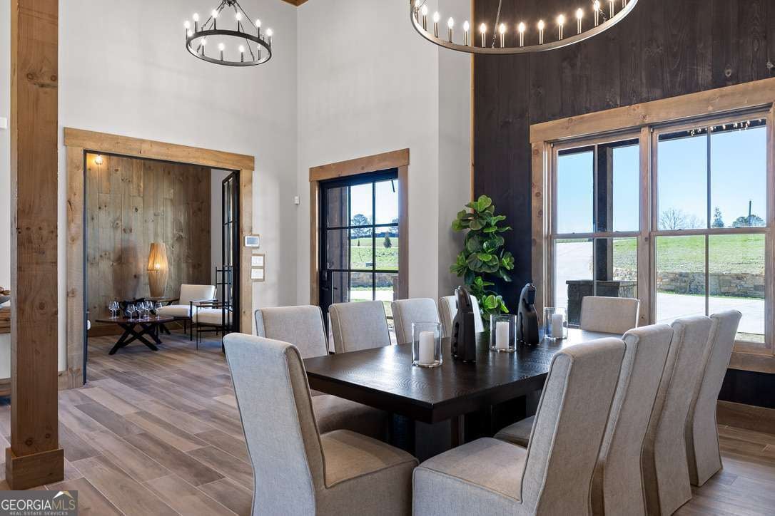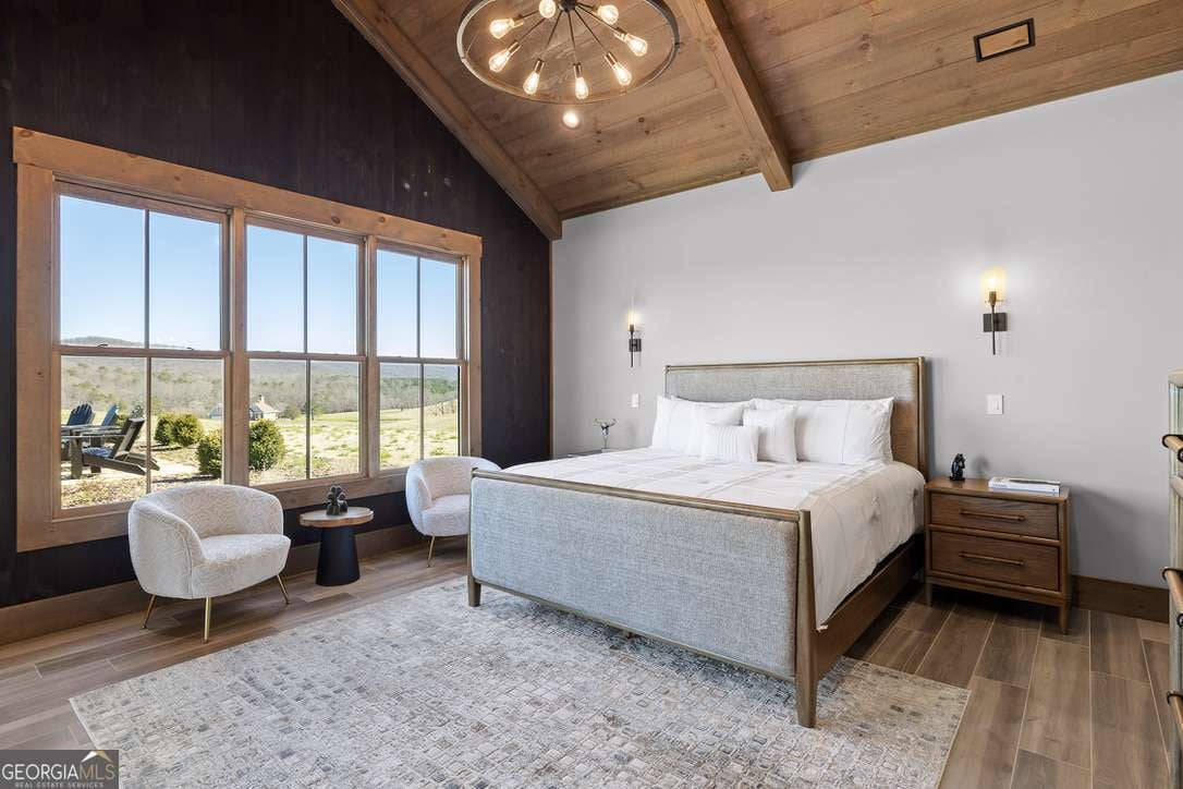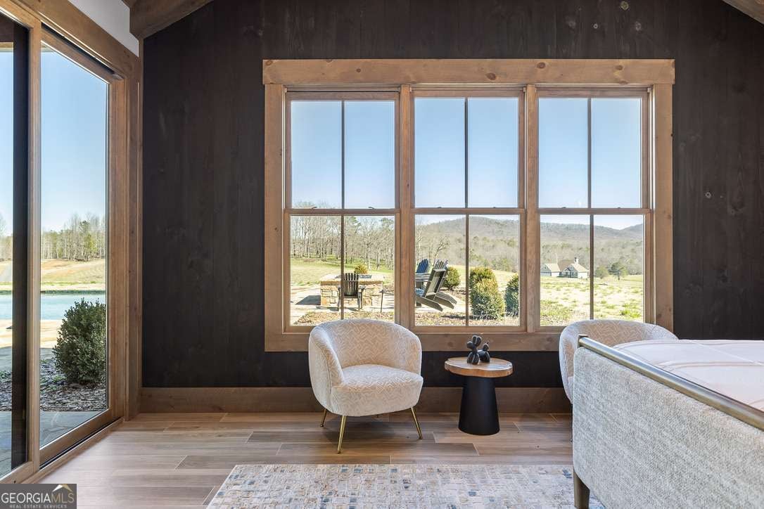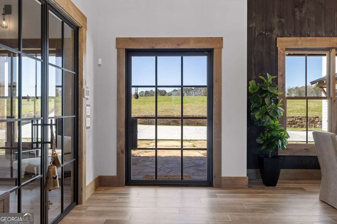 In the heart of North Georgia's wine country, where rolling pastureland meets picturesque mountain views, this extraordinary modern farmhouse estate sits on 9 scenic acres, offering a lifestyle as remarkable as the setting itself. Located within an exclusive 29-homesite community of estate-sized lots, the home is perfectly positioned to capture sweeping views of distant mountains, open pastureland, and the charm of vineyard life while providing generous space between neighbors and room to expand or further personalize the property over time. The beloved local winery, Chateau Meichtry, sits directly across from the community, offering the rare luxury of strolling over for an evening tasting while still returning home to the quiet beauty of the countryside. Built by renowned luxury builder Ron Lomonaco, celebrated for his signature modern rustic aesthetic and thoughtful craftsmanship, the home blends refined design with warm, inviting spaces meant to be lived in and shared. Inside, every detail has been carefully considered. A welcoming flex space just off the entry offers the perfect setting for a quiet sitting room, office, or reading retreat. The home then opens into a dramatic living room anchored by soaring vaulted ceilings and a striking rock fireplace, where expansive sliding doors frame the surrounding mountain views and seamlessly connect indoor living to the outdoors. The kitchen is both beautiful and highly functional, featuring sleek black cabinetry, elevated finishes, and a spacious walk-in pantry designed for effortless entertaining. Just beyond, a dedicated wine cellar provides the perfect place to showcase a curated collection fitting for a home surrounded by vineyards. The primary suite is a true sanctuary, offering breathtaking mountain views, a generous walk-in closet, and a beautifully appointed bath designed with both comfort and sophistication in mind. Outdoor living here is just as exceptional as the interior. A covered porch lined with classic swings invites slow mornings with coffee and peaceful evenings watching the sun dip behind the mountains. Beyond, the resort-style pool and pool house create a stunning backdrop for entertaining, complete with a built-in grill, luxury appliances, and a stylish bar that makes hosting effortless. Guests will enjoy complete privacy in the separate suite above the garage, creating the perfect space for extended visits. Offered fully furnished with locally sourced pieces, this home is truly move-in ready, allowing its next owner to step directly into the lifestyle it was designed for. With breathtaking scenery, a prime location within walking distance to a winery, and luxurious amenities throughout, the property also presents an incredible opportunity as a high-end vacation retreat or short-term rental in one of North Georgia's most sought-after destinations. A home where design, landscape, and lifestyle come together effortlessly and where the next chapter could begin the moment you arrive.