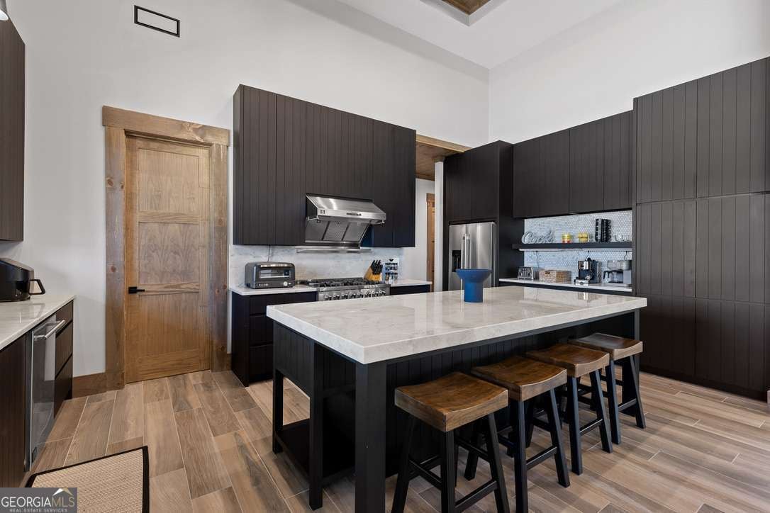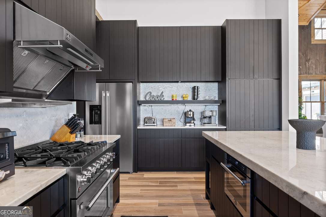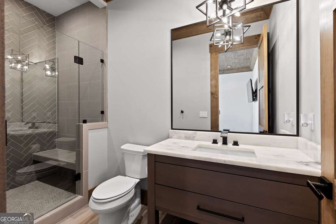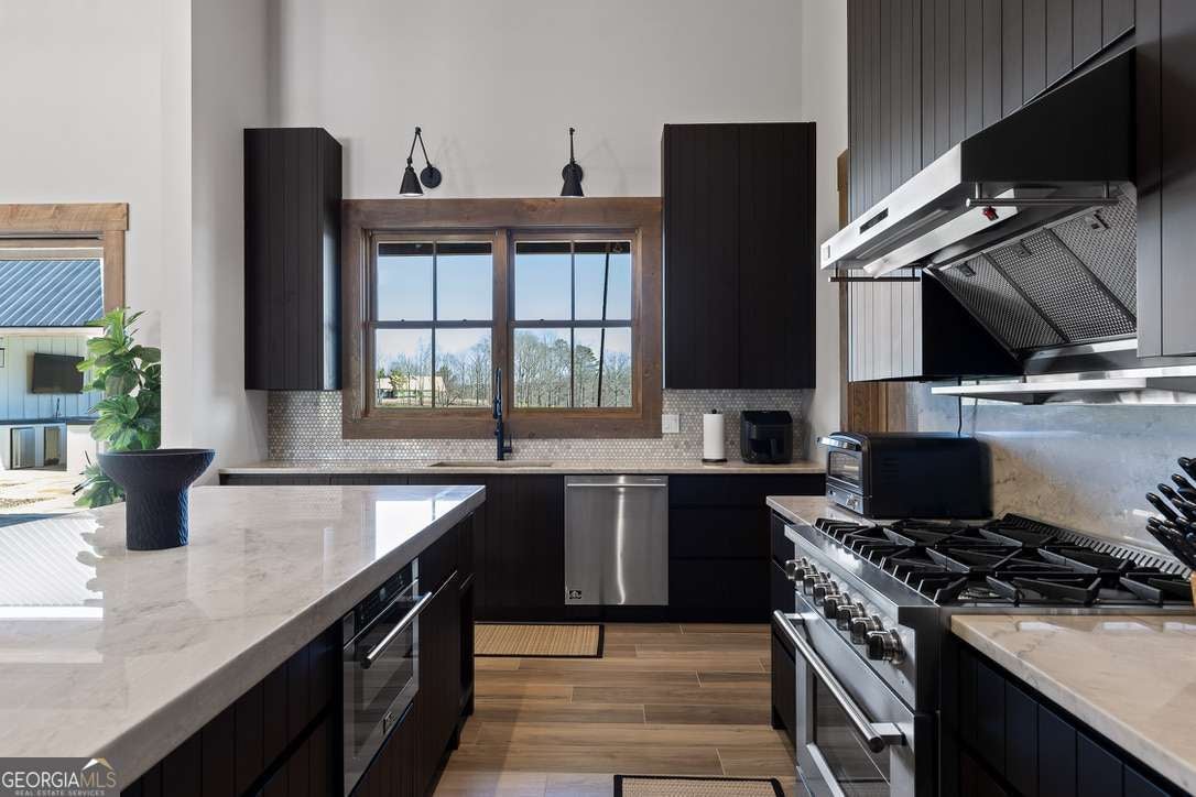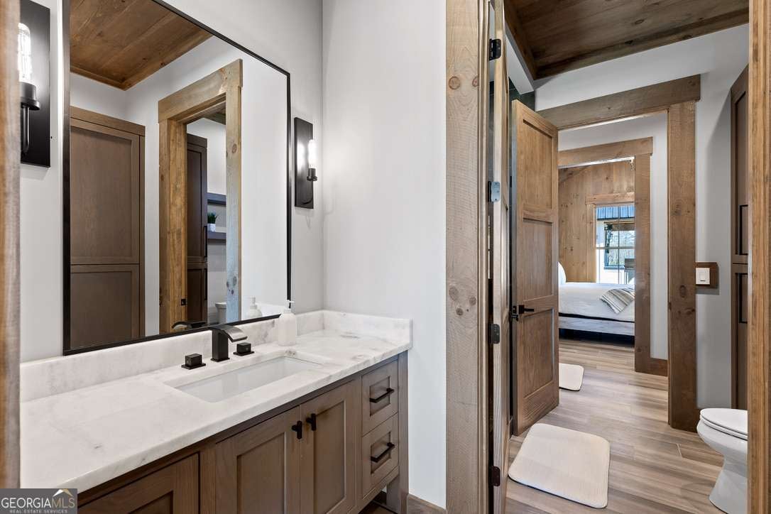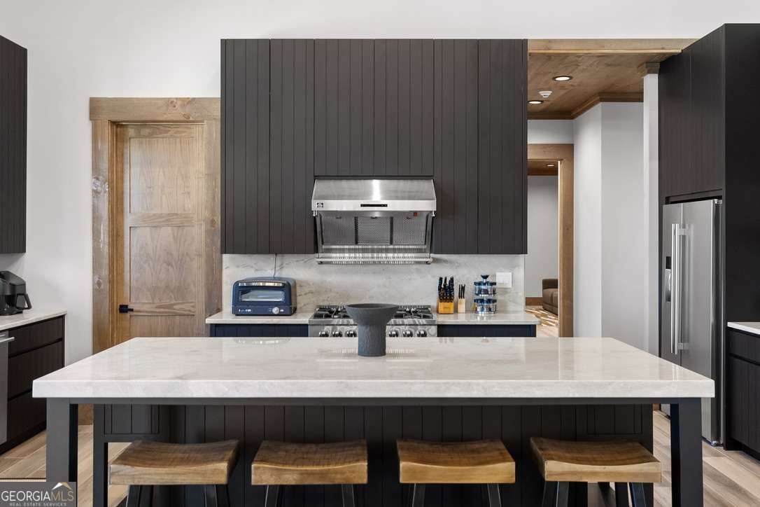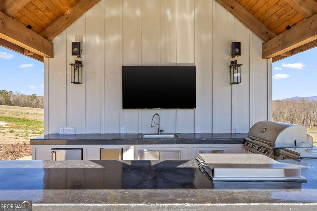 In the heart of North Georgia's wine country, where rolling pastureland meets picturesque mountain views, this extraordinary modern farmhouse estate sits on 9 scenic acres, offering a lifestyle as remarkable as the setting itself. Located within an exclusive 29-homesite community of estate-sized lots, the home is perfectly positioned to capture sweeping views of distant mountains, open pastureland, and the charm of vineyard life while providing generous space between neighbors and room to expand or further personalize the property over time. The beloved local winery, Chateau Meichtry, sits directly across from the community, offering the rare luxury of strolling over for an evening tasting while still returning home to the quiet beauty of the countryside. Built by renowned luxury builder Ron Lomonaco, celebrated for his signature modern rustic aesthetic and thoughtful craftsmanship, the home blends refined design with warm, inviting spaces meant to be lived in and shared. Inside, every detail has been carefully considered. A welcoming flex space just off the entry offers the perfect setting for a quiet sitting room, office, or reading retreat. The home then opens into a dramatic living room anchored by soaring vaulted ceilings and a striking rock fireplace, where expansive sliding doors frame the surrounding mountain views and seamlessly connect indoor living to the outdoors. The kitchen is both beautiful and highly functional, featuring sleek black cabinetry, elevated finishes, and a spacious walk-in pantry designed for effortless entertaining. Just beyond, a dedicated wine cellar provides the perfect place to showcase a curated collection fitting for a home surrounded by vineyards. The primary suite is a true sanctuary, offering breathtaking mountain views, a generous walk-in closet, and a beautifully appointed bath designed with both comfort and sophistication in mind. Outdoor living here is just as exceptional as the interior. A covered porch lined with classic swings invites slow mornings with coffee and peaceful evenings watching the sun dip behind the mountains. Beyond, the resort-style pool and pool house create a stunning backdrop for entertaining, complete with a built-in grill, luxury appliances, and a stylish bar that makes hosting effortless. Guests will enjoy complete privacy in the separate suite above the garage, creating the perfect space for extended visits. Offered fully furnished with locally sourced pieces, this home is truly move-in ready, allowing its next owner to step directly into the lifestyle it was designed for. With breathtaking scenery, a prime location within walking distance to a winery, and luxurious amenities throughout, the property also presents an incredible opportunity as a high-end vacation retreat or short-term rental in one of North Georgia's most sought-after destinations. A home where design, landscape, and lifestyle come together effortlessly and where the next chapter could begin the moment you arrive.
