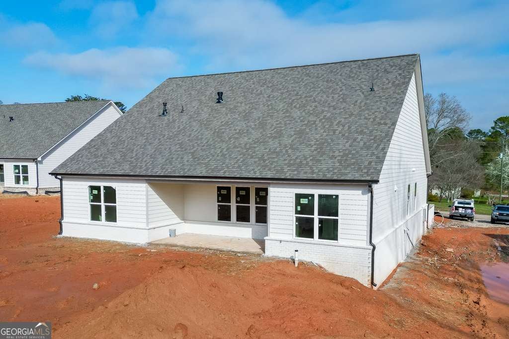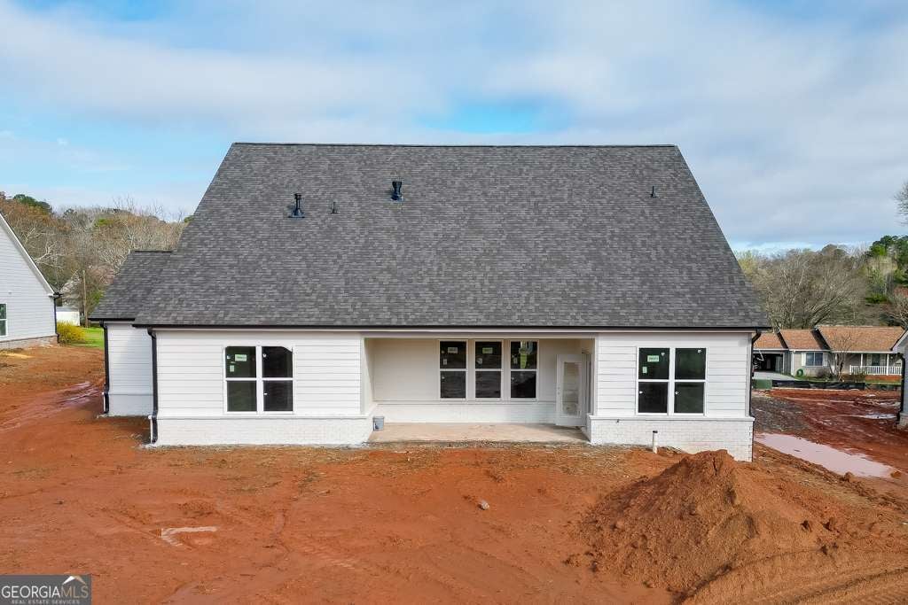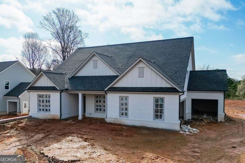 The Rosewood plan by Pioneer South Homes is a thoughtfully designed 4-bedroom, 3-bath Craftsman-style ranch with a 3-car garage. Offering modern living and craftsmanship at its finest. Enter through the welcoming covered front porch into the foyer, featuring two secondary bedrooms, two bathrooms, and a versatile flex room-perfect for a formal dining room or home office. The open-concept layout showcases a spacious family room with coffer ceilings that flows seamlessly into the upgraded kitchen, complete with 42" shaker-style upper cabinets, an oversized island with custom quartz countertops farmhouse sink, and stainless-steel appliances. The dining/breakfast area leads to a covered rear porch with a gas stub, ideal for grilling, entertaining, and year-round outdoor enjoyment. A separate hallway at the rear of the home leads to the oversized primary suite, featuring a luxurious bath with double-vanity quartz countertops, a soaking tub, glass-enclosed shower, and an expansive walk-in closet. Mudroom with lockers and access to the laundry room. The second level offers a spacious additional bedroom or private media room, providing flexible living space. Situated on a .80-acre lot with no HOA, this home offers both privacy and room to enjoy. Conveniently located near Braselton, Hoschton, and Flowery Branch, with walkable access to Platt Park.