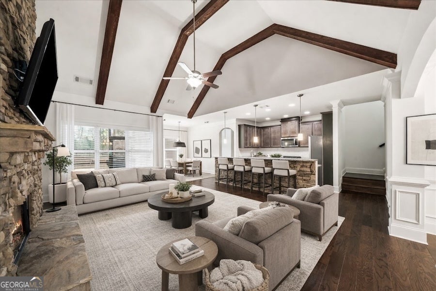Master on Main in The Georgian with Private Backyard and Guest Suite - Resort-Style Golf Community Living. Beautifully maintained 4-bedroom, 3-bath Craftsman home located in the highly sought-after The Georgian in Villa Rica, Georgia. This open-concept floor plan features hardwood floors, abundant natural light, and a dramatic floor-to-ceiling stone fireplace that anchors the main living space. The spacious kitchen includes a large island, breakfast nook, and updated stainless steel appliances-perfect for everyday living and entertaining. The owner's suite on the main level offers comfort and convenience with a full bath and oversized walk-in closet. Two additional bedrooms are also located on the main floor. Upstairs, a private fourth bedroom with a full bath creates the ideal guest suite, teen retreat, or in-law suite. Enjoy relaxing or entertaining in the covered and enclosed patio with tongue-and-groove ceiling, overlooking a private backyard that provides a peaceful outdoor setting. Additional highlights include a formal dining room with coffered ceiling, main-level laundry room, and an EV charger-capable garage. Residents of The Georgian enjoy resort-style amenities including an 18-hole championship golf course designed by Tom Fazio, water park and pool, tennis and basketball courts, playgrounds, walking trails, and an elegant clubhouse. Conveniently located minutes from shopping and dining in Villa Rica, Hiram, and Douglasville, with easy access to Interstate 20. Experience the perfect blend of comfort, privacy, and resort-style amenities in one of the area's most desirable golf course communities.