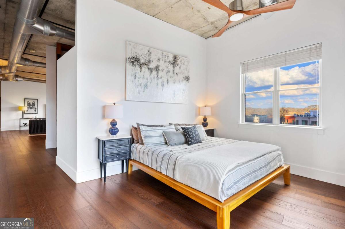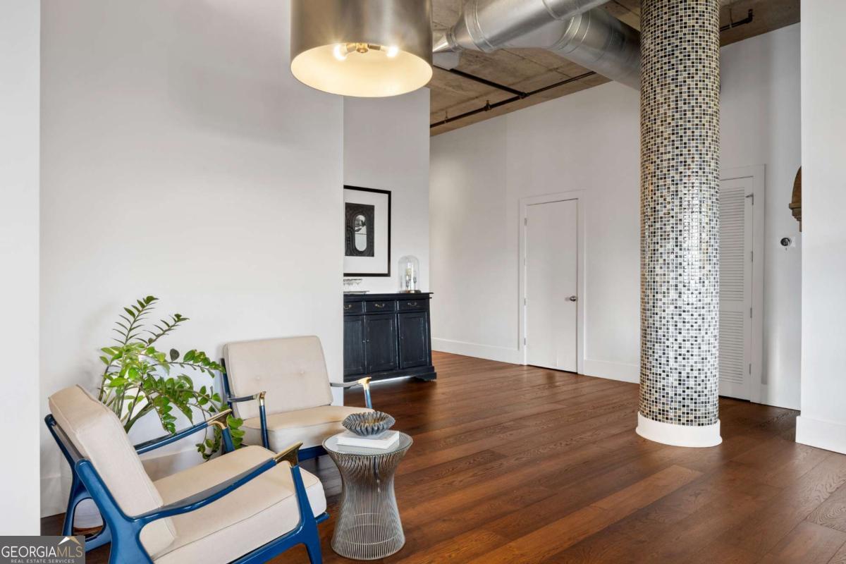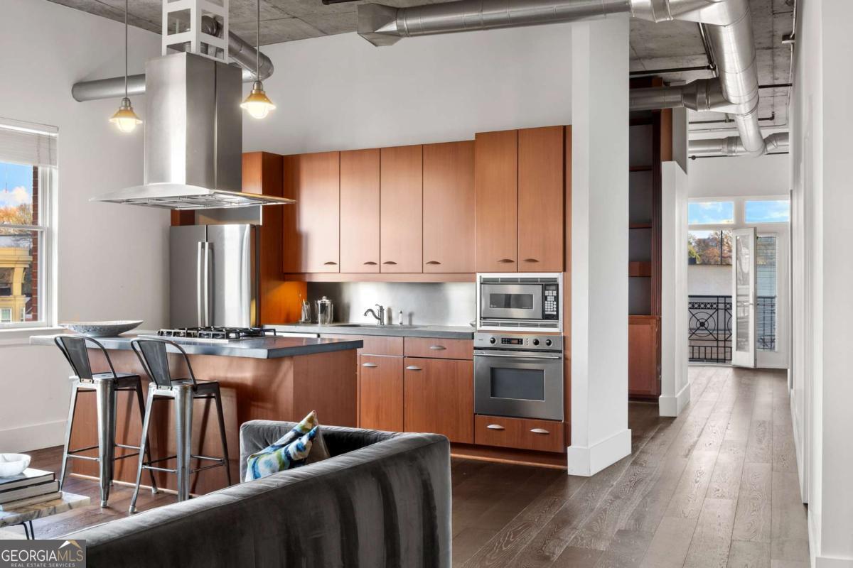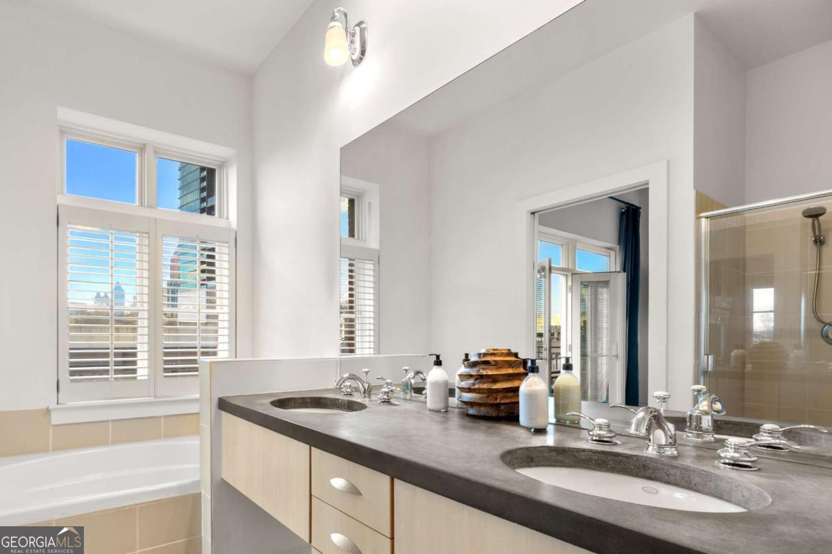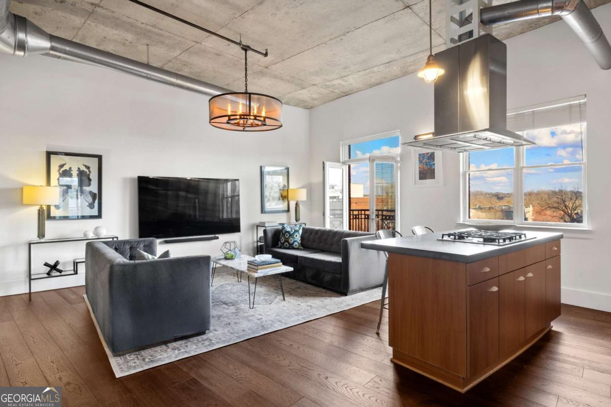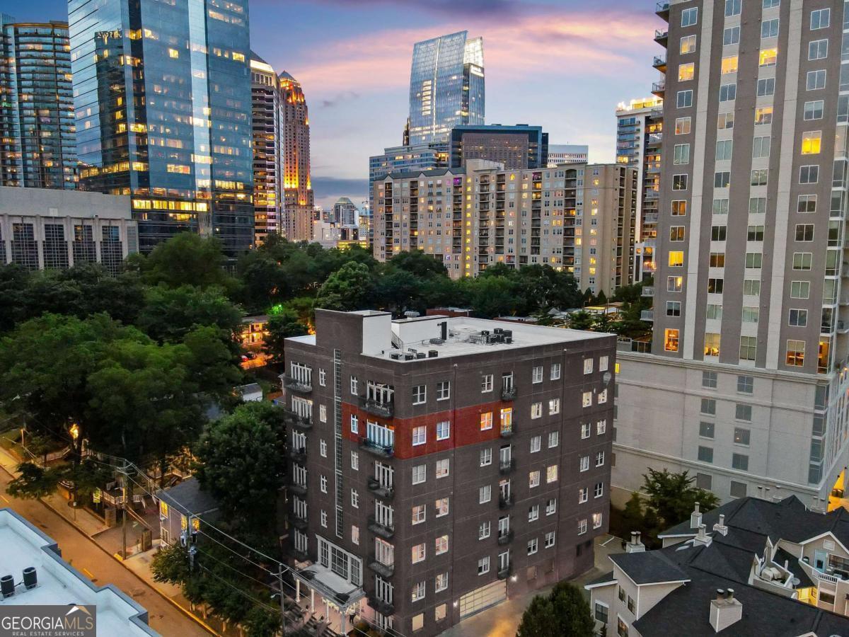 Perfectly positioned just one block from Piedmont Park, this striking corner loft offers a rare opportunity to experience authentic Midtown loft living with panoramic park and skyline views. Set within one of Midtown's most coveted boutique loft buildings, the residence blends industrial architecture, natural light, and walkable city lifestyle in a way that few homes in Atlanta can offer. Occupying the highly sought-after southeast corner, the home is filled with beautiful natural light from sunrise through late afternoon. Two private balconies extend the living space outdoors, framing unobstructed views of Piedmont Park's treetops and the Atlanta skyline-an exceptionally rare vantage point that brings the energy of the city together with the tranquility of green space. Inside, the residence showcases true loft architecture, where scale, light, and texture define the living experience. Soaring 11.5-foot exposed concrete ceilings, exposed ductwork, and newly refinished hardwood floors create a bold architectural canvas, while expansive windows flood the interiors with natural light and open views in every direction. The result is a living space that feels both dramatic and effortlessly livable-equally suited for quiet mornings overlooking the park or evenings entertaining guests. At the center of the home, the kitchen is thoughtfully designed to balance form and function. Poured-in-place concrete countertops, premium SieMatic cabinetry, and a generous island with gas range create a refined yet industrial aesthetic consistent with the loft's architectural character. A full suite of Bosch appliances, including a gas stove, dishwasher, and refrigerator, along with a GE microwave, provides modern performance within a beautifully streamlined design. The primary suite serves as a peaceful retreat above the city, where French doors open directly onto a private balcony overlooking Piedmont Park. Morning light filters through the trees while the skyline rises beyond, creating a uniquely serene Midtown setting. The ensuite bath features a double vanity and whirlpool tub, offering comfort and privacy within the suite. The secondary bedroom offers exceptional versatility and is enhanced by custom built-ins and a Murphy bed, allowing the space to easily transition between guest accommodations, office, or creative studio. A full laundry room with new front-loading washer and dryer adds everyday convenience-an amenity rarely found in Midtown condominium living. The residence is located within an intimate 24-residence boutique building, where this home is one of only four two-bedroom residences, creating a level of exclusivity seldom found in Midtown. With two balconies, authentic loft architecture, and uninterrupted park views just steps from Piedmont Park, the home offers a lifestyle that seamlessly blends urban energy with natural beauty. Furniture is negotiable, presenting the opportunity for a turnkey Midtown retreat in one of Atlanta's most walkable and vibrant neighborhoods.