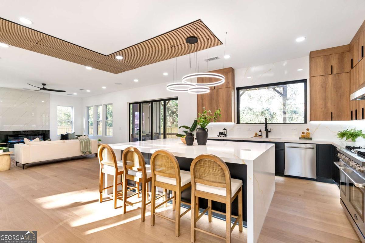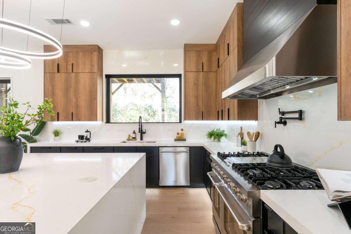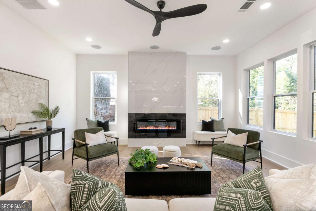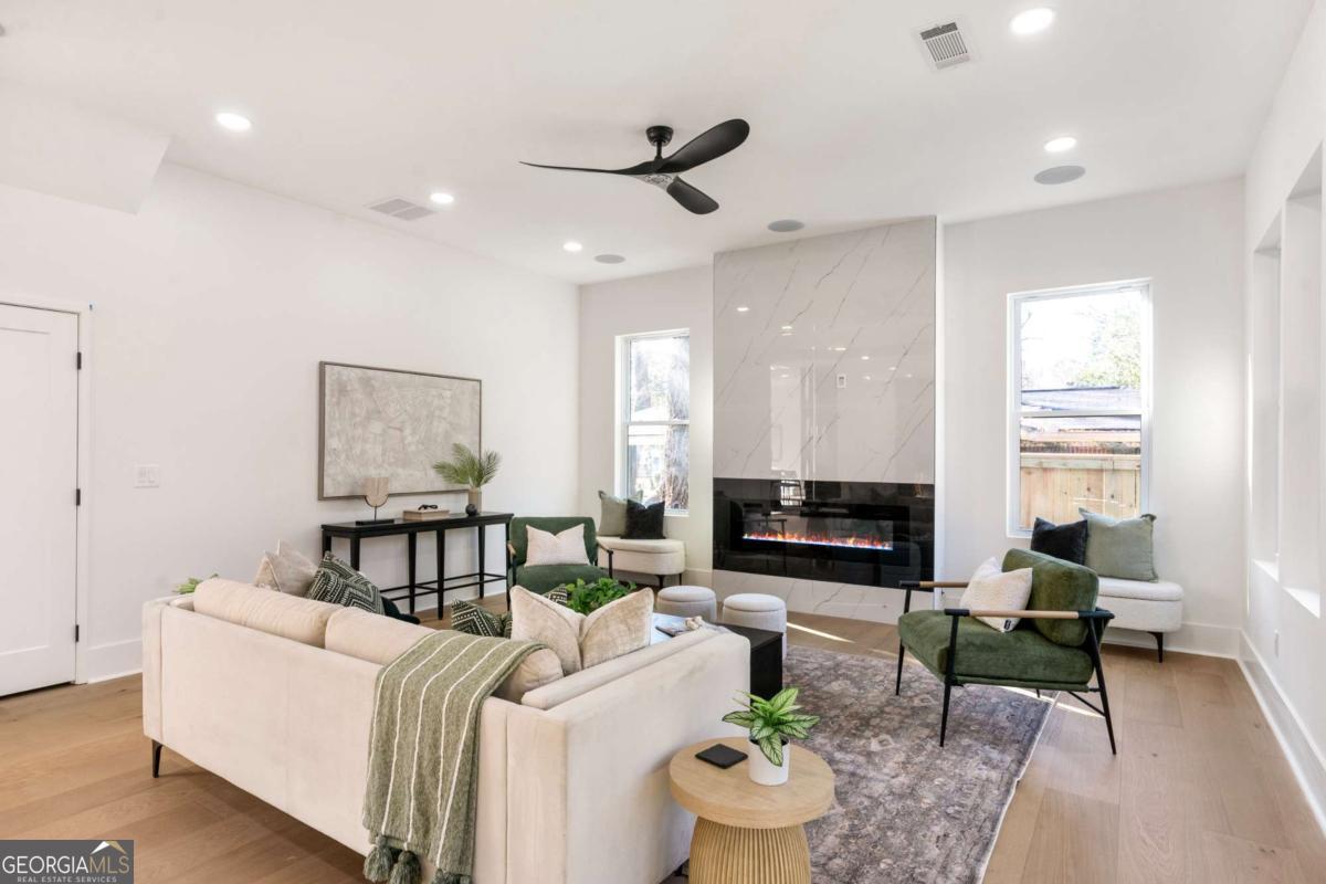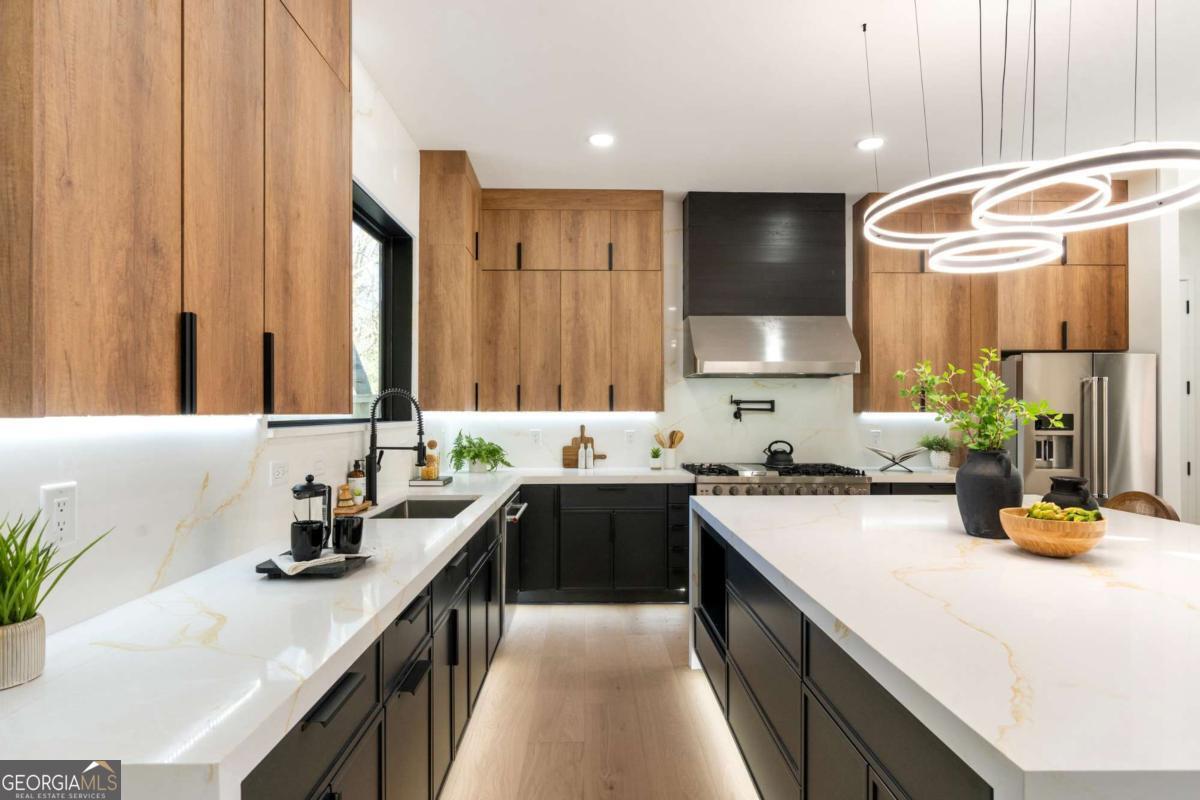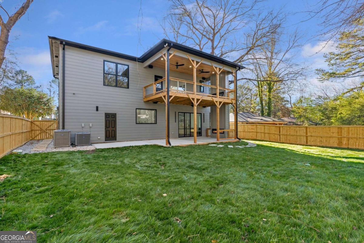 Stunning new construction home just minutes from East Lake Golf Club offering 4 bedrooms and 3.5 bathrooms, thoughtfully designed with high-end finishes and modern functionality throughout. The open-concept main level features hardwood flooring, designer lighting, and two-way recessed lighting that creates a warm, elevated ambiance. The chef's kitchen is a showstopper with a large quartz island equipped with built-in charging stations, under-cabinet lighting, a 6-burner gas range with griddle and double ovens, pot filler, and custom cabinetry. Bifold doors seamlessly connect the indoor living space to a patio with a fireplace, perfect for entertaining. The oversized primary suite is a private retreat featuring custom accent walls, a fireplace, Bluetooth speakers, and a private deck with access to a shared deck. The spa-inspired ensuite bathroom showcases double vanities with sconce lighting, backlit mirrors, floor-to-ceiling tile, an expanded double shower, soaker tub, and a separate water closet. Additional highlights include encased wine storage, Bluetooth speakers both indoors and out, two decks + patio, four fireplaces, glass-view railing at the upper-level sitting area, and tiled bathrooms. The fenced backyard adds privacy, while the two-car tandem garage includes EV chargers for modern convenience. This exceptional home blends luxury, comfort, and cutting-edge design in every detail.