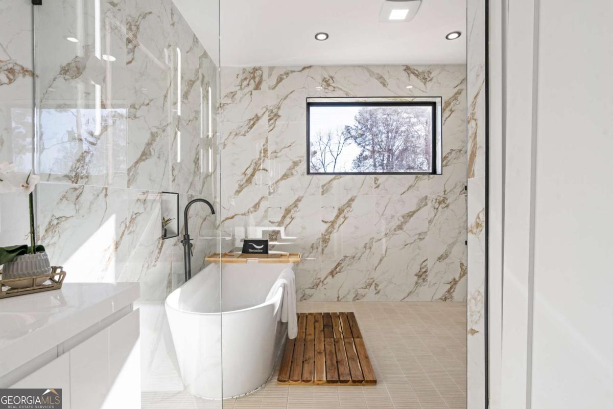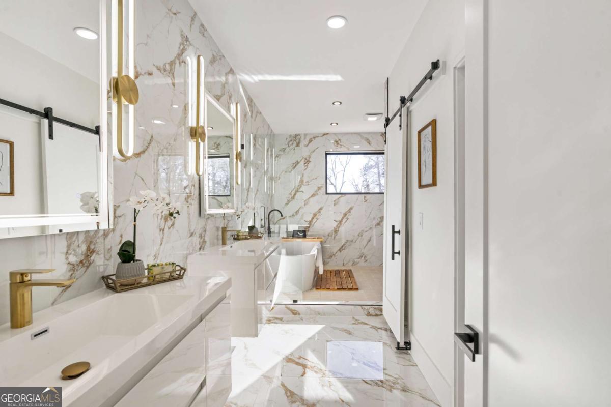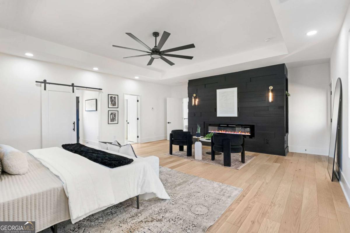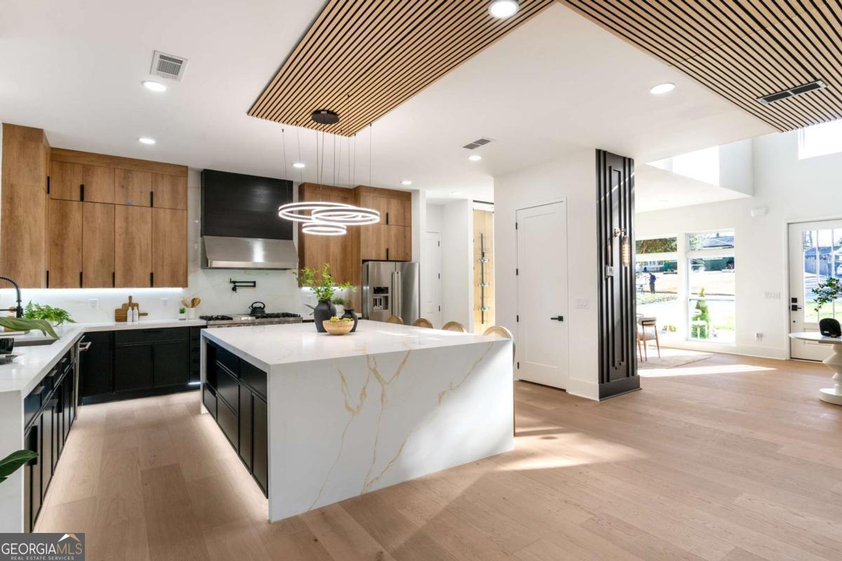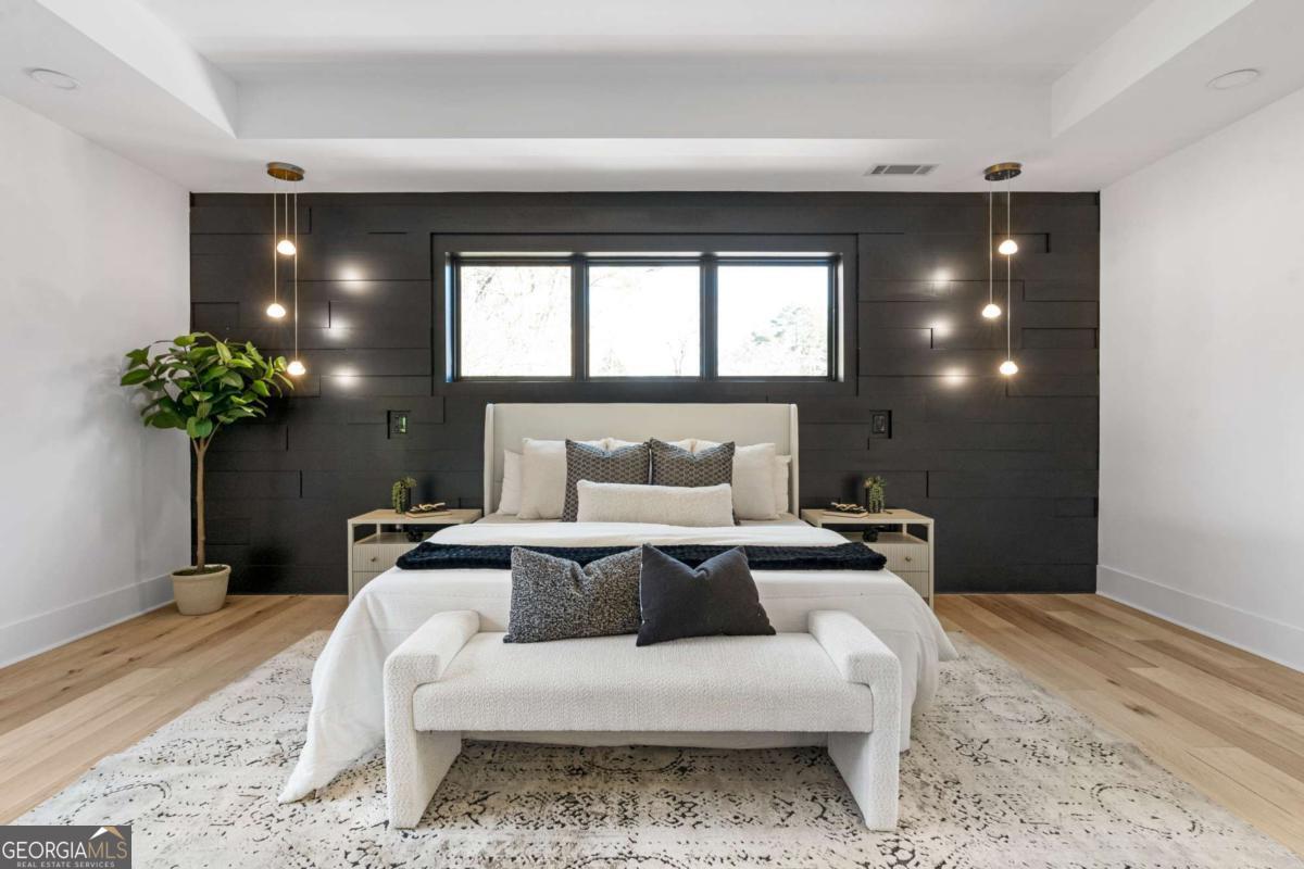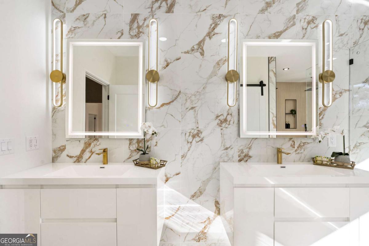 Stunning new construction home just minutes from East Lake Golf Club offering 4 bedrooms and 3.5 bathrooms, thoughtfully designed with high-end finishes and modern functionality throughout. The open-concept main level features hardwood flooring, designer lighting, and two-way recessed lighting that creates a warm, elevated ambiance. The chef's kitchen is a showstopper with a large quartz island equipped with built-in charging stations, under-cabinet lighting, a 6-burner gas range with griddle and double ovens, pot filler, and custom cabinetry. Bifold doors seamlessly connect the indoor living space to a patio with a fireplace, perfect for entertaining. The oversized primary suite is a private retreat featuring custom accent walls, a fireplace, Bluetooth speakers, and a private deck with access to a shared deck. The spa-inspired ensuite bathroom showcases double vanities with sconce lighting, backlit mirrors, floor-to-ceiling tile, an expanded double shower, soaker tub, and a separate water closet. Additional highlights include encased wine storage, Bluetooth speakers both indoors and out, two decks + patio, four fireplaces, glass-view railing at the upper-level sitting area, and tiled bathrooms. The fenced backyard adds privacy, while the two-car tandem garage includes EV chargers for modern convenience. This exceptional home blends luxury, comfort, and cutting-edge design in every detail.
