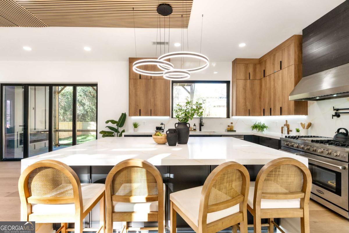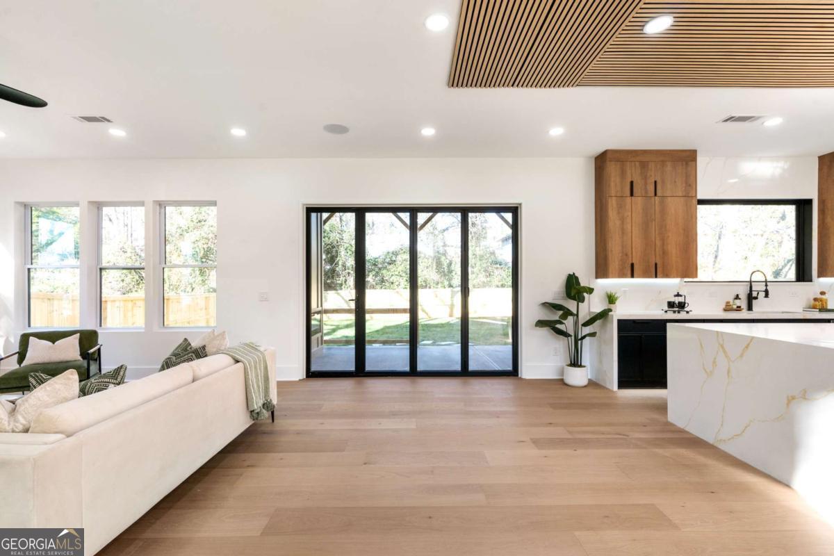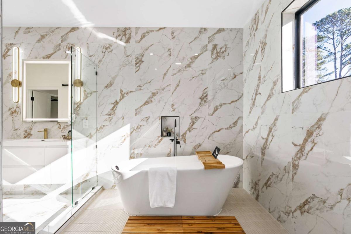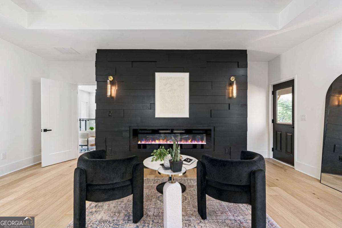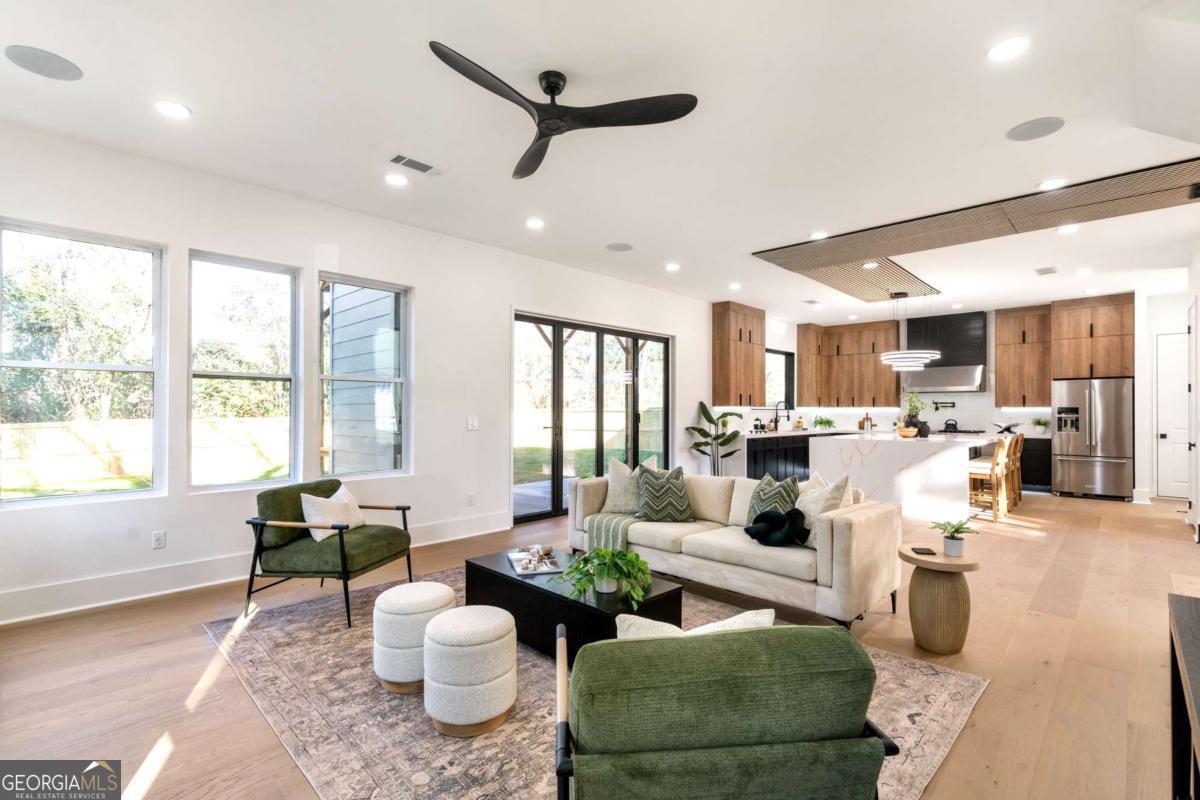 Stunning new construction home just minutes from East Lake Golf Club offering 4 bedrooms and 3.5 bathrooms, thoughtfully designed with high-end finishes and modern functionality throughout. The open-concept main level features hardwood flooring, designer lighting, and two-way recessed lighting that creates a warm, elevated ambiance. The chef's kitchen is a showstopper with a large quartz island equipped with built-in charging stations, under-cabinet lighting, a 6-burner gas range with griddle and double ovens, pot filler, and custom cabinetry. Bifold doors seamlessly connect the indoor living space to a patio with a fireplace, perfect for entertaining. The oversized primary suite is a private retreat featuring custom accent walls, a fireplace, Bluetooth speakers, and a private deck with access to a shared deck. The spa-inspired ensuite bathroom showcases double vanities with sconce lighting, backlit mirrors, floor-to-ceiling tile, an expanded double shower, soaker tub, and a separate water closet. Additional highlights include encased wine storage, Bluetooth speakers both indoors and out, two decks + patio, four fireplaces, glass-view railing at the upper-level sitting area, and tiled bathrooms. The fenced backyard adds privacy, while the two-car tandem garage includes EV chargers for modern convenience. This exceptional home blends luxury, comfort, and cutting-edge design in every detail.