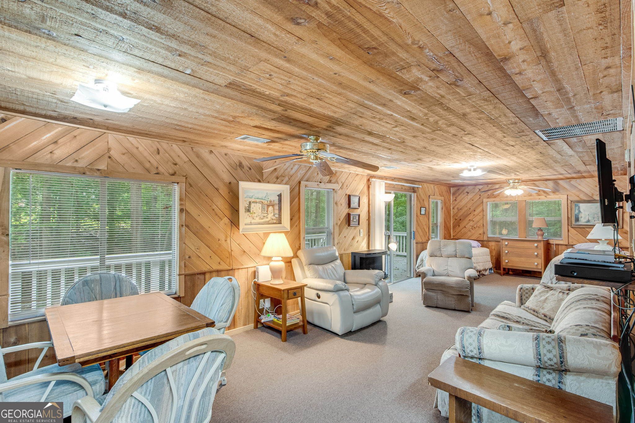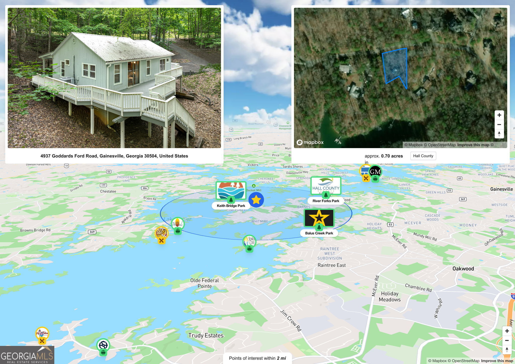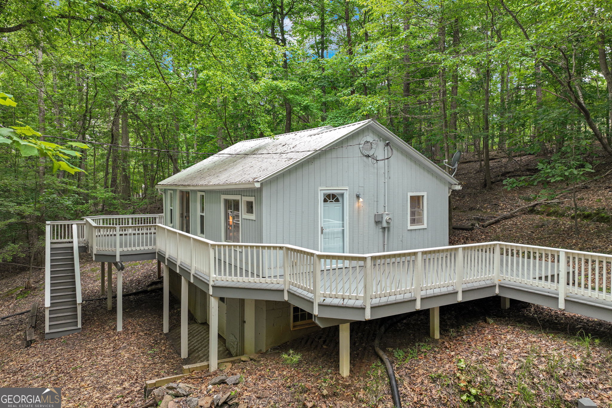 This charming 1 bedroom, 1 bath lakefront cottage offers the perfect amount of peaceful privacy for a weekend escape. Tucked away on a wooded .70-acre lot with seasonal lake views, this home includes a 16' x 24' platform dock with deep water access and a very gentle walk to the shoreline. The open-concept layout features warm wood-planked walls and ceilings throughout. Enjoy outdoor living on the expansive deck, perfect for entertaining or relaxing in the natural surroundings. The unfinished basement offers ample storage or potential for additional living space, and the home is permitted for 2 bedrooms, offering room to expand. This property offers incredible potential in a tranquil lakefront setting! Conveniently located to I-985, GA 400, Gainesville, and Dawsonville.